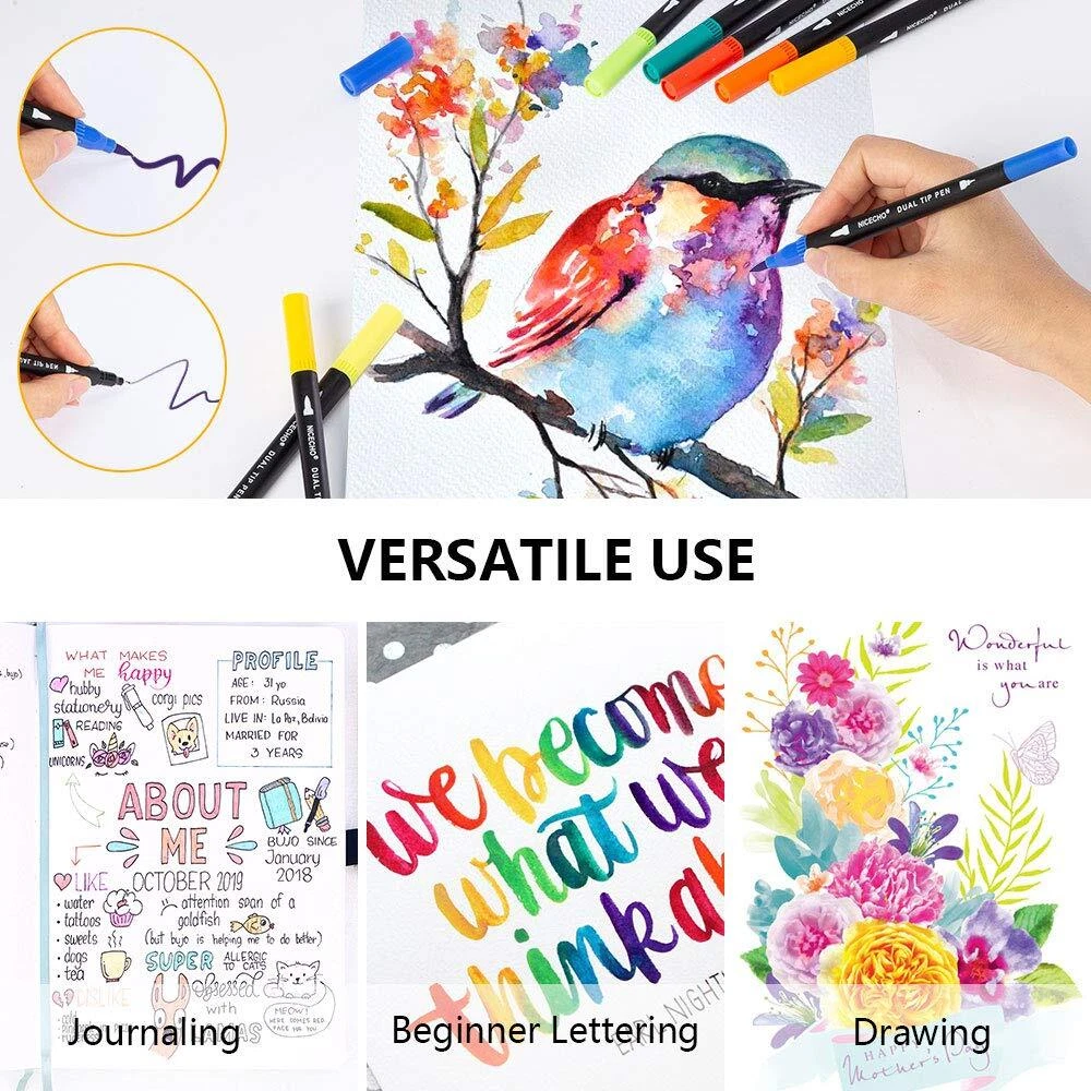 CONVENIENT, STURDY DUAL TIPS: With 2 different tips to choose from, you have an infinitely wider array of coloring styles at your disposal! 0.4mm fine tip is great for sketch outlining & details; 1-4mm soft brush tip for shading and quickly color in large areas art project. Double Tips, Double Fun! 60 UNIQUE COLORS OPTIONS: You'll never run out of possibilities or color options with this deluxe coloring markers set. Each set Includes 60 vibrant primary and complementary colors, NO duplicate. And blend beautifully for added dimension to your artwork, and create one you never have before. SMOOTH, VERSATILE USE: With nicely pigmented ink, there are many ways you can use Nicecho dual brush marker set, from everyday uses to extended creativity sessions! Those coloring pens are smooth for drawing, adult coloring book, calligraphy, journaling, lettering, alendar, card making and more. WELL PACKED & GREAT GIFT: Our dual tip pens comes with a durable carrying case which have pen slots to organize all your colors. If you know someone who's artistically inclined in your life, this is a thoughtful gift that will keep on giving. It’s also a perfect art supplier for kids over 3 years old. SAFE & NONTOXIC INK: No need to worry about ink getting on your skin again. Those coloring book markers are completely non-toxic, and can be wash off easily with water. Please keep caps tight after every use. We are here for any products issue as you need.