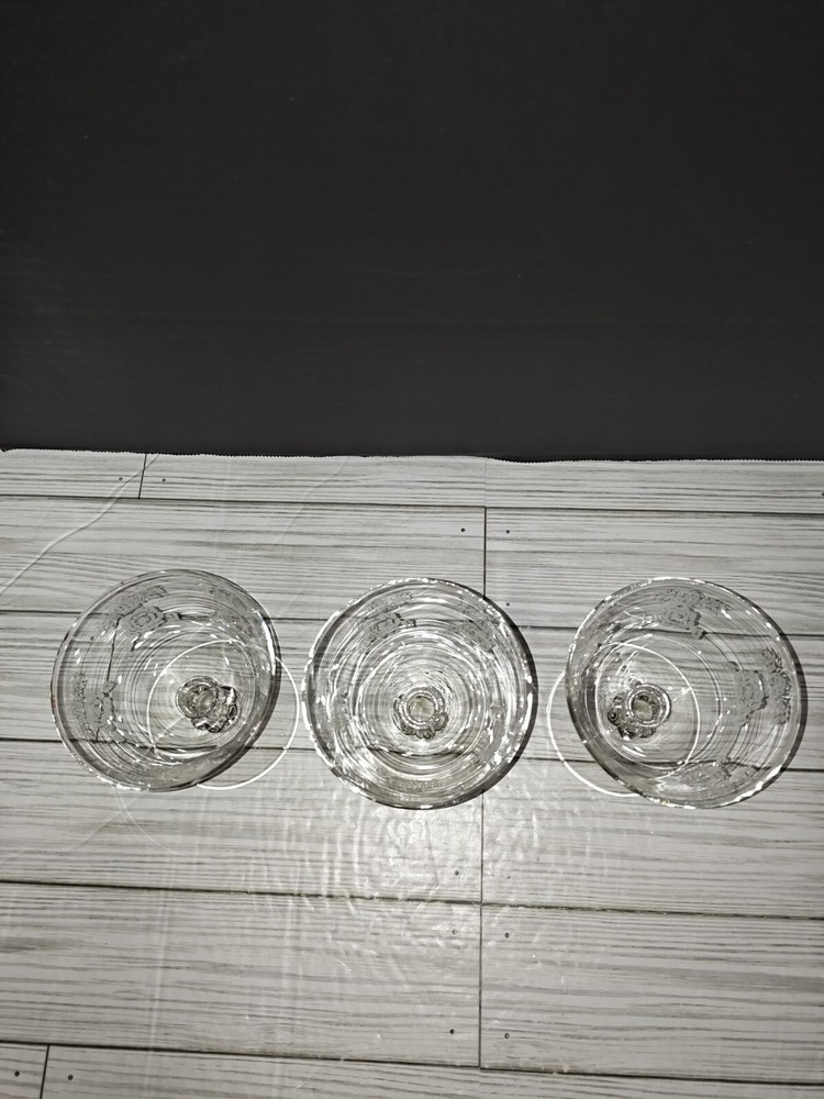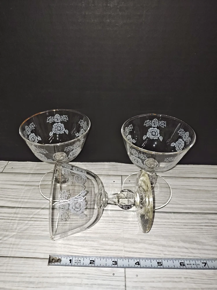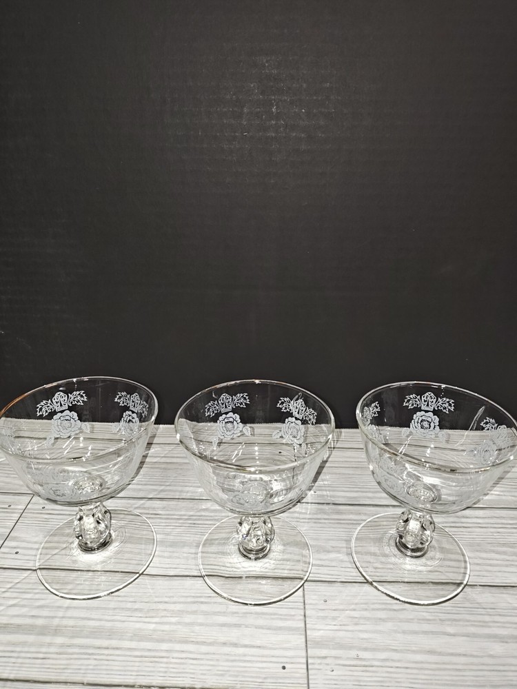 Art Nouveau Floral Design Glass Champagne Sherbet Coupe Goblets Set of 3. Has wear from age use and storage. See pictures. Sold as is.