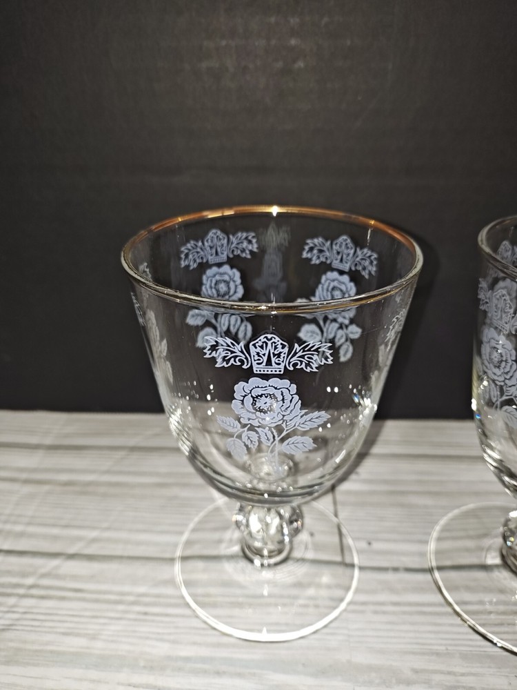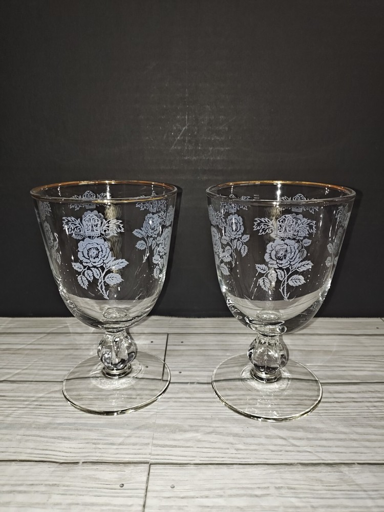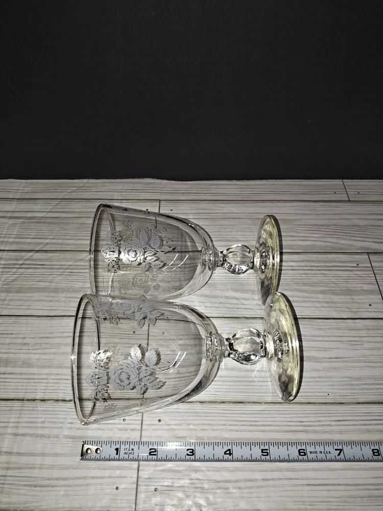 Art Nouveau Floral Design Glass Champagne Wine Coupe Goblets Set of 2. They have wear from age use and storage. See pictures. Sold as is.