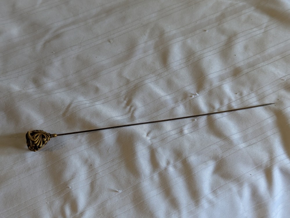 Fabulous antique art nouveau yellow gold plated hat pin. It would have had a stone at the top at one time that is no longer present. It measures approx. 9" long. We combine shipping costs! Please ask questions! Priority Mail and Ground Advantage now includes up to $100 of insurance. Check out my store! You will find clothing, handbags, jewelry, antiques and collectibles – even some stuff for the kids! Item comes from a smoke free, pet free home. Email me if you have any questions! Thanks for looking! A note about feedback: If you are planning to award less than five stars for any of the categories, please email me and let me know if there is an issue. I do my best to start items at the lowest possible price and provide great service. The rating system is how eBay charges the sellers our fees – so it is very important to us! Also, regarding shipping fees, I have no handling fees. The tracking number for your package inside the USA will be emailed to you. International and APO buyers are welcome and shipping is handled thru eBay. I do not end auction items early – ever!! It is not fair to everyone else, so please do not ask! Returns: Please measure your favorite fitting pieces of clothing in your closet and compare the measurements to the listing. If an item does not fit, it is not eligible for return. I do not refund shipping costs. If I have missed something or have grossly misrepresented an item, please contact me through the eBay email system and I will happily consider your item for a refund. Sign up for my newsletter! You will receive updates on new things in my store!