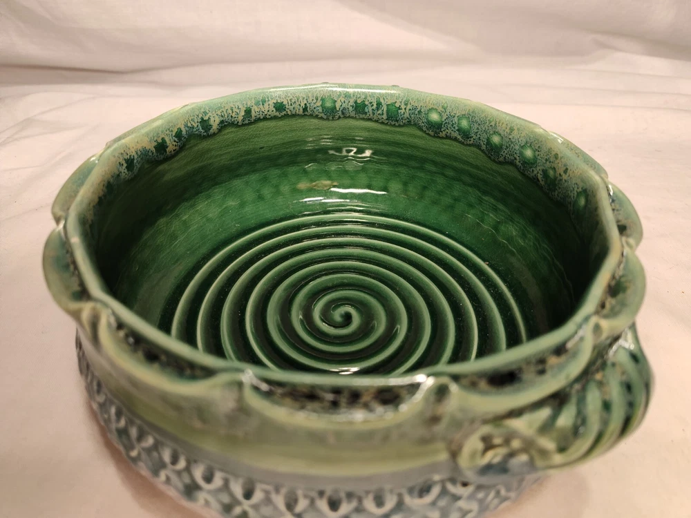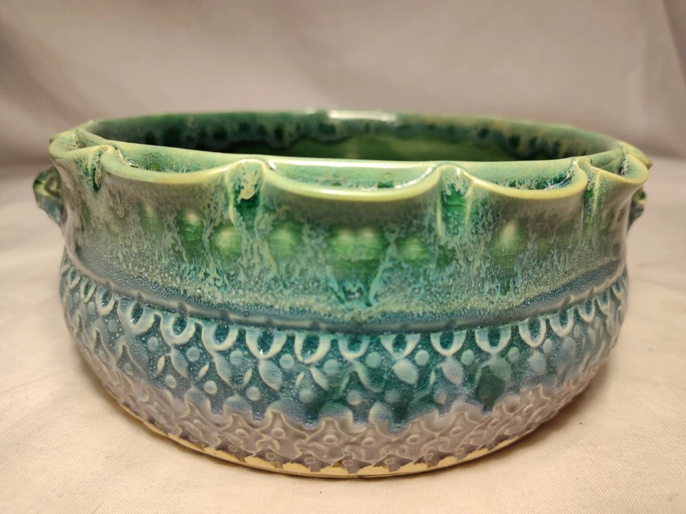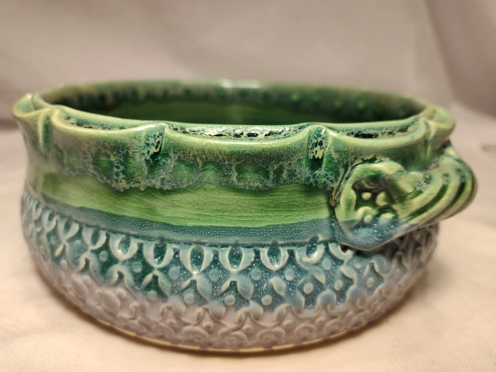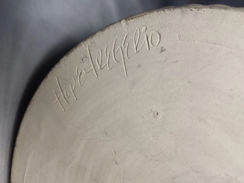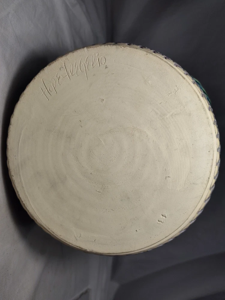 Earthen Clay Pot 7" Pottery Vintage North Carolina USA Wonderful handmade pot with raised relief and a beautiful combination of colors and patterns. The artist Hope Fregerio hails from Charlotte North Carolina. The pot measures just over 7 inches in diameter and 3 inches tall. Signed on base.
