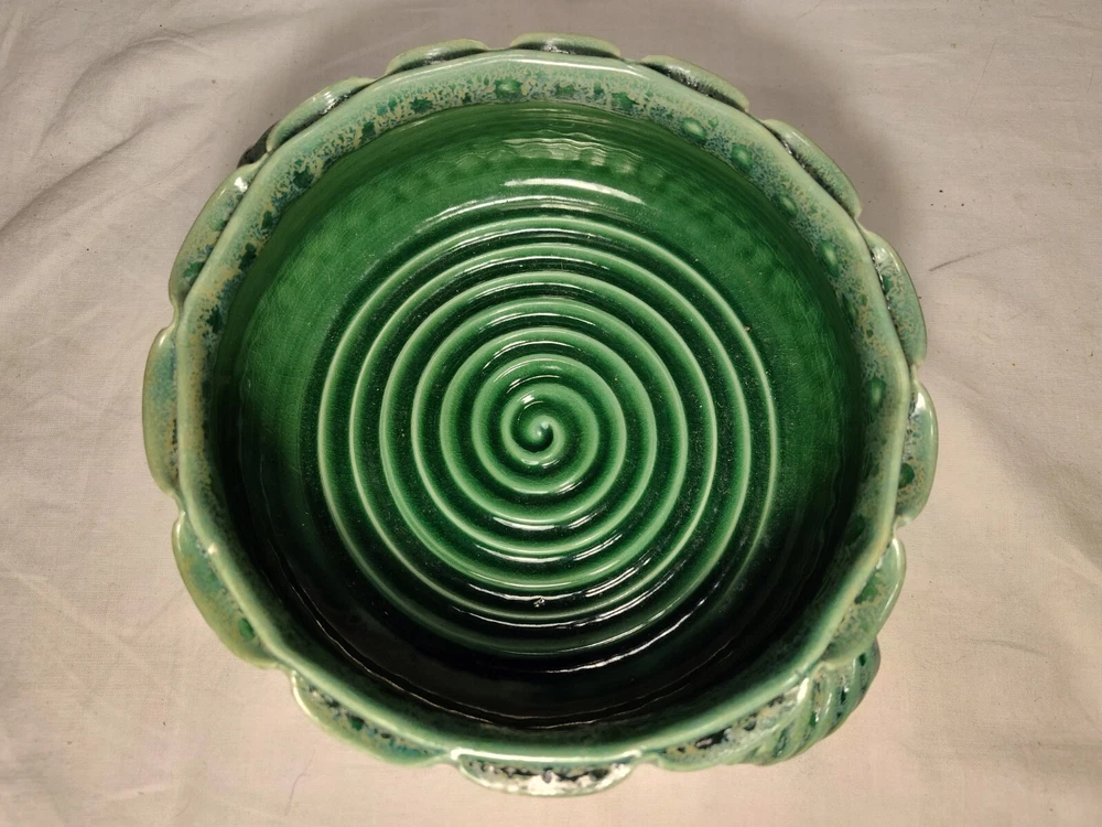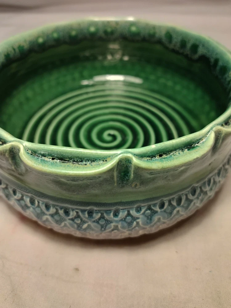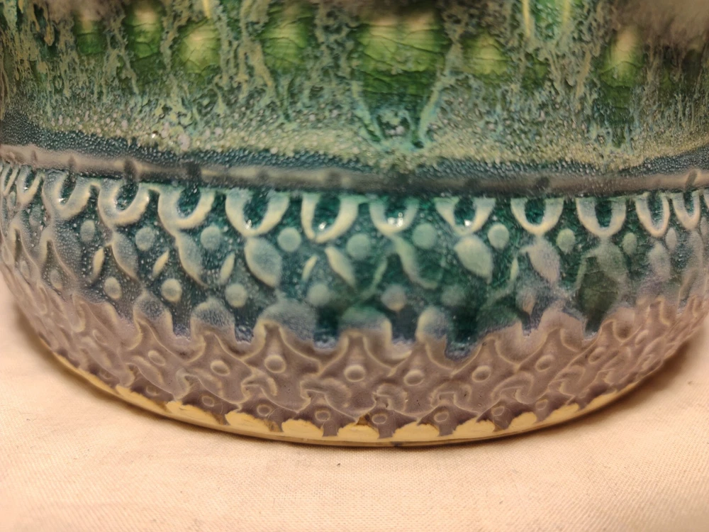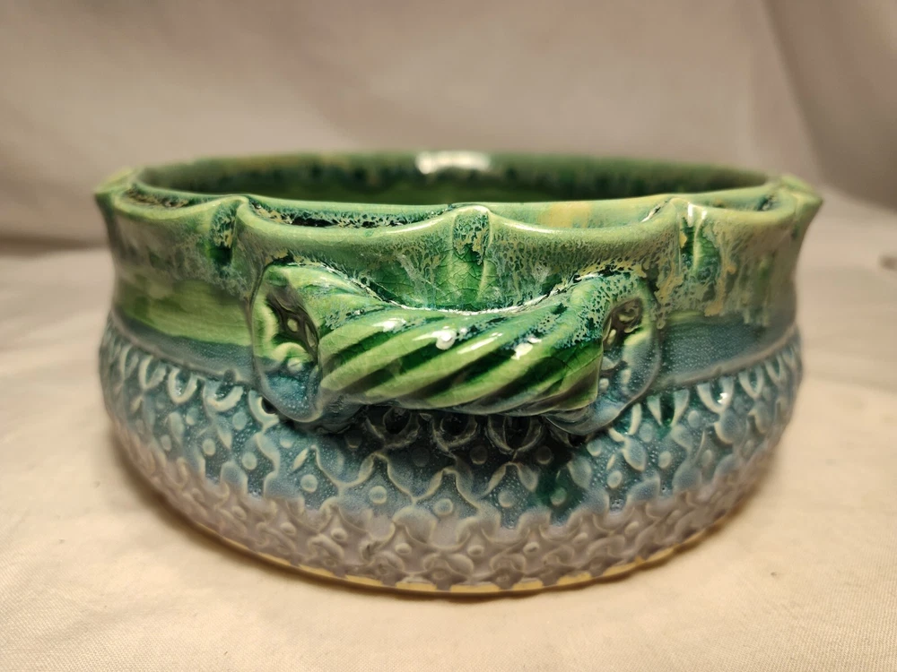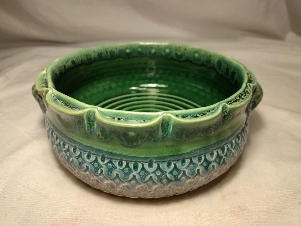 Earthen Clay Pot 7" Pottery Vintage North Carolina USA Wonderful handmade pot with raised relief and a beautiful combination of colors and patterns. The artist Hope Fregerio hails from Charlotte North Carolina. The pot measures just over 7 inches in diameter and 3 inches tall. Signed on base.