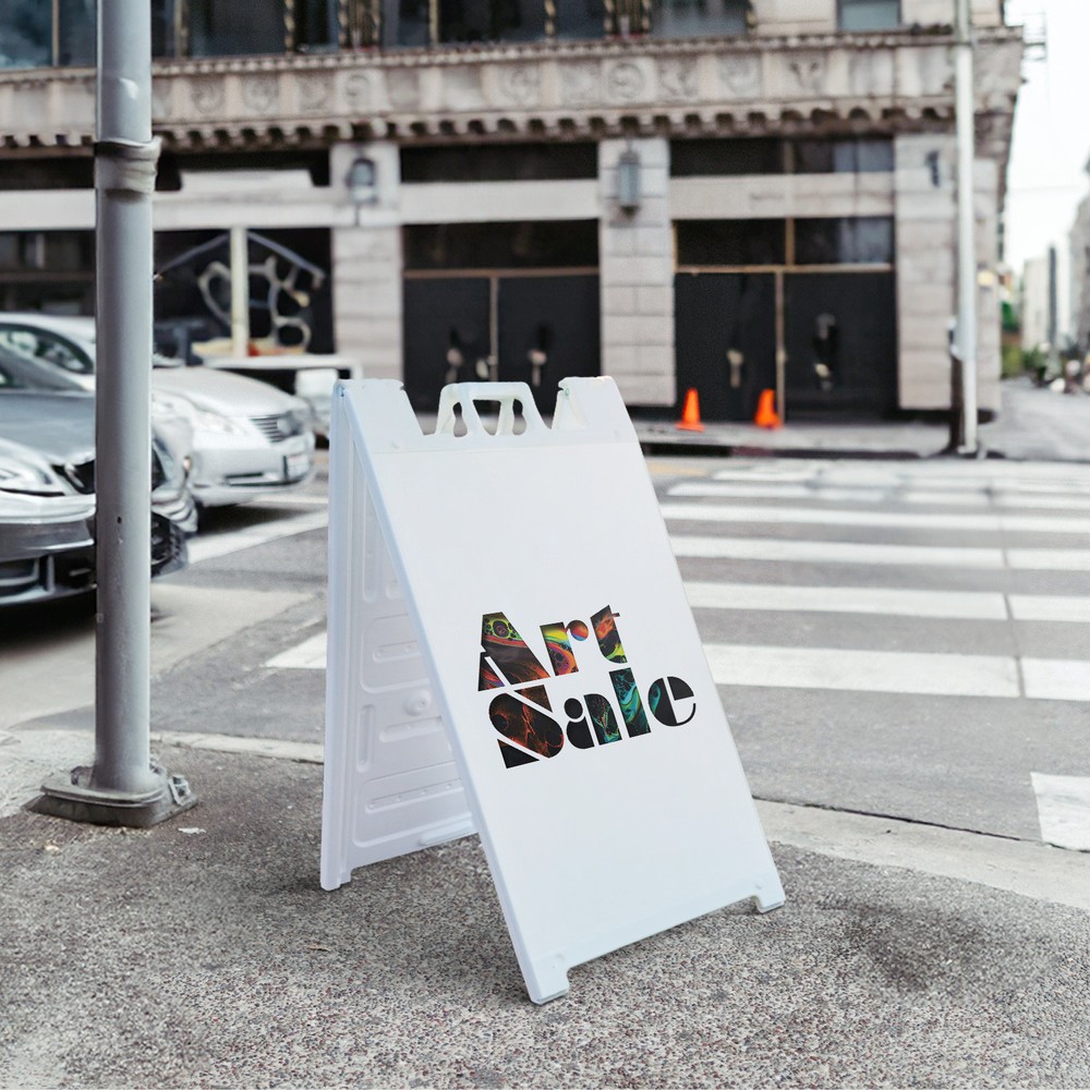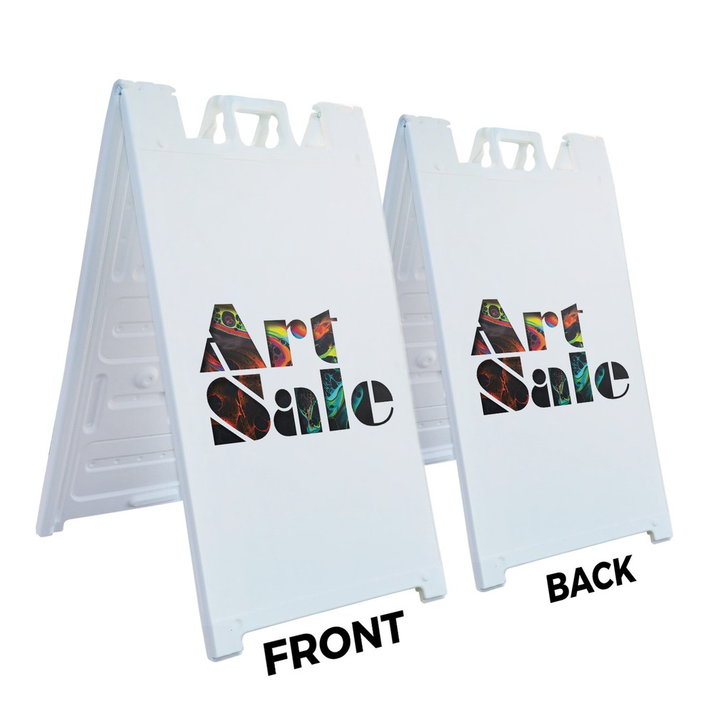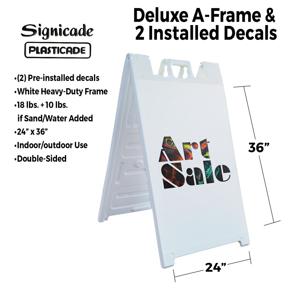 Art Sale 24" x 36" Double Sided A-Frame Sidewalk Sign Includes 2 Installed Decals | Foldable Portable White Signicade Sandwich Board Signs | Creative Promotions Exhibits Gallery Events | Made in USA Universal 2 eBay Template by Finest Design Vinyl Banners Aluminum Signs Safety Signs Yard Signs Designer Aluminum Signs Novelty Signs Vinyl Banners Aluminum Signs Safety Signs Yard Signs Designer Aluminum Signs Novelty Signs Description Art Sale Heavy Duty A-Frame Sidewalk Sign Creative Promotions Exhibits Gallery SignMission Deluxe A-Frame Signs Heavy-Duty - Portable - Reusable - Weather Resistant A-Frames, also known as sandwich board signs, are an easy and affordable way to advertise your business or event. The durable thick plastic frame allows them to be placed both indoors and outdoors in any conditions except extreme weather. They are also extremely easy to set up, take down, and move from one location to another as needed. Our Signicade Deluxe A-Frame is available with two installation options: Decals Installed – The sign graphics are printed on high-quality vinyl decals that come pre-installed on the frame. Corrugated Plastic Signs Installed – Includes two 4mm corrugated plastic sign inserts that are attached using self-adhesive Velcro (included). Need to switch up your messaging? Extra sets of inserts are available in both decal and corrugated plastic options. Order multiple sets and change your message in just a few minutes! Simply search for SignMission 24” x 36” sign inserts to get additional replacements. Product Features & Specs (2) 4mm Corrugated Plastic Signs OR Pre-Installed Decals Self-Adhesive Velcro (For corrugated plastic option) White Heavy-Duty Frame 18 lbs. + 10 lbs. if Sand/Water Added 24” x 36” Removable Sign Graphics Indoor / Outdoor Use Double-Sided A-Frame Features Weatherproof: The combination of high-quality plastic and added weight from sand/water makes these signs perfect for outdoor use. Rain or shine, your A-Frame sign can endure it all. Maximum Visibility: Because every A-Frame is double-sided, you can make sure everyone sees your message. Portable: The collapsible A-Frame and convenient handle make it easy to move your sign from one location to another. Reusable: Store your signs and use them as you always have, swap inserts to change your messaging, and use your A-frame signs for years to come. Weight: 18 lbs. (Weight does not reflect when the frame is filled with water or sand, which can add 10 additional lbs. when full.) Details: Durable heavy-duty plastic frame with a regressed double-sided sign area (24”x36”). Foldable with a molded handle for easy grip and carrying. Fillable frame for greater stability. Swappable corrugated plastic graphics or pre-installed decals. Portable. Uses: Indoor/Outdoor. Trade shows. Sidewalk advertising. Daily specials and menus for restaurants. Point-of-purchase displays. Event and foot traffic. Directional signage. Estimated Lifespan: 5+ years with proper placement and care. Size: 45"H x 25"W x 3"D - Frame; 24" x 36" Graphic Area.