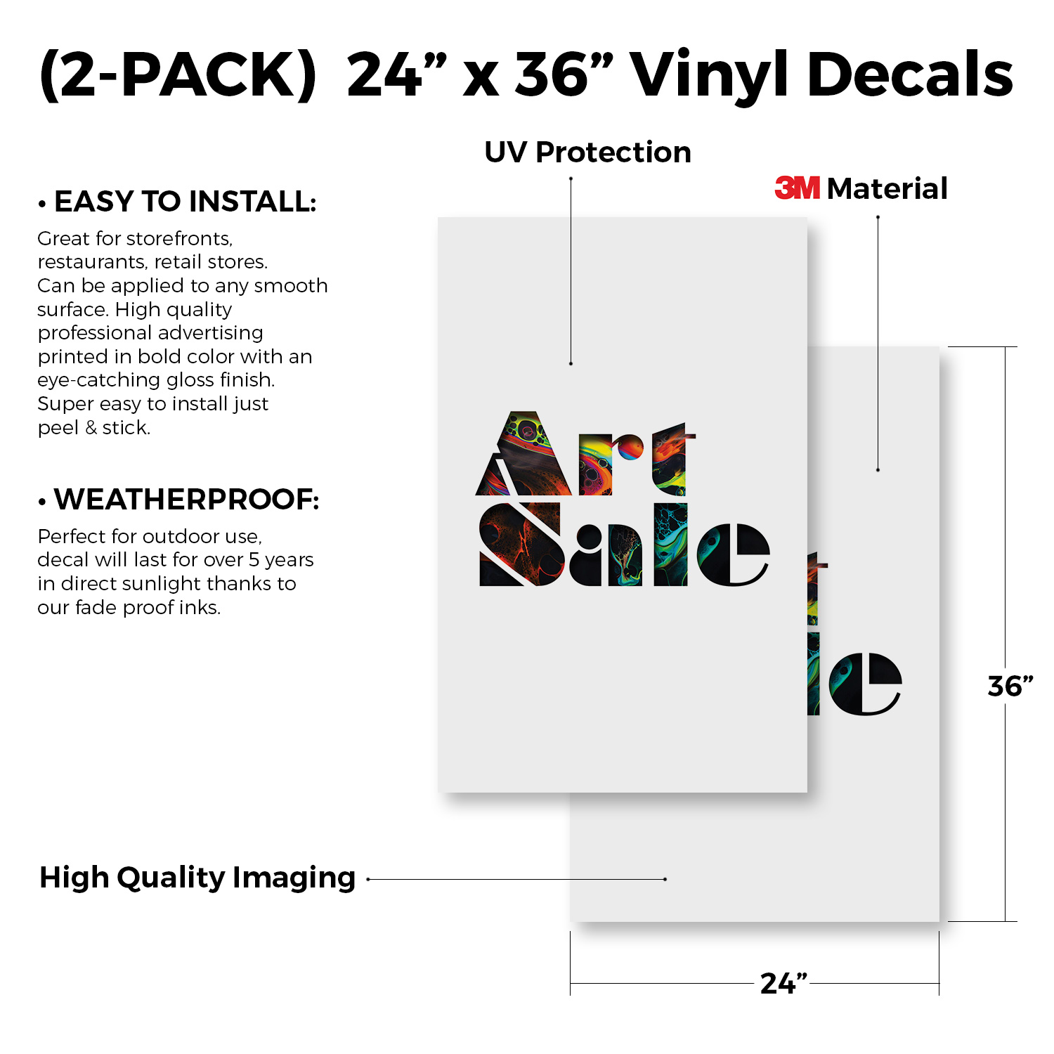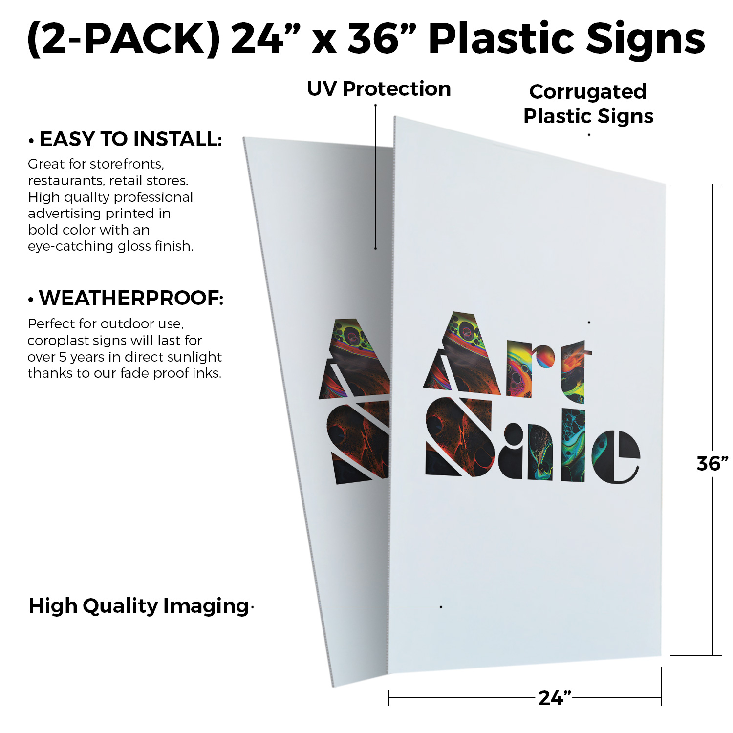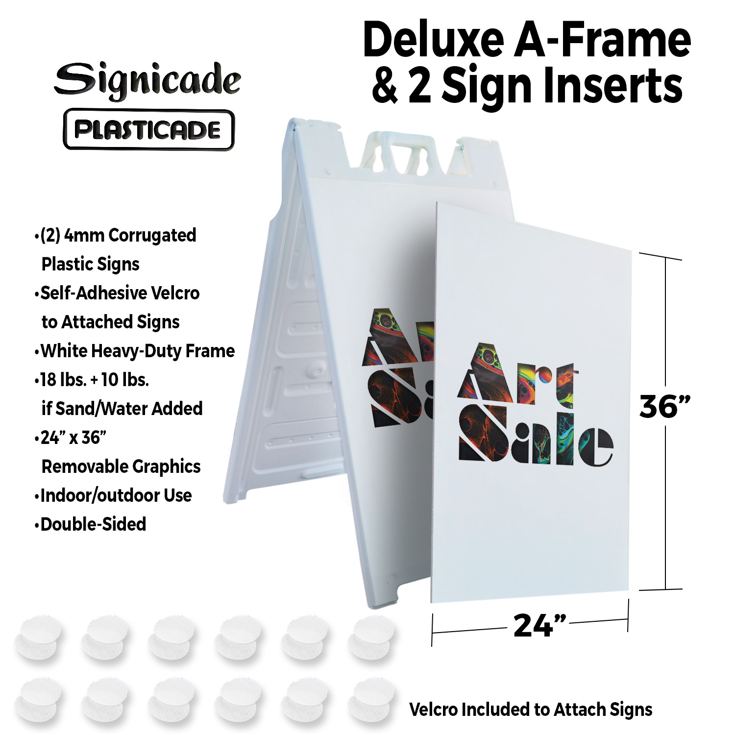 Art Sale 24" x 36" Double Sided A-Frame Sidewalk Sign Includes 2 Installed Decals | Foldable Portable White Signicade Sandwich Board Signs | Creative Promotions Exhibits Gallery Events | Made in USA Universal 2 eBay Template by Finest Design Vinyl Banners Aluminum Signs Safety Signs Yard Signs Designer Aluminum Signs Novelty Signs Vinyl Banners Aluminum Signs Safety Signs Yard Signs Designer Aluminum Signs Novelty Signs Description Art Sale Heavy Duty A-Frame Sidewalk Sign Creative Promotions Exhibits Gallery SignMission Deluxe A-Frame Signs Heavy-Duty - Portable - Reusable - Weather Resistant A-Frames, also known as sandwich board signs, are an easy and affordable way to advertise your business or event. The durable thick plastic frame allows them to be placed both indoors and outdoors in any conditions except extreme weather. They are also extremely easy to set up, take down, and move from one location to another as needed. Our Signicade Deluxe A-Frame is available with two installation options: Decals Installed – The sign graphics are printed on high-quality vinyl decals that come pre-installed on the frame. Corrugated Plastic Signs Installed – Includes two 4mm corrugated plastic sign inserts that are attached using self-adhesive Velcro (included). Need to switch up your messaging? Extra sets of inserts are available in both decal and corrugated plastic options. Order multiple sets and change your message in just a few minutes! Simply search for SignMission 24” x 36” sign inserts to get additional replacements. Product Features & Specs (2) 4mm Corrugated Plastic Signs OR Pre-Installed Decals Self-Adhesive Velcro (For corrugated plastic option) White Heavy-Duty Frame 18 lbs. + 10 lbs. if Sand/Water Added 24” x 36” Removable Sign Graphics Indoor / Outdoor Use Double-Sided A-Frame Features Weatherproof: The combination of high-quality plastic and added weight from sand/water makes these signs perfect for outdoor use. Rain or shine, your A-Frame sign can endure it all. Maximum Visibility: Because every A-Frame is double-sided, you can make sure everyone sees your message. Portable: The collapsible A-Frame and convenient handle make it easy to move your sign from one location to another. Reusable: Store your signs and use them as you always have, swap inserts to change your messaging, and use your A-frame signs for years to come. Weight: 18 lbs. (Weight does not reflect when the frame is filled with water or sand, which can add 10 additional lbs. when full.) Details: Durable heavy-duty plastic frame with a regressed double-sided sign area (24”x36”). Foldable with a molded handle for easy grip and carrying. Fillable frame for greater stability. Swappable corrugated plastic graphics or pre-installed decals. Portable. Uses: Indoor/Outdoor. Trade shows. Sidewalk advertising. Daily specials and menus for restaurants. Point-of-purchase displays. Event and foot traffic. Directional signage. Estimated Lifespan: 5+ years with proper placement and care. Size: 45"H x 25"W x 3"D - Frame; 24" x 36" Graphic Area.