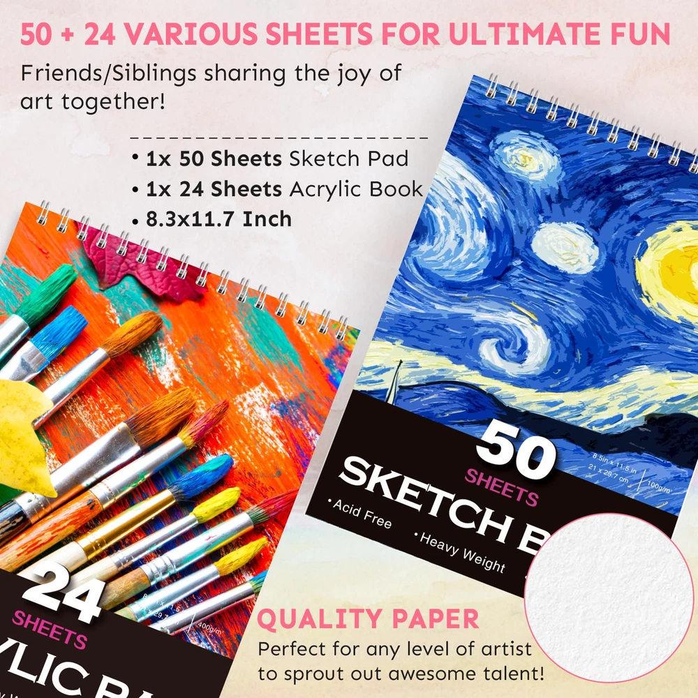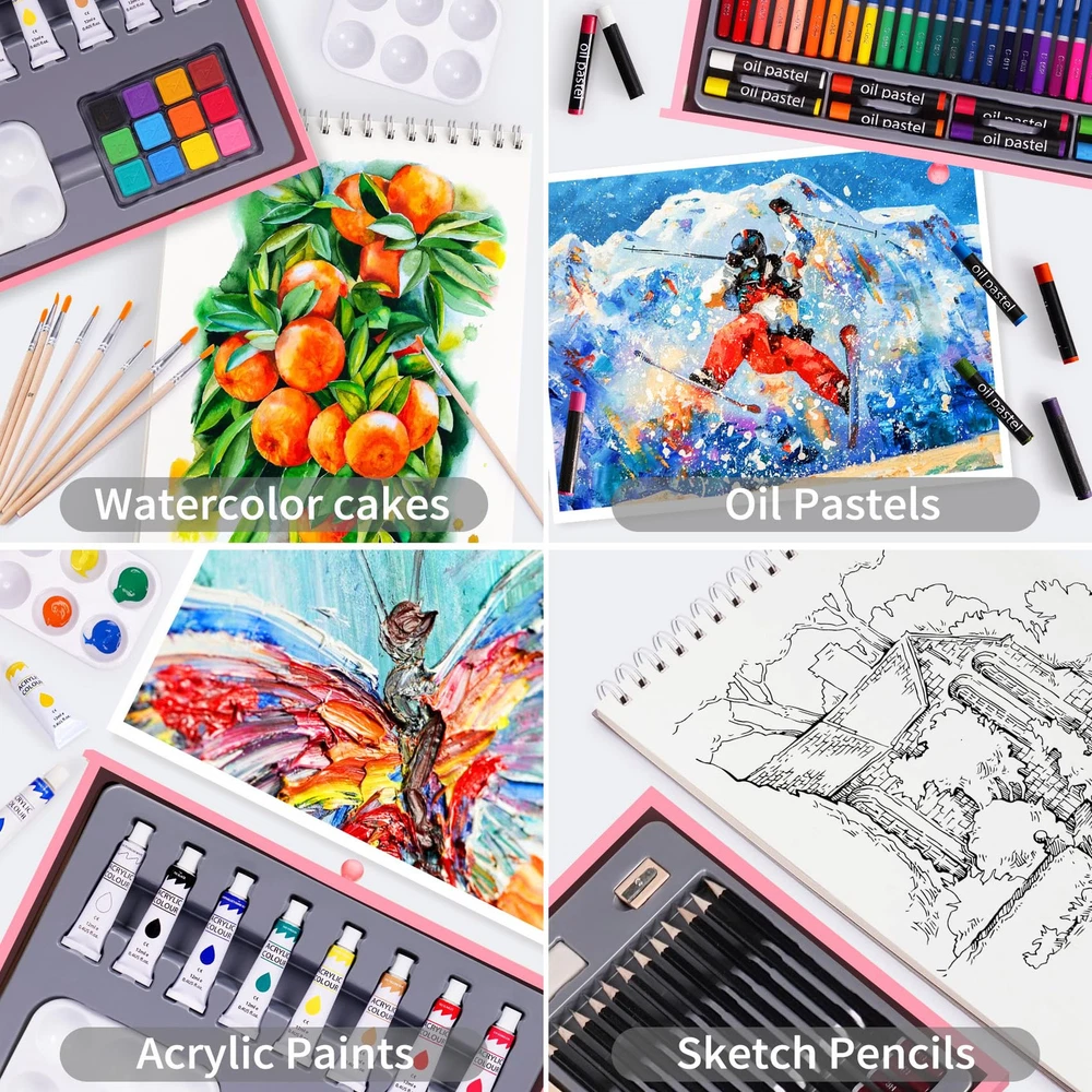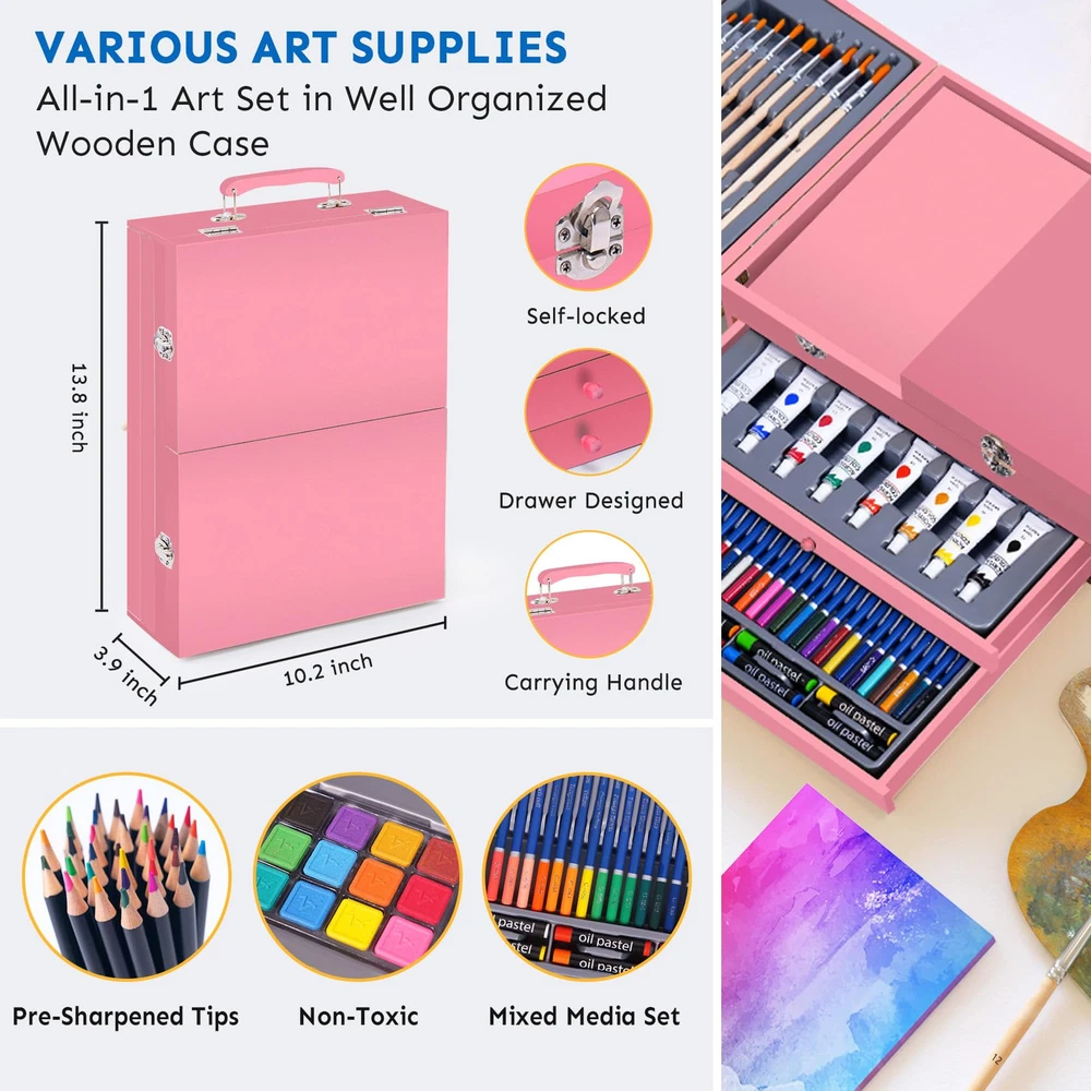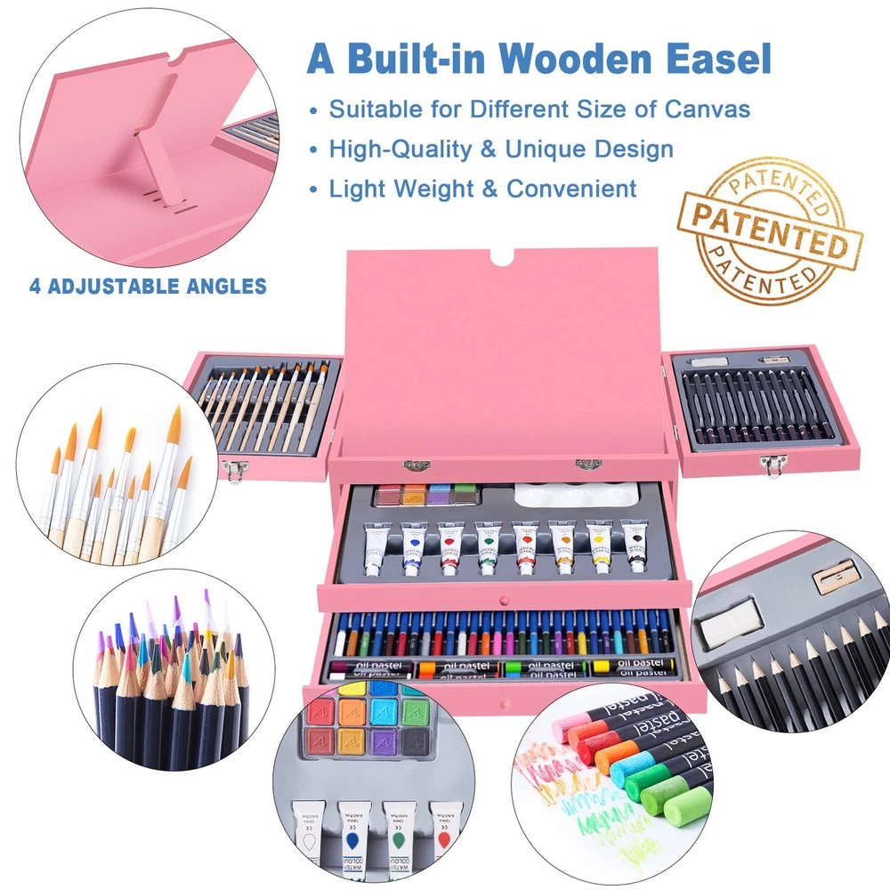 【Good Quality, Deluxe Art Set】Everything you need to get start creating, all in a compact wooden case! You can have fun drawing, coloring and painting as soon as you open the set. 50 sheets sketchbook and 24 acrylic paint pad (8.5*11.5 inch) included in this art supplies set, with a built-in wooden easel to release your imagination. Great Present set, art supplies kit for any level of artist! 【Mega Wooden Art Kits】This Premium drawing set includes 1 4-angle-adjustable built-in Wooden Easel, 28 Watercolor Pencils, 12 Sketch Pencils, 50 sheets Drawing Pad, 24 sheets Acrylic Paint Pad, 8 Acrylic Paint Tubes, 12 Watercolor Cakes, 1x6 Well Palettes, 8 Oil Pastels, 10 Paint Brushes, 1 Pencil Sharpener, 1 Eraser, organized and displayed in 1 elegant Portable Wooden Art Case. The best tools for sprout out your awesome art talent! 【Well Organized Present Box】All the drawing supplies are well organized and come with a luxurious wooden case with drawer to easily organize your supplies. A great present idea for adults and teens, girls and boys, to bring everyone so much fun! Easy to carry and use in school, office, travel or at home. Ideal Arts and Crafts present for Birthday Present, Valentine's Day, Party, New Year, Back to School Supplies Present. 【Safe Art Supplies】Made with high quality materials, this art drawing kit is suitable for anyone who loves art. All of the colorful crayons, pencils, markers and pastels in this art kit are safe and non-. Ideal art kits to color and blend, feel free to create each of your masterpiece! 【Quality 】We care about product quality and your feeling. Our patient and quick response is to meet your highest satisfaction. In case you have any question about our drawing supplies art sets, just us freely, we will get back to you within 24 hours and do our best to make things right.