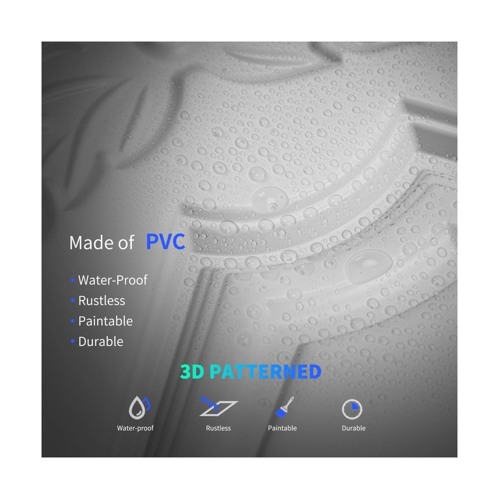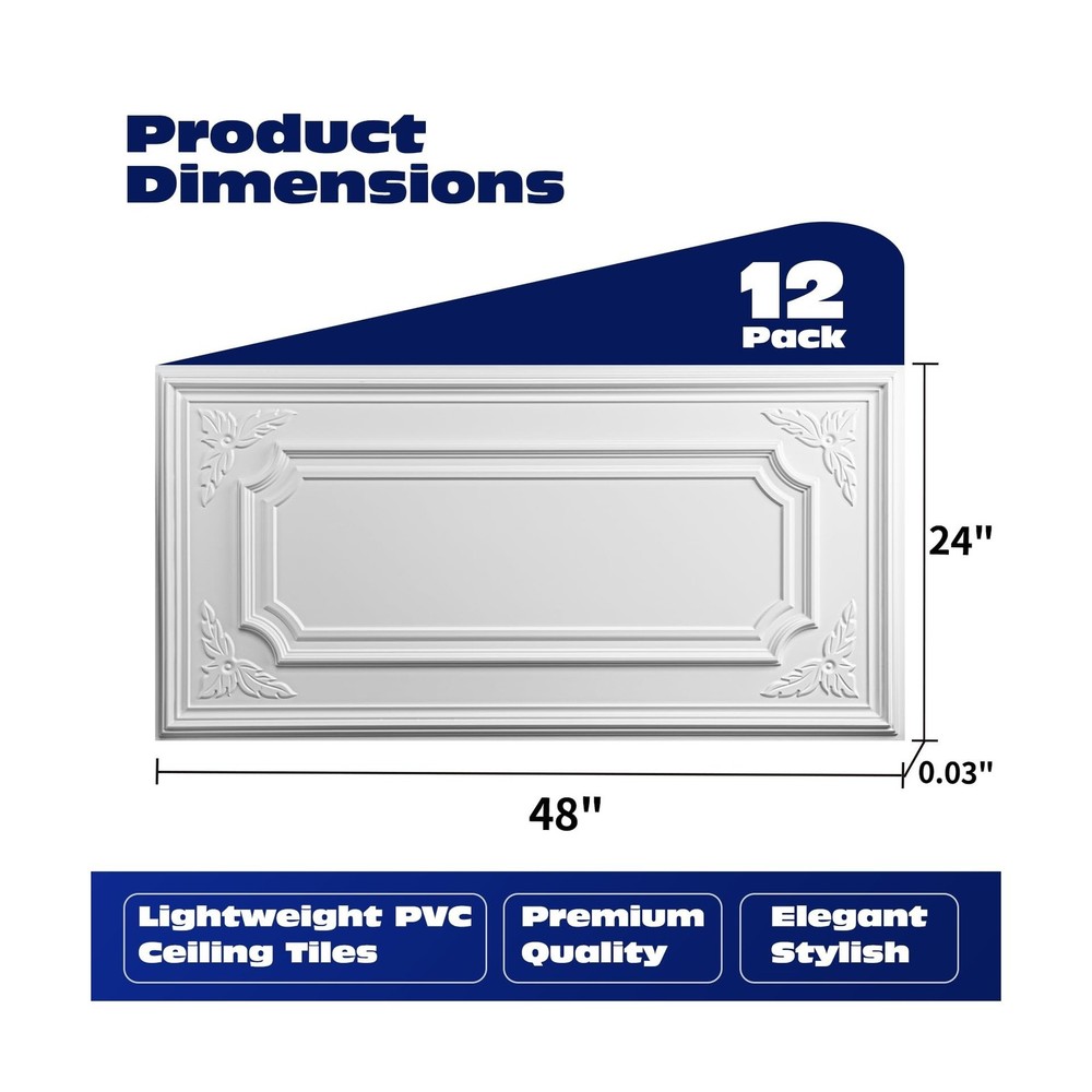 Art3dwallpanels 12 Pack Drop Ceiling Tiles, 2x4 Ft PVC Decorative 3D Wall Panel, Glue Up Ceiling Covering Panels for Basement Kitchen Bathroom, 24x48 Inch, Cover 96 Sq. Ft, White Description Features: Pack Size - Pack of 12 ceiling tiles with size 2ft x 4ft, covering 96 sq.ft. 3D pattern with raised design makes our ceiling panels more eye-catching. Easy to Install - Fit into a standard 15/16" T grid ceiling system. Our ceiling tiles are lightweight, flexible, can be easily cut with scissors, utility knife or table saw. Premium Material - This 3d textured drop ceiling tiles is made of premium PVC, offers superior fire and heat resistance, washable, paintable, and corrosion resistance. Resistant to cracking, fading, or warping over time. Dual Purpose - This oversized square-cut wall panel can serve as both wall decor and drop ceiling tiles, enhancing your space with design and dimension. Wide Application - Our 24x48 ceiling tiles is a perfect solution for covering old ceiling or adding some visual interest, can be used in commercial settings and residential renovations. Product Details: Brand: Art3dwallpanels Material: Polyvinyl Chloride (PVC) Size: 24''x48'' Color: White Finish Type: Unpolished Style: Art Deco Installation Type: Lay-In Product Dimensions: 24"W Pattern: Floral Item Weight: 11.11 Kilograms Color: White Finish Types: Unpolished Style Name: Art Deco Pattern: Floral Shape: Rectangular Edge Type: Square Edge Form Factor: Rectangular, Textured Water Resistance Level: Moisture Resistant Installation Method: Lay-In Material Type: Polyvinyl Chloride (PVC) Size: 24''x48'' Item Dimensions L x W: 24"W Item Weight: 11.11 Kilograms Unit Count: 12.0 Count Brand Name: Art3dwallpanels Manufacturer: Art3dwallpanels Item Height: 0.1 centimeters Delivery We Do Not Ship Outside of the Continental US. Return Policy All items qualify for returns within 30 days of receipt. Seller is responsible for return shipping on any item that is not damaged. Feedback We take our reputation seriously, we buy and sell online, so we understand the value of trust. If you are unsatisfied with your order, please contact us and we will work with you to resolve it to your satisfaction.