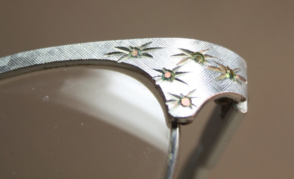 UPC: Does not apply Brand: Fashion Type: Eyeglasses Features: Cat Eye, Full Rim Temple Length: Unknown Personalized: No Vertical: Unknown Theme: Designer, USA Pattern: Floral Character: Unknown Department: Women Frame Material: Metal, Aluminum Vintage: Yes Model: Unknown Frame Width: See Pics Frame Color: Silver MPN: Unknown Country of Origin: United States gtin13: Does not apply Bridge Width: Unknown Lens Socket Width: Unknown Style: Cat Eye California Prop 65 Warning: N/A Color: Silver/Chrome Product Line: See Pics