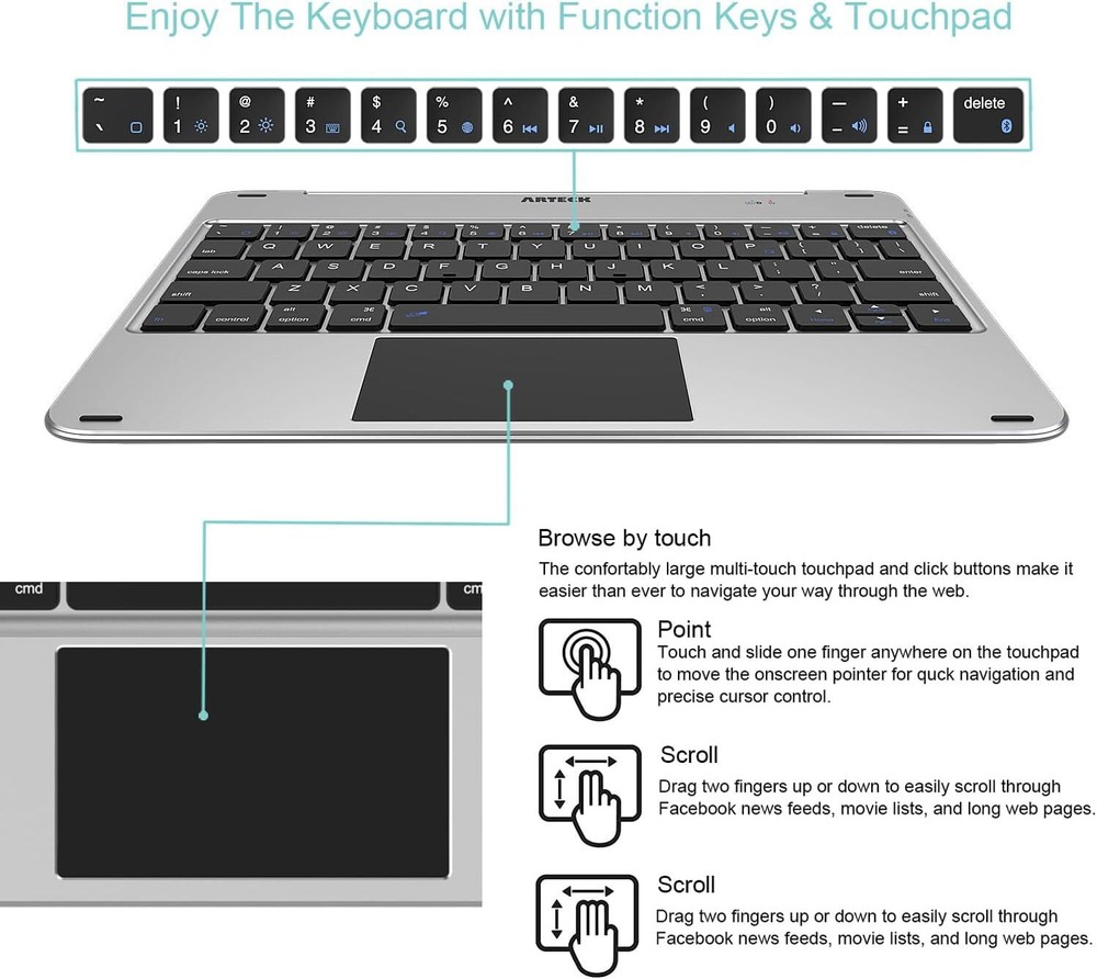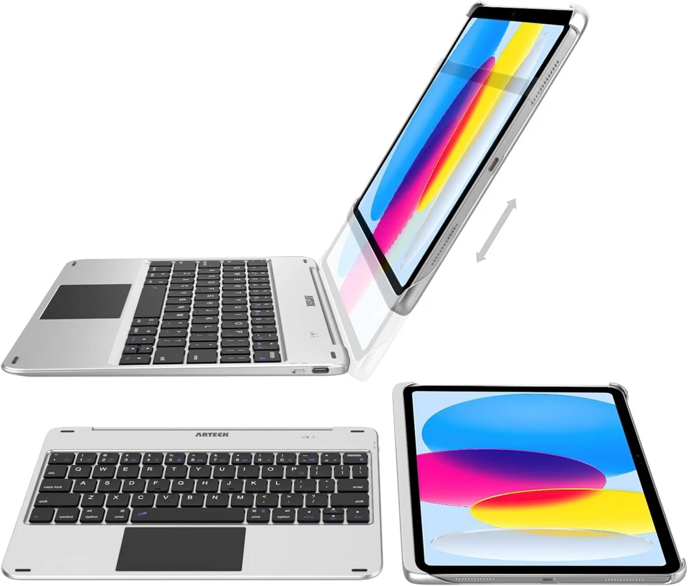 Keyboard Case with Trackpad, Arteck Bluetooth Keyboard with Folio Full Protection Case and Touch Pad for Apple 10.9-inch iPad 10 Generation (2022) with 130 Degree Swivel Rotating Product Details Package Dimensions: 10.51 x 8.9 x 0.87 inches Item Weight: 1.81 pounds Manufacturer: Arteck Batteries: 1 Lithium Ion batteries required. (included) Brand: Arteck Compatible Devices: iPad 10, iPad 10.9-inch Connectivity Technology: Bluetooth Keyboard Description: Wireless Recommended Uses For Product: Office Special Feature: Magnetic Protection Case, Integrated Stand, Trackpad, Rechargeable Number of Keys: 78 Style: Modern Material: Acrylonitrile Butadiene Styrene Included Components: USB-C Charging Cable Keyboard & Trackpad: Standard Mac keyboard layout features larger key size for a more relaxed typing experience, connects wirelessly via Bluetooth with easy-connect process. The trackpad allows you to work with iPad in a new way. Keyboard & Full Protection Case: Magnetic attaching style makes the case attach to the keyboard very easy and convenient. Switch between the iPad case style and laptop style with a simply magnetic attaching. iPad 10 (10.9-inch, 2022) Compatible: The keyboard cover includes the auto sleep/wake feature activated by opening and closing the case, suitable for Apple 10.9-inch iPad 10th Generation (2022), A2696, A2757. This keyboard is not suitable for iPad 9th Generation, any iPad Air or iPad Pro. Rechargeable: Charge up in 2 hours and enjoy 100 hours of uninterrupted use. Arteck 10.9-inch iPad 10 (2022), A2696 A2757 Bluetooth Keyboard Case with Trackpad: This keyboard is specially made for the Apple 10.9-inch iPad 10 (2022) (A2696, A2757) and perfectly complements its thin, lightweight design style. A Mini Laptop with Hardware Keyboard and Touch Pad: This Bluetooth keyboard also doubles as a screen protector and viewing case. Simply push the iPad into the unique iPad case and let the powerful magnets grip the iPad securely to instantly give your iPad a keyboard with touch pad and a protective cover that also acts as a multi-angle stand for easy viewing and typing. Looks just like a laptop! Easy-type Keyboard: Using a standard Mac format keyboard layout, the larger keys give you a familiar and comfortable typing experience and saves screen space - view content while you type without the on-screen keyboard getting in the way. Conveniently Secure: Built-in case and magnetic attachment allow the iPad be tilted up to 130 degree to provide the most comfortable viewing position for typing or viewing photos and movies. Auto Wake and Sleep Besides activating the iPad's Auto sleep-wake function to instantly wake your iPad when you open the cover and send it to sleep mode when you close it. The keyboard will enter its own sleep mode after a few minutes of inactivity - simply press any key to wake the keyboard up again. Premium Looks: The super-slim, lightweight design perfectly complements the elegantly sophisticated design style of the iPad. The thin and lightweight materials won't detract from the iPad's stunning looks but still offers durable protection for your iPad. Arteck 24 Months Customer Care: At Arteck, we believe in our products. That's why we back them all with a 24-month customer care and please contact the email on the product if needed.