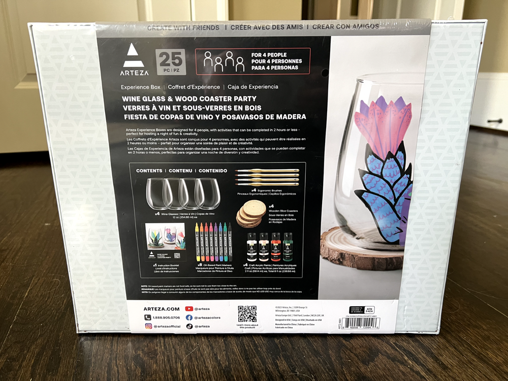 Arteza Wine Glass & Wood Coaster Party Experience Box β 25-Piece Creative Set for 4 People Uncork your creativity with the Arteza Wine Glass & Wood Coaster Party Experience Box ! This brand-new, factory-sealed 25-piece set is designed for four people to enjoy a fun and artistic night together. In just a couple of hours, you and your friends can paint and personalize wine glasses and rustic wooden coasters , making memories while crafting unique keepsakes. π¨ Set Includes: π· 4 Wine Glasses β Ready for your artistic touch ποΈ 4 Ergonomic Brushes β Comfortable and precise for painting π² 4 Wooden Slice Coasters β Natural wood for a rustic charm π 1 Instruction Booklet β Easy-to-follow steps and inspiration ποΈ 8 Oil-Based Paint Markers β Vibrant, long-lasting colors π¨ 4 Craft Acrylic Paints β Perfect for detailed designs Perfect for girls' nights, date nights, holiday gatherings, or creative parties , this all-in-one kit makes DIY decorating fun and easy . No experience neededβjust grab a glass, sip, paint, and enjoy!