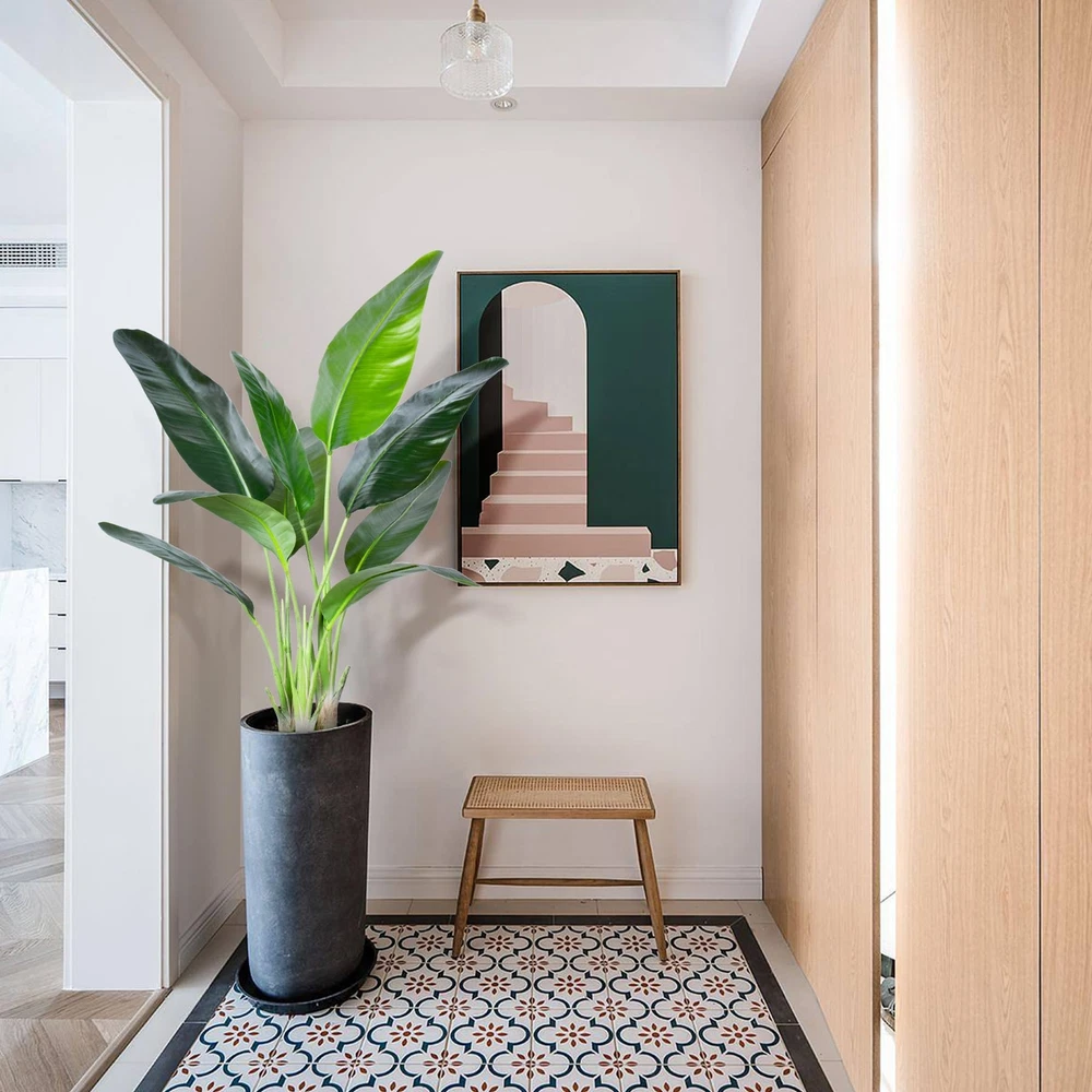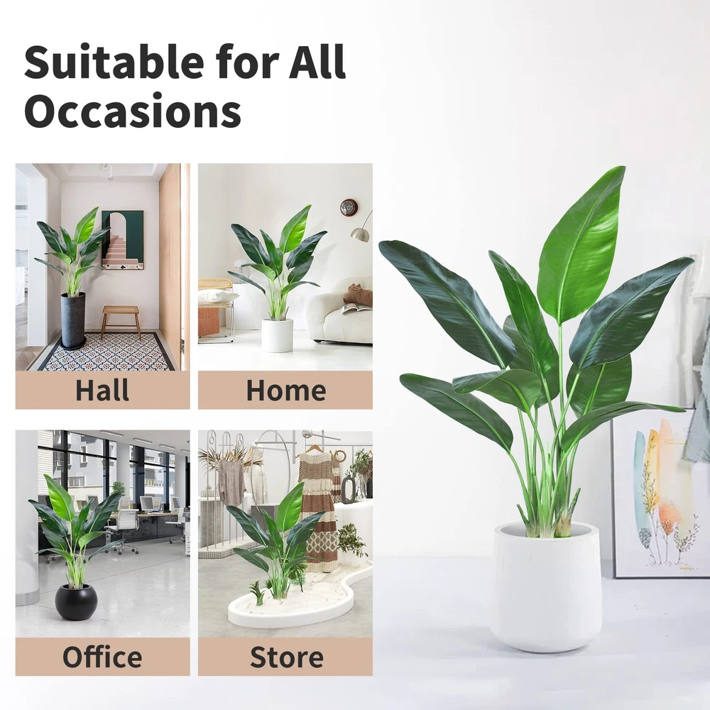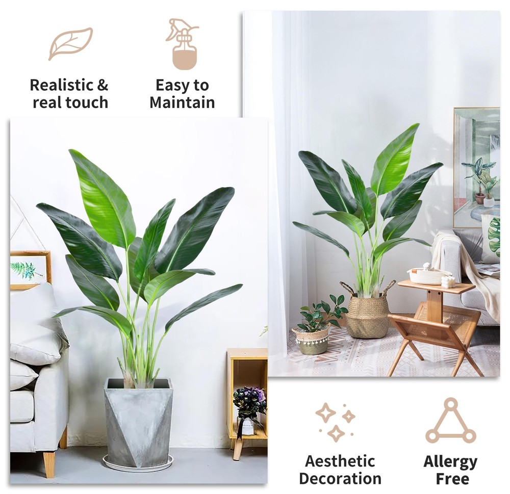 【Gorgeous Artificial Plant】Artificial plants fake tree are all selected from nature.this bird of paradise artificial plant have real touch leaves,please insert the branch and then gently bend the leaves to make them full,you will get a lifelike tree,let you feeling romance and beauty of nature without leaving home. 【Best Decoration】Artificial bird of paradise plants with natural colors and lifelike shapes.it's best decoration for home livingroom bathroom hall office shop indoor&outdoor, and also an elegant gift for relatives and friends. 【Easy to Maintenance】Faux plants are different from real plants, they don't require special care, no need sunshine 、watering and fertilize, If them happen to get a little dusty, simply wipe clean with a damp cloth. 【Three Size Available】Our artificial bird of paradise tree have three size available;4ft、5ft&6ft,6ft faux plants with 13pcs real touch leaves, 5ft faux plants with 10pcs real touch leaves ,4Ft faux plants with 9pcs leaves.you can choose different sizes of fake floor plants to decorate your house. 【Warm Tips】Artificial plants don't produce pollen,making them a great alternative for people with allergies or sensitivities to real plants. please feel free to contact us if you have any issues with your purchase, and we will try our best to promise you satisfaction.