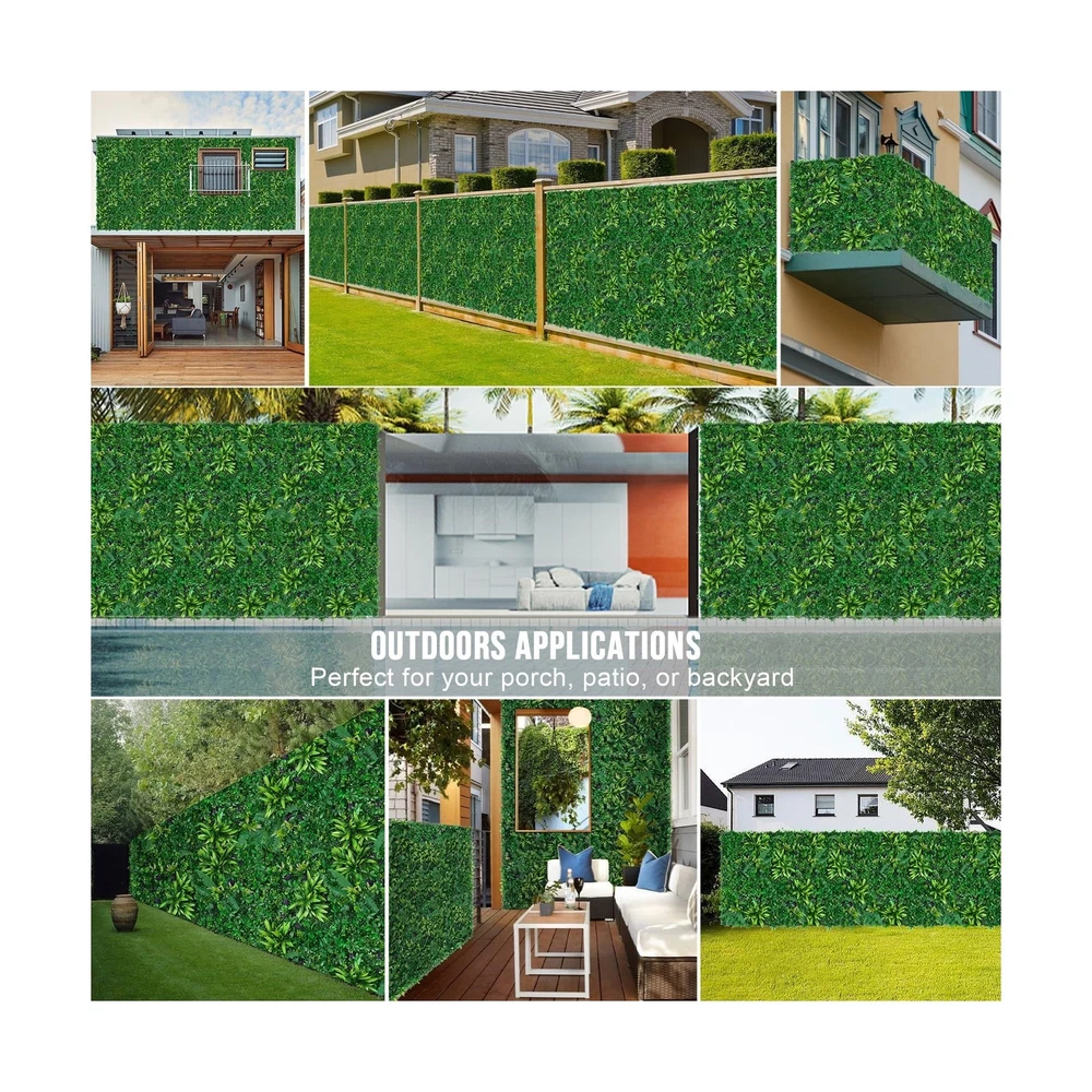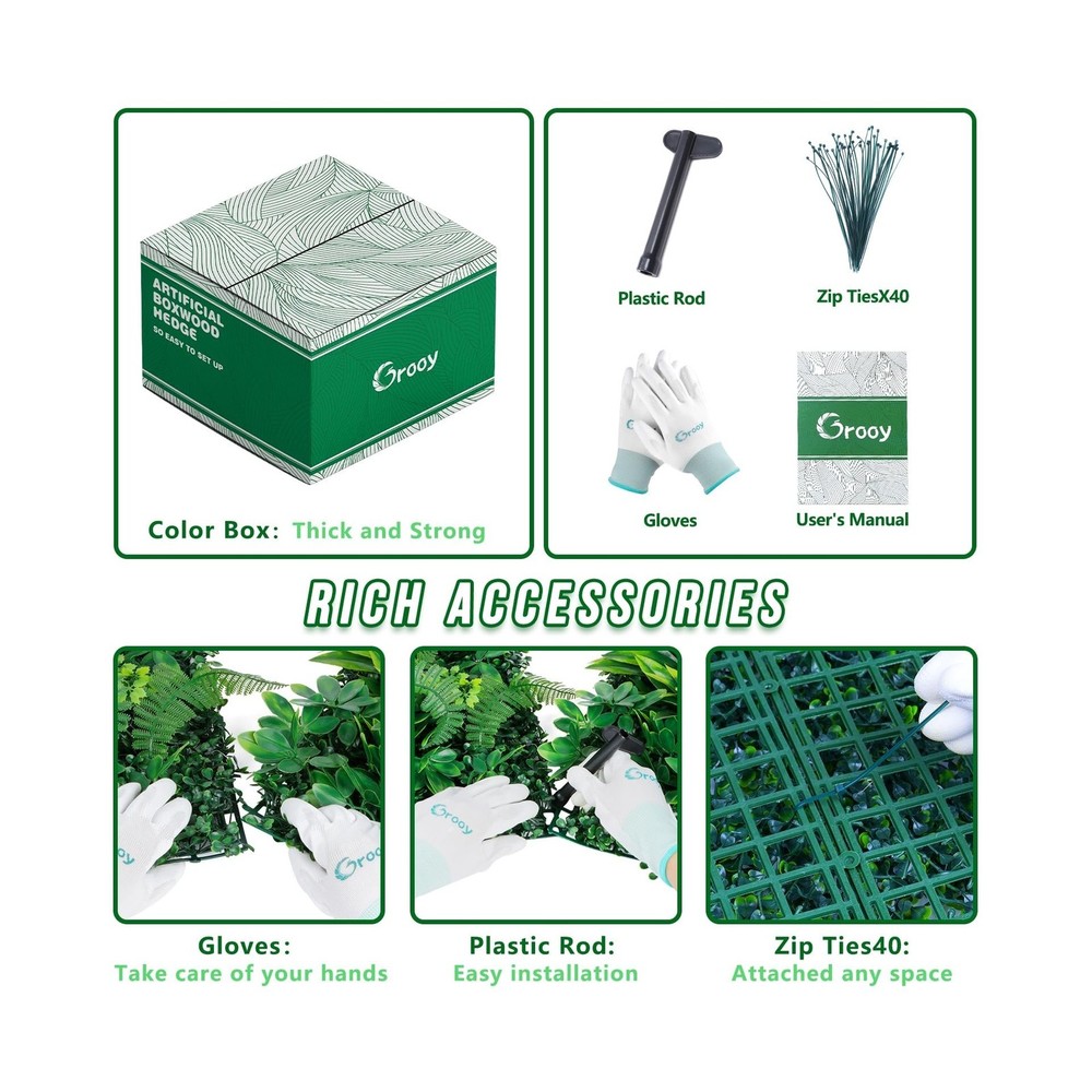 Artificial Boxwood Panels, Grass Wall Panels 20"x20"(12pcs), Privacy Hedge Fence Screen with UV Protection, Fake Greenery Backdrop for Indoor Wedding and Outdoor Garden Backyard Description Features: No Sparse, Unique Design, RealisticEven indoors, one can feel the connection to nature. Our fake grass wall panels provides an authentic and dense privacy hedge panels without any visible gaps. The realistic appearance of these decorative artificial grass panels adds a unique touch to your space. Premium Greenery, Built to LastGrooy Artificial Boxwood Hedge Panels are made tough, using the latest in High-Density Polyethylene (HDPE). No matter the blazing sun or stormy weather, they'll stay vibrant and lifelike, adding a touch of nature that lasts. Easy Assembly & CustomizationEach pack includes 12 pieces (20x20) with 40 zip ties, gloves, a plastic rod, and an installation guide for a quick and easy setup. No DIY skills needed. Customize panels effortlessly with basic cuts and shapes. Secure them using zip ties or drill for tougher surfaces. Versatile, Inside and OutThese artificial wall grass panels are versatile and suitable for both indoor and outdoor spaces. Perfect for porches, patios, backyards, living rooms, balconies, or office workspaces, they elevate the aesthetic appeal of any environment. Certified Safety and WarrantyGrooy's Greenery Grass Wall meets stringent safety standards for homes, gardens, and businesses. UV-tested for lasting quality, thus the artificial grass backdrop can be used outdoors and no fade. Product Details: Brand: Grooy Plant or Animal Product Type: Dracaena(plant) Color: Dracaena Material: High Density Polyethylene Product Dimensions: 22"D x 22"W x 10"H Brand: Grooy Plant or Animal Product Type: Dracaena(plant) Color: Dracaena Material: High Density Polyethylene Product Dimensions: 22"D x 22"W x 10"H Recommended Uses For Product: indoor and outdoor Specific Uses For Product: Home Decor, Hotel Decor, Office Decor Indoor/Outdoor Usage: Indoor Package Information: Box Number of Items: 12 Item Weight: 18.7 Pounds Room Type: Bathroom, Home Office, Living Room, Office Decor Container Material: Plastic Special Feature: UV Resistant Included Components: Gloves, Plastic rod, User's manual, Zip ties Item Package Quantity: 1 Shape: Square Unit Count: 12.0 Count Scent: Unscented Manufacturer: Grooy Item Weight: 18.7 pounds Item model number: 12 Size: 12PCS 20''x20'' Style: Art Deco Number Of Pieces: 12 Mounting Type: panels_and_mats Special Features: UV Resistant Batteries Included?: No Batteries Required?: No Date First Available: October 5, 2023 Delivery We Do Not Ship Outside of the Continental US. Return Policy All items qualify for returns within 30 days of receipt. Feedback We take our reputation seriously, we buy and sell online, so we understand the value of trust. If you are unsatisfied with your order, please contact us and we will work with you to resolve it to your satisfaction.