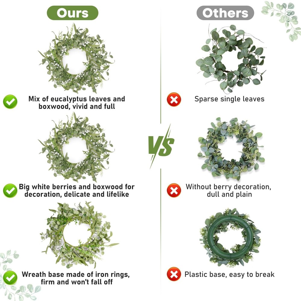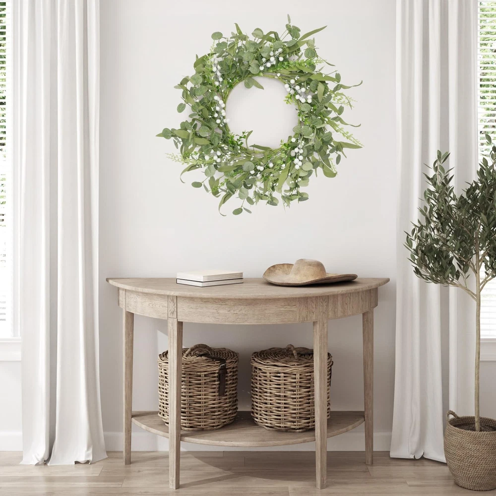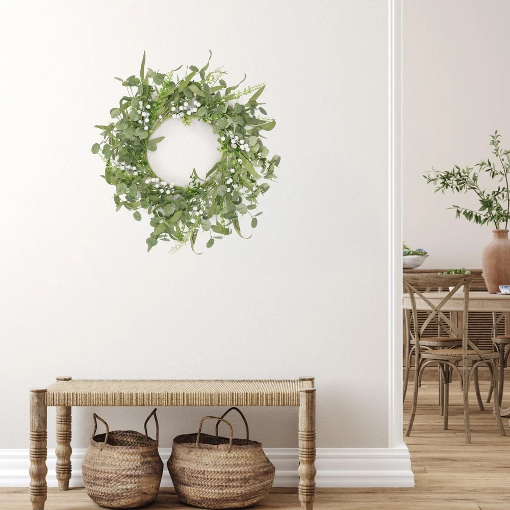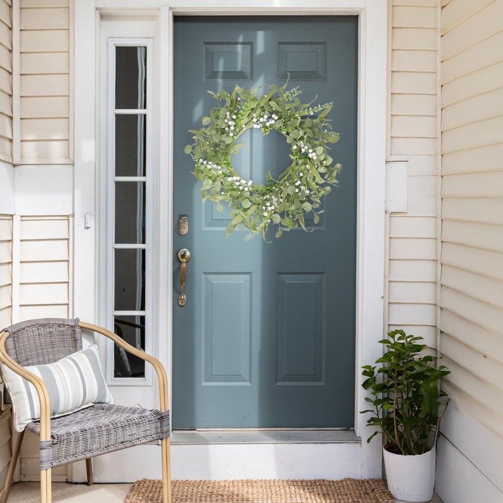 Artificial Eucalyptus Wreath for Front Door, Spring Summer Wreath with Boxwood for Window Wedding Decor Home Porch Farmhouse Patio Garden Decor 20 Inch Product Details Color: 2-green Brand: Grandeal Material: Eucalyptus Mounting Type: Wall Mount Shape: Round Product Dimensions: 20"D x 20"W x 3"H Manufacturer: Dongguan Qianjing Electronic Industry Co., Ltd. Color: 2-green Brand: Grandeal Material: Eucalyptus Mounting Type: Wall Mount Shape: Round Product Dimensions: 20"D x 20"W x 3"H Manufacturer: Dongguan Qianjing Electronic Industry Co., Ltd. Item Weight: 1.06 pounds Country of Origin: China Item model number: DCH-4V112MAB Date First Available: November 20, 2024 Rich, Realistic Handmade AppealOur hand - crafted eucalyptus wreath is truly something special! Packed with eucalyptus leaves, boxwood, and delicate white berries, it looks incredibly full and natural. It's so realistic, you'll feel like you've brought a piece of nature indoors. Its beauty will instantly brighten up your home, creating a warm and inviting atmosphere Ideal Size and Gift - WorthyMeasuring 20 inches in diameter, this wreath is perfect for any space. It comes in a sturdy, elegant box, making it an ideal gift for your friends. During shipping, it's compressed to keep it safe. But don't worry! Just give it a good stretch, and it'll reach its full, glorious size Incredibly Versatile DecorThis wreath is a decorator's dream! It's suitable for every season of the year. Add maple leaves for a touch of fall, or bells for a festive winter look. You can customize it however you like, and it'll always be the most unique piece in your home. Hang it on the wall, front door, porch, or in any room like the bedroom or living room. Whether it's an indoor or outdoor event, like a wedding or a party, this wreath will make a statement and impress everyone Exceptionally DurableCrafted from top - notch materials, this wreath is built to last. The colors won't fade over time, the leaves won't fall off, and the berries won't rot. There's no need for watering or any special cleaning. You can enjoy its beauty for years to come, without any hassle We're Here to HelpIf you have any issues with our product, don't hesitate! Contact us right away, and we'll get back to you as soon as possible. Your satisfaction is our top priority