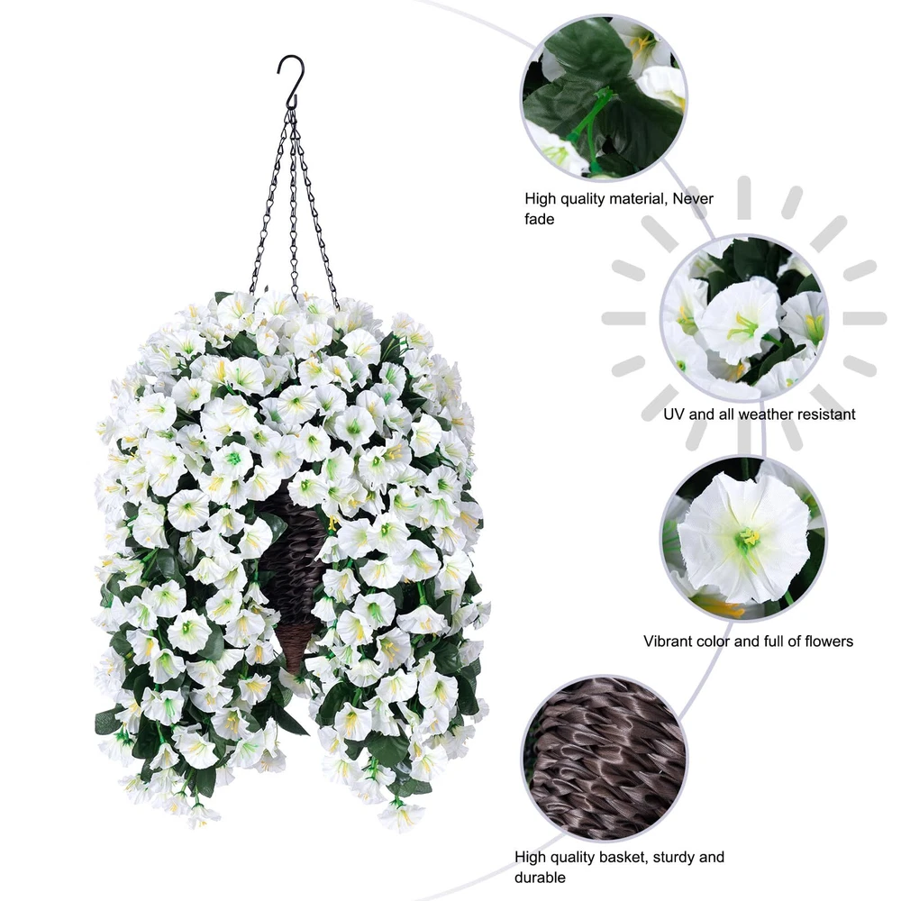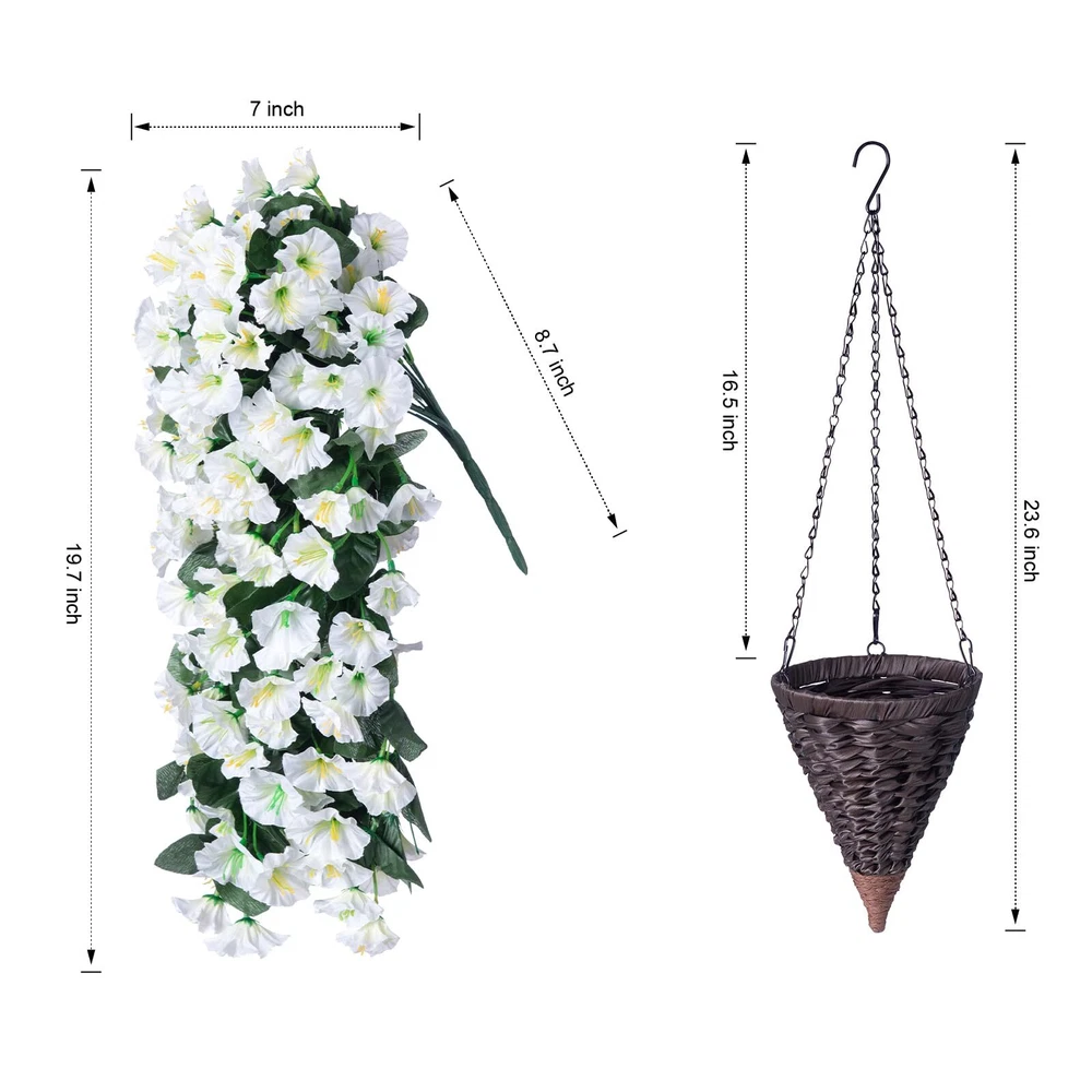 BEAUTIFUL HANGING FLOWERS: artificial hanging orchid flower has rich blossom and leaves filled in a handmade cone shape rattan basket. SIMPLE ASSEMBLY: artificial hanging plant needs 5 minutes to assemble. Simply place the silk flower branches to the basket and design the shape. Please refer to the pictures or video listed above if you need further instruction. PACKAGING: The beautiful faux hanging silk flower basket comprises of a cone-shaped basket with metal chains and 4 branches of orchid artificial flowers. Each hanging branch has forks of flowers and dark green leaves. GOOD QUALITY: The hanging basket and artificial flowers were made of good quality material that don’t require maintenance after assembly. It’s UV resistance and won’t fade, sturdy enough for any weather. No watering needs. ARTIFICIAL GREENERY DECORATION: The fake hanging flower in a basket looks real and stylish, making it the perfect hanging basket for your home, patio, balcony, garden, indoor and outdoor. It blooms all year and adds a sense of spring to your home.