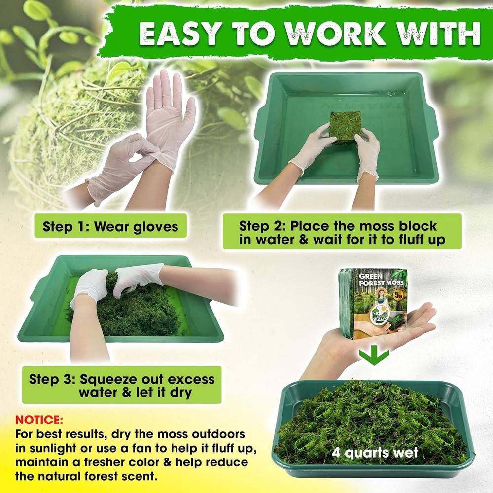 Green Moss for Crafts, Forest Moss Potted Plants, Decorative Moss for Table Centerpieces Wedding Christmas Fairy Party Decor, Green Moss for Indoor Planters, DIY Project 5 Oz πΏπ ππππ-πππππ ππππ: If you are looking for green moss for your own project, this decorative moss is exactly what you are looking for. This item contains 140 grams of dried moss, approximately 5 oz when compressed, and expands to 4 quarts after soaked in water. This great amount of forest moss bulk is adequate for an art or craft project. This product is also available in sizes: 2 oz, 5 oz, 10 oz, 1,25 lbs to suit all your projects. πΏπ πππππππ πππππ πππππ: Unlike other artificial moss made from polyester, our moss for potted plants is made from dried forest moss that is selected & classified thoroughly by hand. The green moss color is dyed with natural pigment ingredients that are derived from plant leaves. Itβs totally safe with people and reptiles. πΏπ πππππ ππππππππππ ππππ π ππ πππ πππππππ: You can use our green moss for planters as an alternative solution to fake grass or faux moss. This increases your creativity and unleashes your potential to make interior moss crafts: fairy gardens, terrarium moss, moss wreaths, hanging baskets, wedding decor, mushroom decoration, moss table runners, moss mat, sheet moss, etc. πΏπ πππππππ πππππππππ & ππππ-π πππππππ: Our moss can be decompressed easily with either a gentle water spraying or quick soak method, making it simple for you to add natural beauty to any indoor space. Before start, WEAR GLOVES to prevent the dye from staining your hands (dye color's made from leaf extract that's totally safe). Place the moss block in a container of water & wait for it to fluff up. Once expanded, squeeze out the excess water & let it dry before use. πΏπ πππππππππ πππππ ππππππππππππ πππππππππππ: To make something unique on each occasion, dried green moss could be applied as a fairy artificial grass centerpiece. Especially at Christmas, New Year, Noel, Birthday party, Easter day, Green decor party, and Anniversary... πΏπ πππππππ ππππππππππ: We ensure that our green moss for crafts undergo strict quality control procedures and meets our high-quality requirements. But for any reason you are not fully satisfied, please feel free to contact us, our professional customer service team will be happy to provide you with a choice of replacement or refund. INITIAL QUANTITIES are Limited. Let's buy, Now! πΏπ ππππππ: For all customers, whether sensitive to strong scents or not, I recommend handling the moss outdoors and wait till it dry before bringing it inside. Since it's made from natural forest moss, it has a distinct smell, especially when soaked. Our moss is naturally sourced, so its green color may vary with the weather and season, and the hand-dyeing process may cause slight color differences from the listing images.