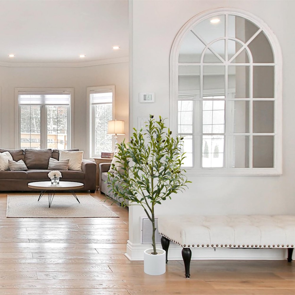 4ft Tall Artificial Olive Tree with Plastic White Pot, it very suitable for decoration with Fake Olive Plant. The trunk texture look like Nearly Natural, and the High Quality Olive Leaves and Fruits make the tree more perfect. There is wire inside the olive branch. When you receive it, you'll need to "fluff out" the branches to achieve its intended appearance. Indoor or Outdoor Decor: This Faux Olive Tree perfect to display in your Home(Living room, Bedroom, Big Entryway, Dining Room, Modern Decoration Indoors and Outdoors, Patio, Small Indoor Garden on Grass), Office or Store. This Artificial Olive Tree no Maintenance or water Needed, Cost Effective and Long Lasting, Non-toxic and No-allergies. Safety packaging: Our Fake Olive Plants are equipped with foam packaging to ensure safe transportation to your home.