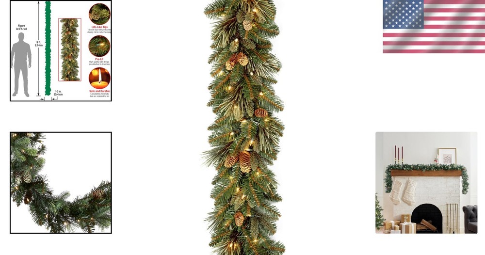 Size: 9 ft Color: Green Form: Garland Item Height: 108 Inches Plant Or Animal Product Type: Pine Product: Pre-Lit Christmas Garland Artificial/Fresh: Artificial Brand: Unbranded Number in Pack: Less Than 10 Unit Count: 1.0 Count Shape: Runner Item Length: 9 Feet Occasion: Christmas UPC: Does Not Apply gtin13: Does Not Apply Number Of Light Sources: 100 Common Name: Carolina Pine, Pine Type: Garland Global Trade Identification Number: 00729083945083 Item Weight: 3.97 Pounds Material: Mixed Materials, PVC, Glass, Wire, Metal, Pine, Pinecones Country of Origin: China Style: Battery Operated Included Components: Decoration