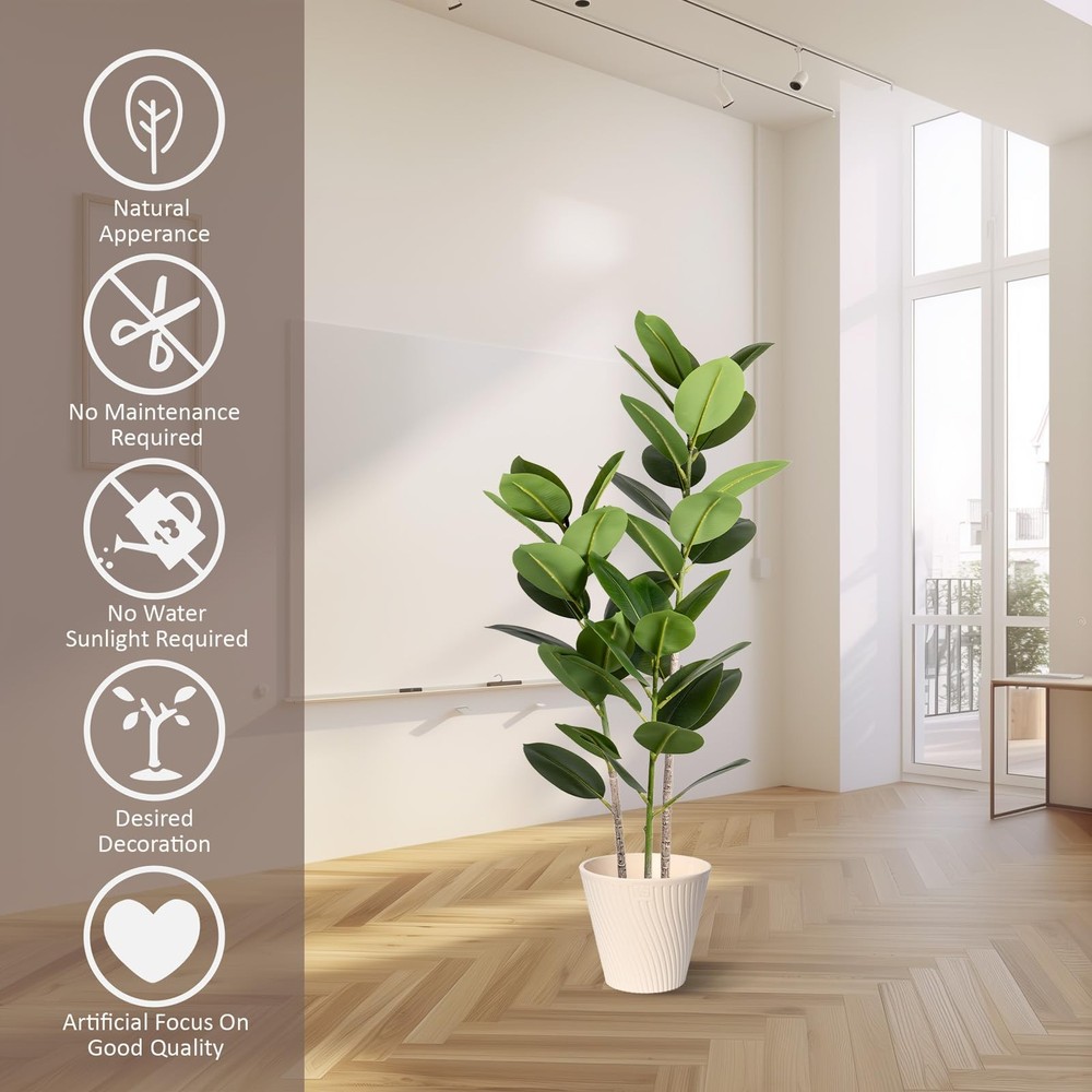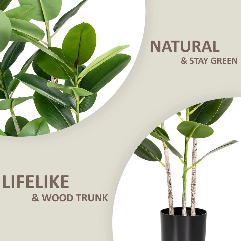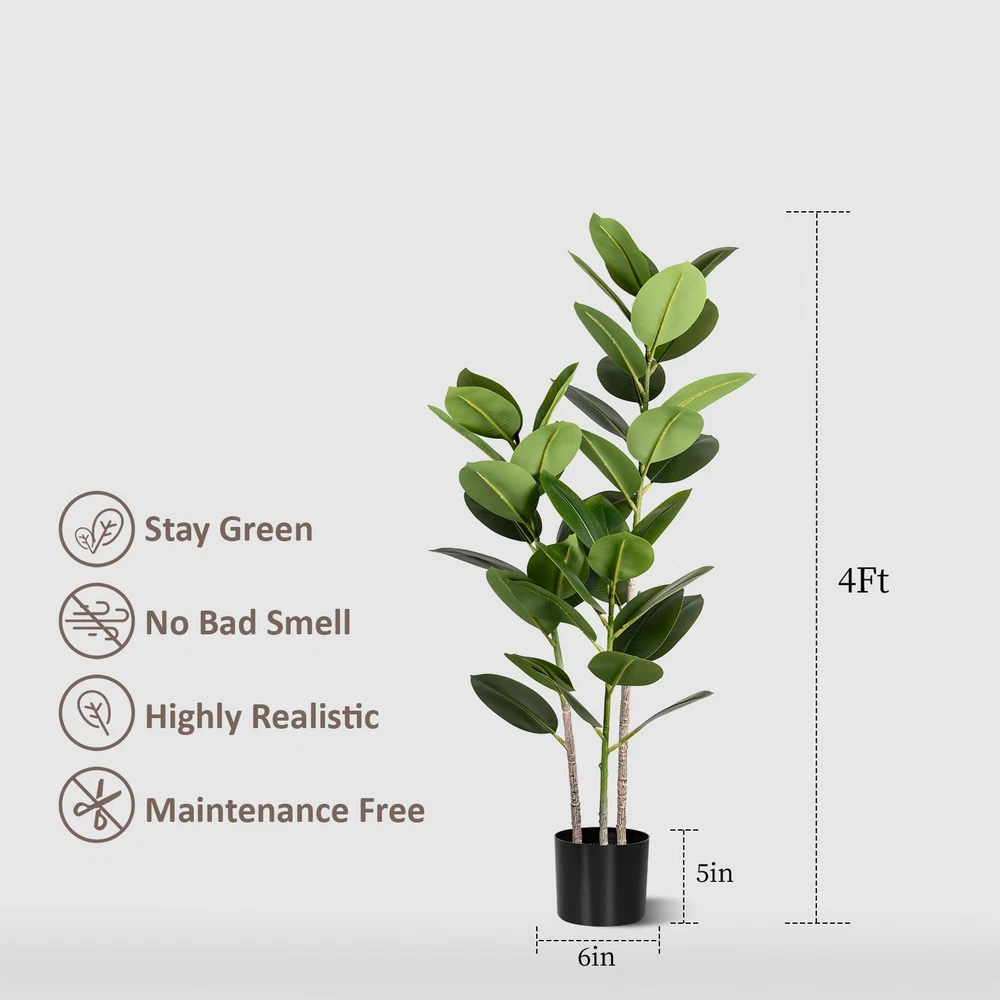 1 Premium Quality Construction: Carefully crafted to mimic the appearance of a real live rubber tree plant Stay Green All Year Round: Artificial trees will not wither because of the changes of seasons Stable & Sturdy: This faux silk tree is made of premium silk, polyester and soft metal wire, stable and sturdy Indoor & Outdoor Decor: Standing 4ft tall from the pot bottom to the top leaves, this artificial rubber tree is a perfect room decor piece Simple Installation: No installation is required, you just need to simply adjust the direction of the tree