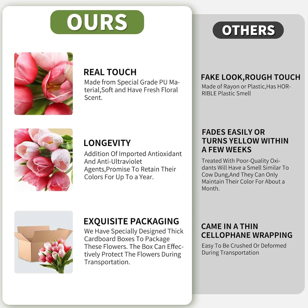 Store New Arrivals Add to Favorite View Feedback Contact Fast deliveries to the customer's home Quality customer service John Make the customers happy! Artificial Tulip in Bulk for Home Kitchen Wedding Bridal Bouquet,Fake Flowers for Valentine'S Day Mother'S Day Easter Table Centerpieces Decorations(Large Size,Multi Pink,Real-Touch,12Pcs) Description High-Quality PU Material:Our artificial tulips are made of high-quality PU material,providing a soft touch just like real flowers,the realism is impressive. Completely eliminating the issue of plastic or chemical smells,making the flowers more environmentally friendly and harmless to the human body. Larger Flower Size: The size of the blooming flowers has been increased to 2.4 by 2.6 inch inches,making them more eye-catching and realistic,this means they're now even more of a focal point in a room,whether on a table or as part of a bouquet.The total length of the flower and stem is 11 inches,they are soft and easy to cut,you can easily resize them to fit your vase.The package includes 15pcs tulips. What sets our tulips apart is their longevity. With the addition of imported antioxidant and anti-ultraviolet agents, these tulips promise to retain their colors for up to a year, ensuring lasting beauty in any environmental condition. Note: Artificial flowers without UV inhibitors will turn yellow within 2 weeks under sunlight, and those treated with poor-quality oxidants will have a smell similar to cow dung or burning plastic , and they can only maintain their color for about a month. Exquisite Packaging: We have specially designed thick cardboard boxes to package these flowers. The box can effectively protect the flowers during transportation,ensuring that each flower maintains a perfect state when it reaches your hands.This means that no matter where you order from,you can be sure that the flowers will arrive in good condition,without being squashed or damaged. Wide Applications: These artificial tulips are an ideal choice for home, office,or commercial space decoration.You can use them on kitchen counter,table or anywhere else.They can also be used as decorations or centerpiece bouquets for weddings and parties,or as festival gifts for friends and family such as Valentine's Day, Easter,Mother's Day,Christmas,New Year and so on.Moreover,they are great props for photography,adding visual effects to your scene. Product Description Tulip video detail display Real looking and real touch! big size :height:13.5in/35cm,diameter:6in/2.3cm.More real,biggtter than ordinary tulips. Flower are handmade :Very few flower may drop off, Even if it falls off, you can easily install it back. Real looking: Flowers are made of soft and true touch latex,full and soft petals,No smell,safe for people and pets. washable :After spraying water, the petals can condense water drops. Note: The vase is NOT included! The video showcases the product in use. The video guides you through product setup. The video compares multiple products. The video shows the product being unpacked. The video showcases the product in use. The video guides you through product setup. The video compares multiple products. The video shows the product being unpacked. Tulip video application scenario display Buart Tulip Features: Material :high-quality 3D printing latex+rubber rod+iron wire. DIY: The stem allows you to bend easily or cut shorter for DIY or fitting variety kinds of vases in a realistic way. Storage Method: Avoid direct sunlight.These flowers can maintain their color for at least a year. Special Packaging :Thick cardboard boxes ensure that each flower is not damaged during transportation. Wide Applications Valentine's Day Mother's Day For weddings bedrooms Spring Summer Autumn Winter Frequently Bought Together from Buart! Materials high-quality 3D printing latex+rubber rod+iron wire. Materials high-quality 3D printing latex+rubber rod+iron wire. Materials high-quality 3D printing latex+rubber rod+iron wire. Quantity 11 Quantity 11 Quantity 11 More white flowers to choose! Materials high-quality 3D printing latex+rubber rod+iron wire. Materials high-quality 3D printing latex+rubber rod+iron wire. Materials high-quality 3D printing latex+rubber rod+iron wire. Quantity 4 Quantity 4 Quantity 12 Unit Count 15.0 Count Room Type Kitchen, Living Room, Home Office, Dining Room Plant or Animal Product Type Tulip Color Multi Pink Special Feature Thick Cardboard Boxed Product Dimensions 2.4"D x 2.4"W x 15"H Material Polyurethane Specific Uses For Product Home Decor Item Weight 9.8 ounces Container Material Cardboard Number of Items 15 Indoor/Outdoor Usage Outdoor, Indoor Recommended Uses For Product Valentine's Day,Mother's Day,Wedding Bouquet,Table Centerpieces Decorations Package Information Box Seasons Summer, Spring Included Components Wrapper, Bundle Ribbons Scent Unscented Container Shape Box Occasion Valentine's Day,Easter,Mother's Day,Christmas ABOUT US We offer the best prices around on high quality products. Our E-store includes media such as books, movies, music and games while offering electronics, toys, sporting apparel, clothing, tools, general home, garden items and more. SHIPPING We are always working hard to ensure your package arrives as soon as possible. Please understand that some factors like weather, high postal traffic, and the performance of shipping companies are outside of our control. We offer free shipping to the lower 48 states and ship within 2 business days of payment, usually sooner. We do not accept P.O. Boxes. Please provide a physical address. For shipping outside of the continental USA, we only use eBay's Global Shipping Program. The item is shipped to KY and then sent to the rest of the world. International customers are responsible for all duties and taxes. Continue to 'check out' to calculate costs for shipping the item to your country. Messages regarding eBay's Global Shipping Program MUST be directed at eBay EXCLUSIVELY. RETURNS We offer a 30-Day Return P