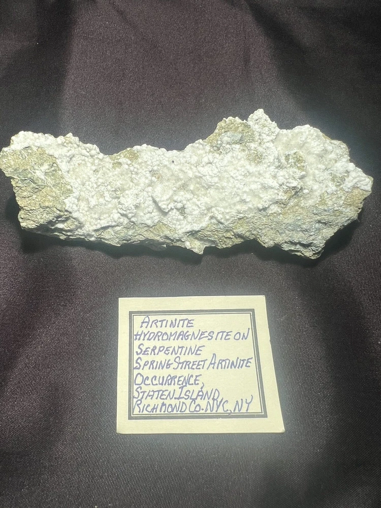 Here is a rare cabinet Artinite with Hydromagnesite on Serpentinefrom the Spring Steeet Occurance. Collected in the late 1960s and rare to find material!