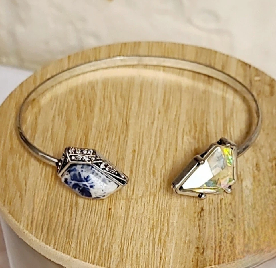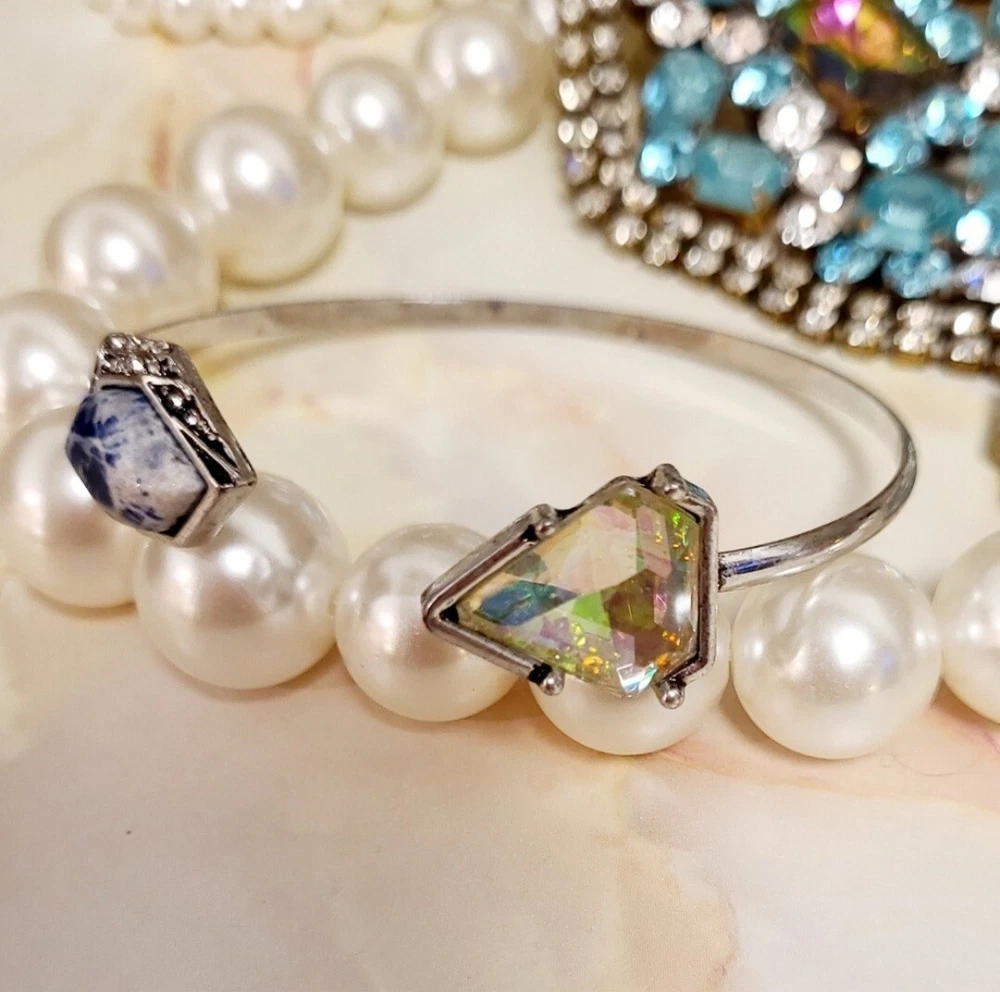 Elevate your style with this stunning Artisan bracelet, perfect for any nature-inspired outfit. The silver bangle is adorned with a beautiful blue Lapis stone and shimmering Aurora Borealis crystals, adding a touch of elegance to your look. Handmade with natural stones, this bracelet is a unique piece that will make a statement in any collection. The Artisan brand is known for their high-quality jewelry, and this bracelet is no exception. Whether you're dressing up for a special occasion or adding a touch of sophistication to your everyday look, this bracelet is the perfect accessory. This vintage-inspired cuff flaunts a slim silvertone band that is capped on either side by Lapis & sparkling crystal accent stones for glamorous allure. Simple yet elegant! 3" W Silvertone/crystal