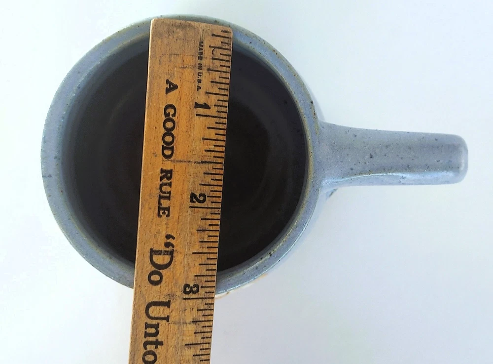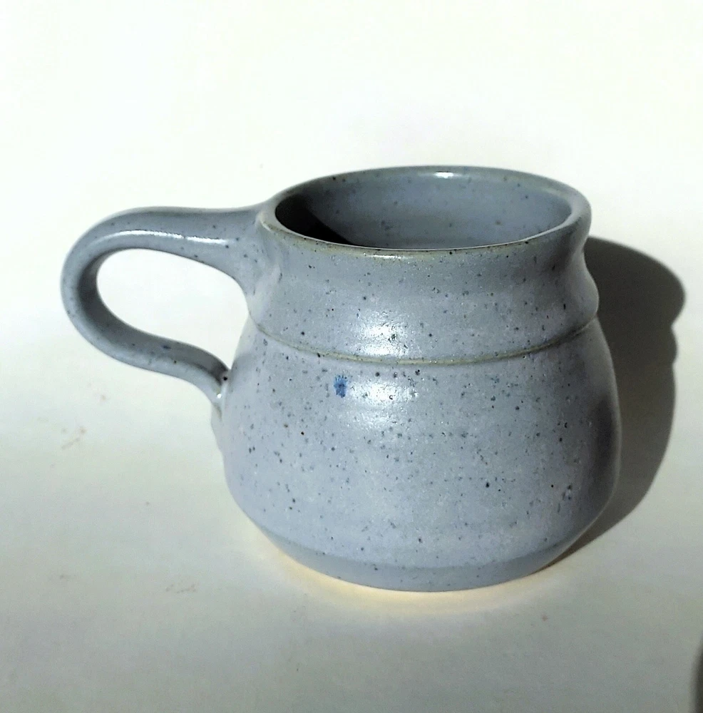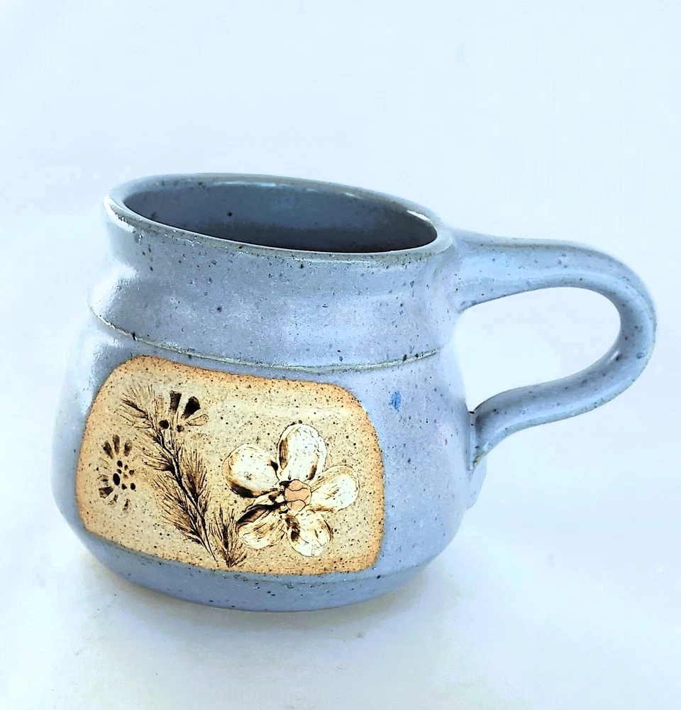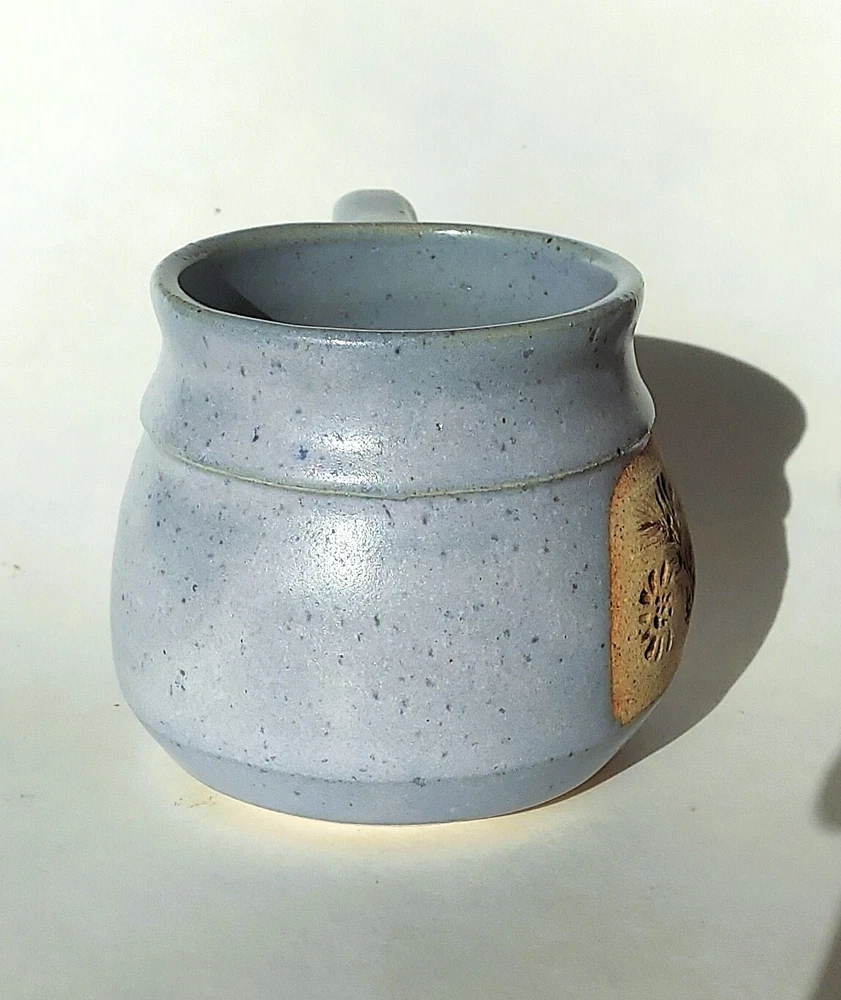 Artist signed rustic pottery mug. Periwinkle blue with imprint of leaves and flowers. Pre-owned - Very good condition. No chips, scratches, or stains. See photo as added description. Aprox. 3.5 inches tall x 3 inches in diameter. 5 inches across with handle.