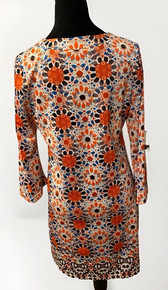 This Aryeh tunic dress in size S is a colorful addition to any wardrobe. The multicolored paisley pattern on a white background makes for a striking midi dress that is perfect for any occasion. Made with 100% rayon, this dress is lightweight and comfortable to wear. The shift style of the dress gives it a relaxed and casual feel, while the brand's attention to detail is evident in the quality of the fabric. This dress is a must-have for any woman looking to add a pop of color to her wardrobe.