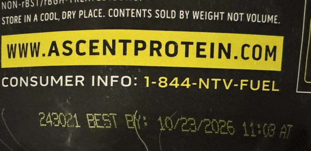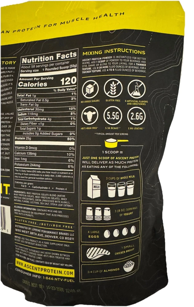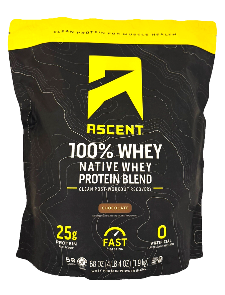 π« Ascent 100% Whey Protein Blend - Native Whey β Chocolate β 4.25 LBS β Clean, Post-Workout Recovery π¦ Whatβs Included: βοΈ 4.25 LBS (68 oz) of Ascent 100% Whey Protein Blend β Chocolate Flavor βοΈ 58 Servings per container βοΈ 25g of Protein per scoop βοΈ Fast-Digesting & Gluten-Free βοΈ Zero Artificial Flavors & Sweeteners π Why Choose Ascent Whey Protein? πͺ Premium Protein for Muscle Recovery β With 25g of protein per scoop, Ascent delivers the same amount of protein as 3 cups of whole milk, 3 servings of yogurt, 4 large eggs, or a small chicken breast. π₯ Clean & Pure β Made with Native Whey, the least processed whey protein available today, ensuring high purity and fast digestion. 𧬠Naturally Occurring Nutrients β Contains higher levels of naturally occurring leucine, a key amino acid that stimulates muscle protein synthesis. π± No Artificial Ingredients β No added sugars, artificial flavors, or sweeteners, making it a clean, guilt-free post-workout recovery shake. πΊπΈ Proudly Made in the USA β Ascent is committed to providing premium, clean products made in the USA. π§π€π§ Official Sponsor of Hard Work β Ascent Whey Protein is the official sponsor of athletes who push their limits every day. π« Flavor Profile: Indulge in the rich, creamy chocolate flavor that makes your post-workout shake a treat, not a chore! π Expiration Date: October 2026 β Fresh & ready to fuel your workouts for months to come! π§΄ Nutritional Highlights (Per Serving - 1 Scoop): 25g of Protein 5.5g of BCAAs 2.6g of Leucine 120 Calories Gluten-Free No Artificial Sweeteners or Flavors π₯ Perfect For: Post-Workout Recovery β Replenish your muscles after a hard workout with fast-digesting protein that your body craves. Daily Protein Boost β A convenient way to add clean protein to your daily diet, whether you're bodybuilding, gaining muscle, or maintaining lean muscle mass. Snack Substitute β A satisfying, nutritious snack that will keep you feeling full and energized. π Product Details: Brand: Ascent Product: 100% Whey Protein Blend (Native Whey) Flavor: Chocolate Weight: 4.25 LBS (68 oz) Servings: 58 Total Servings (1 Scoop = 25g Protein) Ingredients: Native Whey Protein, Cocoa, Natural Flavors Features: Gluten-Free, No Added Sugars, No Artificial Sweeteners Country of Origin: United States Expiration Date: 10/23/2026 π Why Buy from Us? π Fast & Secure Shipping β We ensure your product arrives safely and quickly. β Top-Notch Customer Service β Reach out anytime with questions or concerns. Weβre here to help! π¬ Love your Ascent Whey Protein? Leave a βββββ positive review to share your experience!