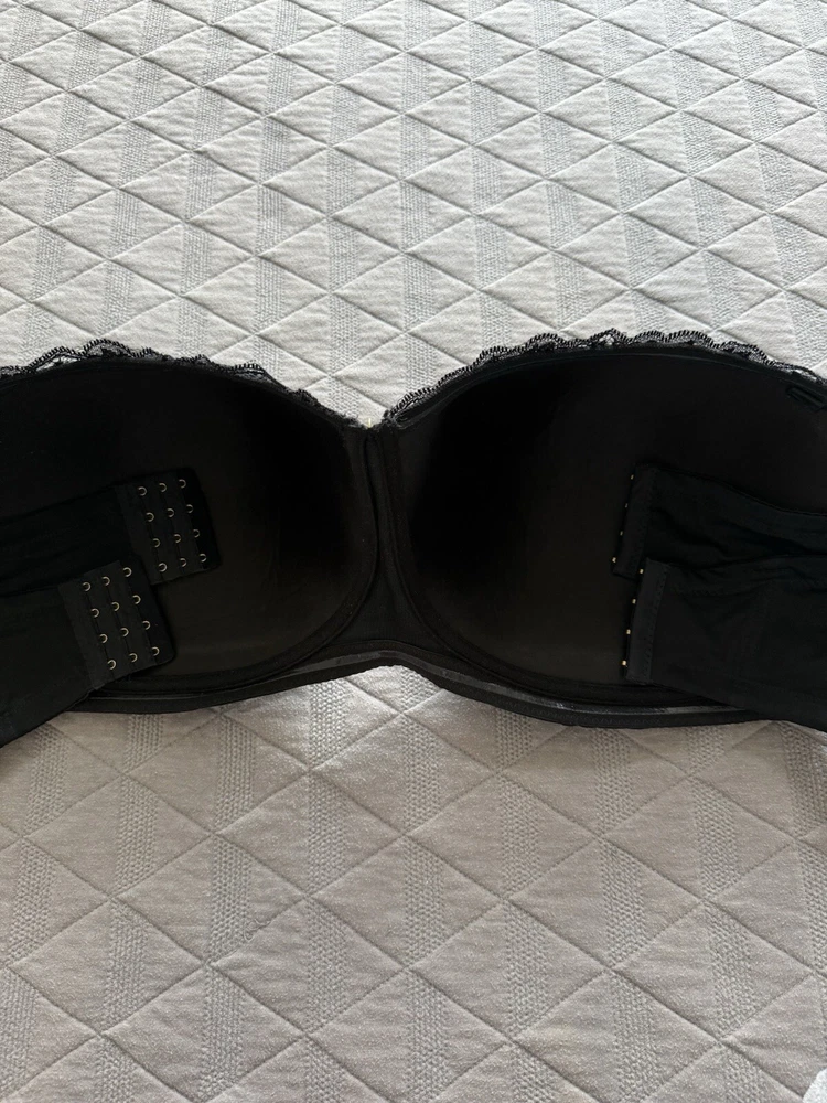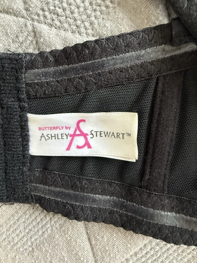 This Ashley Stewart strapless bra features a beautiful floral pattern in black color. The bra is designed with wireless support, padded cups, and a hook & eye closure. It is available in size 42H and is part of the Lane Bryant Cacique product line. This modern bra is perfect for any woman looking for comfortable and stylish support. No straps are included.