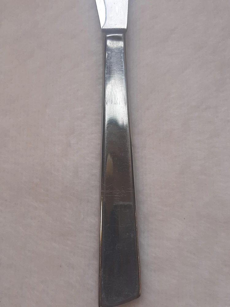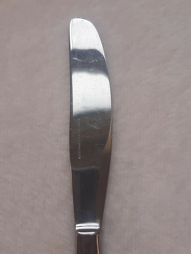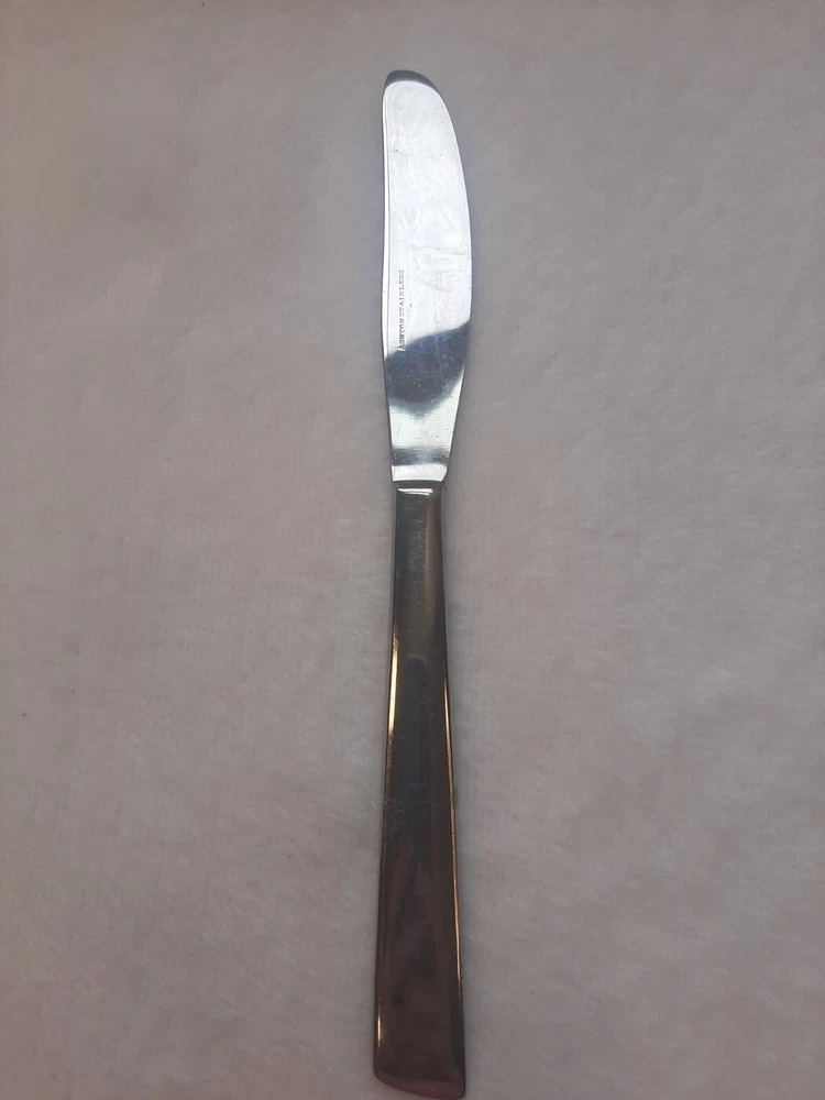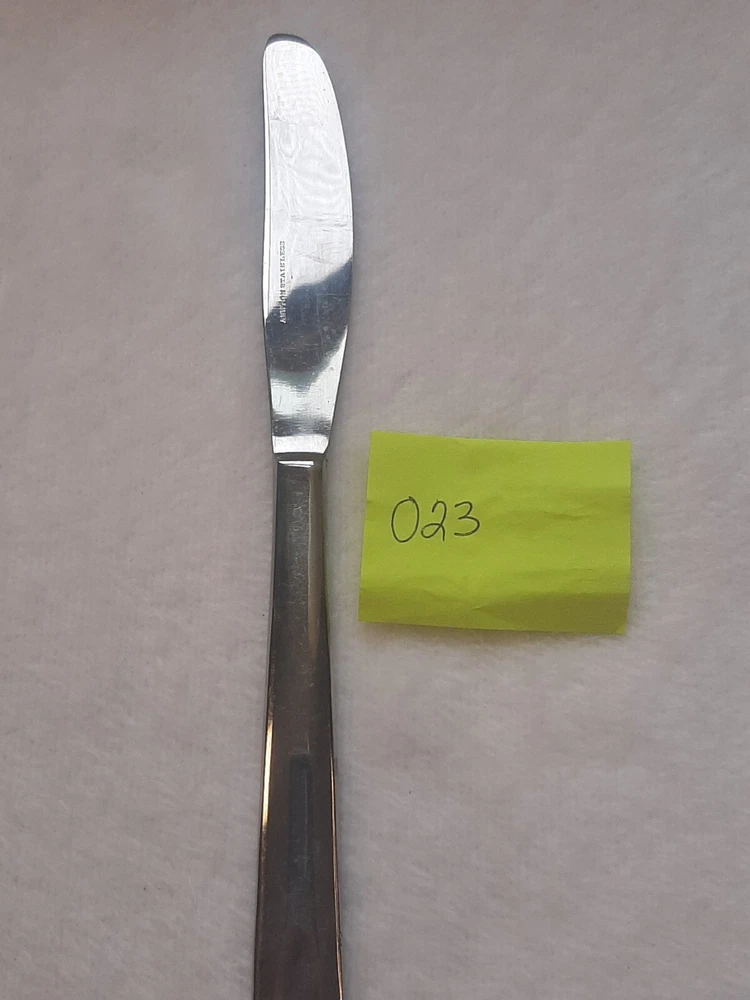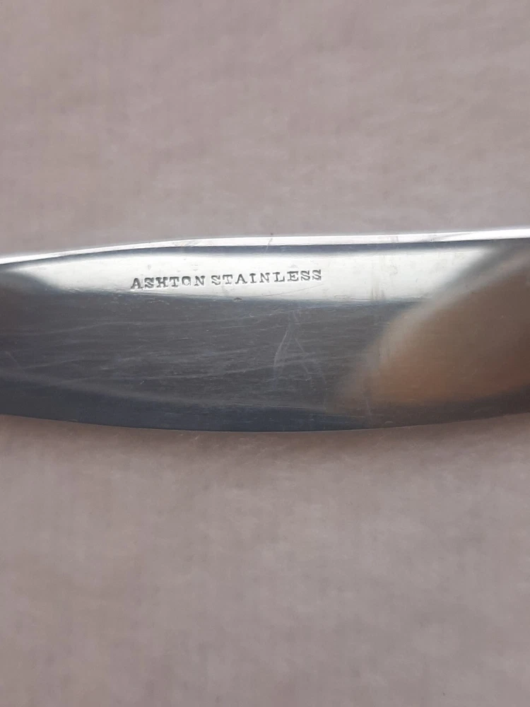 Ashton Stainless Steel Unknown Pattern Angled Tip Dinner Knife Flatware In good pre-owned condition may show signs of wear from use/handling/storage/display. Please view all pics for condition/details/flaws/issues. SOLD AS IS There is/maybe marks/spots/dirt/debris/rust please see photos 1-12, there is/maybe paint loss/sticker loss please see photos 1-12, there is lite discoloration please see photos 1-12, there are surface scratches to item please see photos 1-12, please see all photos for condition/issues/details.
