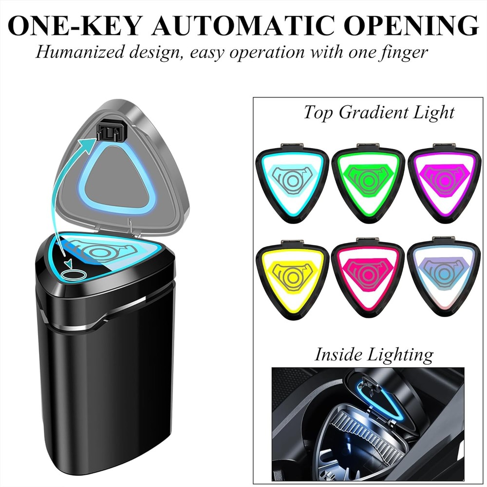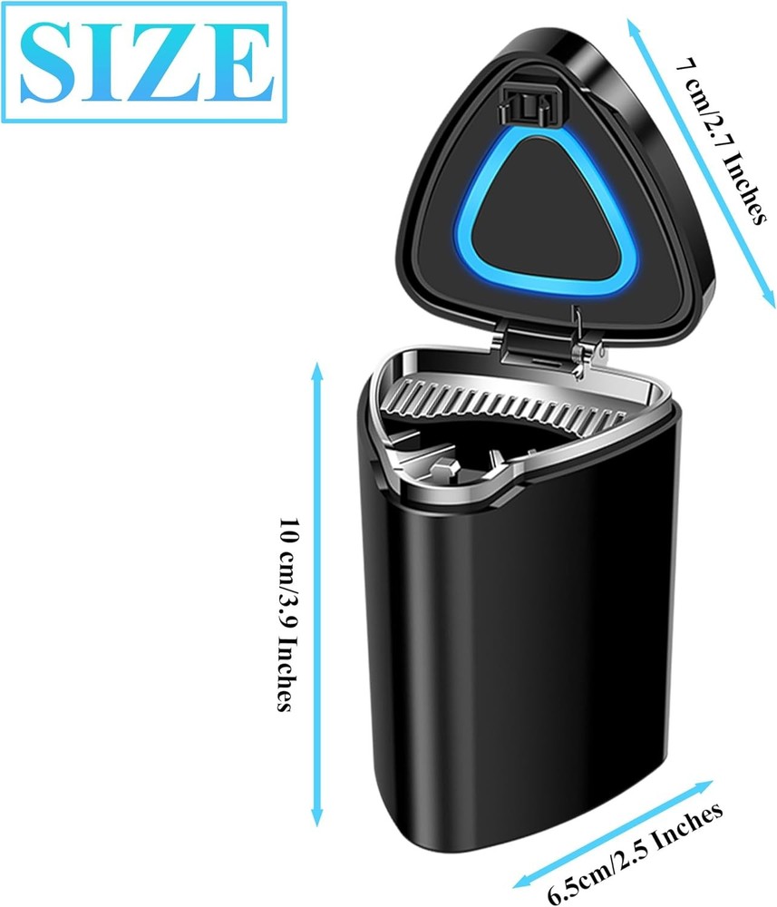 About this item PF Material: The car ashtray with lid is made of high flame retardant material, which is non-flammable and can isolate oxygen to help extinguish fire quickly. LED Night Light: Seven different colors of lights at the top will automatically switch colors when you close the lid. When you open the lid, the blue light inside will illuminate, providing easy visual access to the interior in dark environments. Unlimited Lighting: The ashtray features a built-in battery and USB charging cable, allowing for infinite cycles of cool lighting. A great gift for friends who smoke while driving. Specialty Design: Detachable for easy cleaning, with one large and one small cigarette holder to keep your hands free. Equipped with smoke extinguishing designs to quickly put out cigarettes. Multi-purpose: This ashtray is not just for cigarette ash; you can also use it for fruit peels, paper scraps, and other small waste. Portable and fits most car cup holders, making it ideal for both indoor and outdoor use in homes, offices, restaurants, hotels, gardens, parks, etc. Package Dimensions: 2.7"L x 2.9"W x 3.9"H