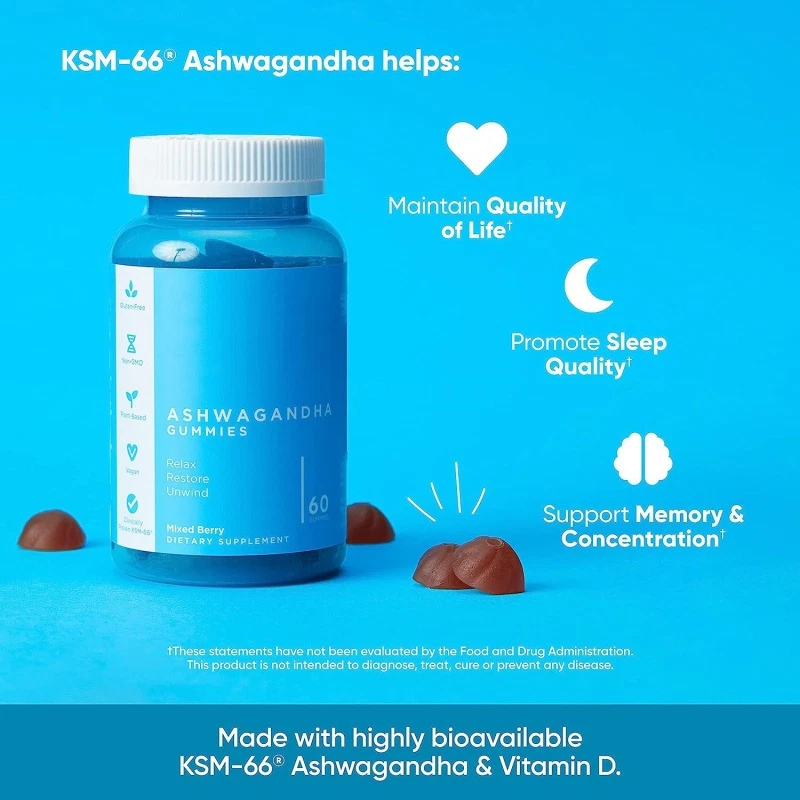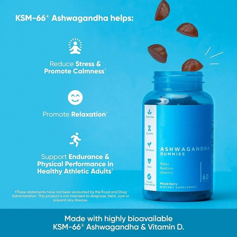 Our Ashwagandha Gummies are made with a unique blend of ingredients that support many incredible benefits! They're made with KSM-66® Ashwagandha Root Extract to help reduce stress & promote relaxation, promote sleep quality, support sexual function in women who need a boost, and support memory & concentration; and with Vitamin D to support a healthy immune system and more! Our Nutrition Ashwa uses KSM-66® Ashwagandha which is a highly concentrated Ashwagandha Root Extract unique to the market with various health benefits. Plant-based, Vegan, Non-GMO, Gluten-free, & Gelatin-free: Each bottle of Our Ashwagandha Gummies contains 60 delicious, vegan, non-GMO, gluten-free, & gelatin-free gummies. Made with powerful, full-spectrum KSM-66® Ashwagandha: Designed with a holistic approach, Our Ashwa Gummies are an easy and delicious way to incorporate the many wellness benefits of the ancient medicinal root extract, Ashwagandha, into your daily routine. Our Ashwa Gummies are made with KSM-66 Ashwagandha, a highly concentrated root only extract with extensive research behind it that supports various wellness benefits. Clinically-studied KSM-66® Ashwagandha KSM-66 Ashwagandha helps: Maintain Normal Cortisol Levels, Reduce Stress & Promote Relaxation, Promote Quality of Sleep, Supports Sexual Health in Those Whose Sex Life Needs a Boost, Support Physical Performance in Healthy Athletic Athletes, Support Memory and Concentration and Maintain Quality of Life. Complementary Ingredients, Great Taste: Along with KSM-66 Ashwagandha, our formulation team has included Vitamin D for healthy immune system support.* Our Ashwa Gummies are flavored with a delicious mixed berry profile. Satisfy your taste buds while you Relax, Restore and Unwind* with Our Ashwa Gummies!
