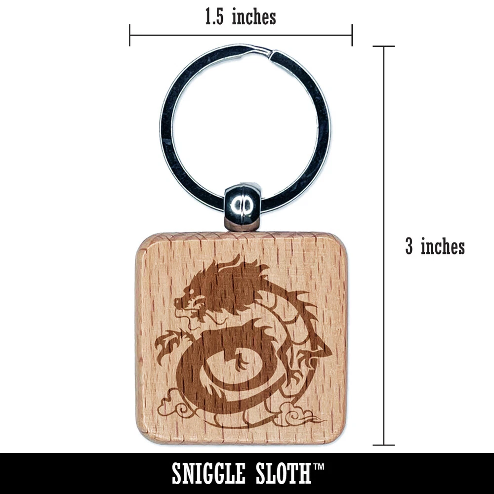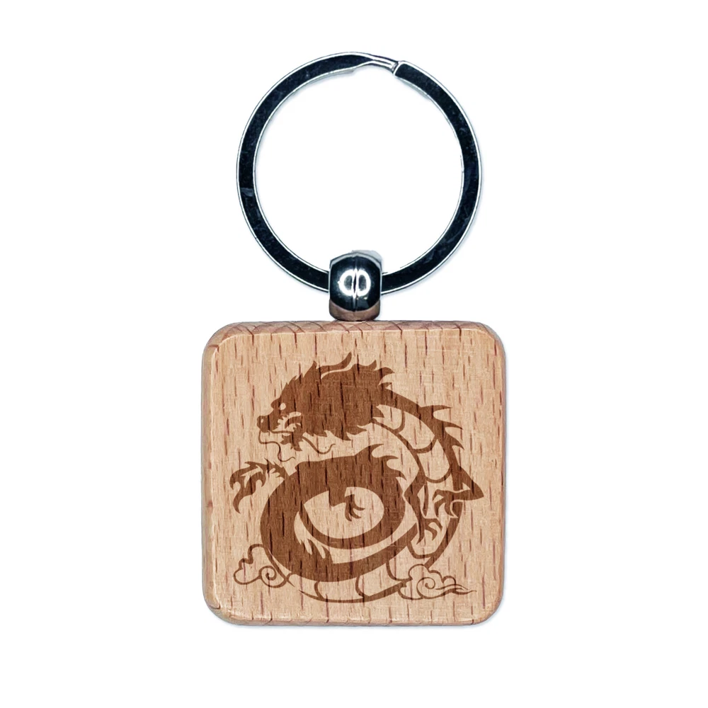 Asian Dragon Floating in Clouds Engraved Wood Square Keychain Tag Charm