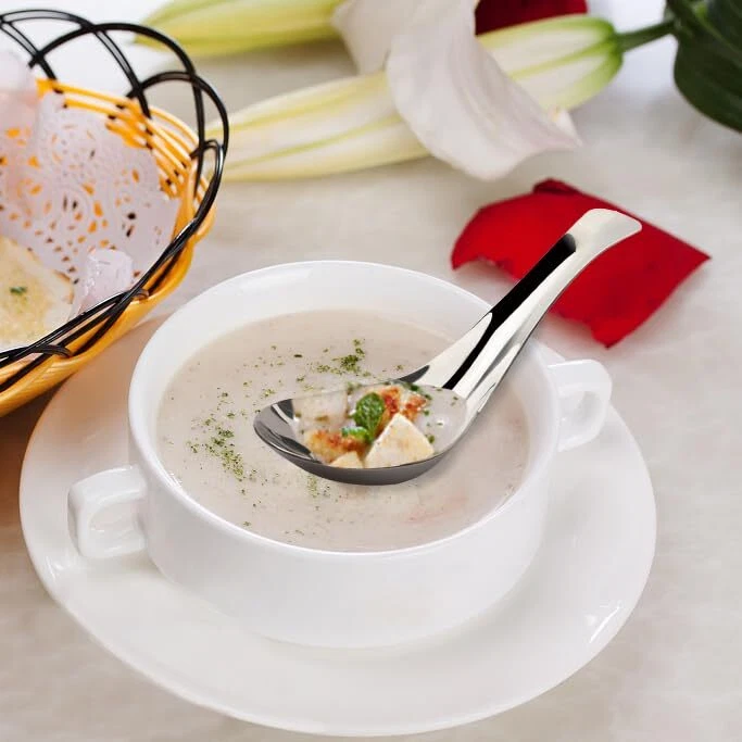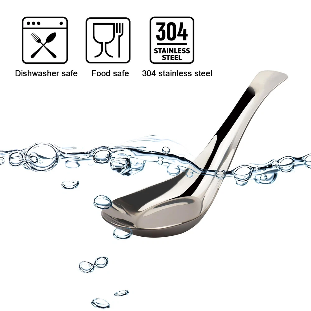 You will receive 6 pieces of soup spoons Perfect Size: measuring about 5.82 x 1.65 inches/ 14.8 x 4.2 cm, approx. 0.4 mm in thickness,perfect for family meals or dinner parties. Premium Quality: These chinese soup spoons made of high-quality thicken stainless steel,durable and resistant to rust and corrosion. Comfortable Grip The ergonomically-designed handle ensures a comfortable and firm grip, comfortable for you to pick and hold These wide spoon head is especially for ladling soup or ravioli, wontons dumpling and other large soup food. Of course, it also suitable for dips,desserts,cereal,stews,chicken/udon noodle,shrimp ramen and more. Perfect Size:you will receive 6 pieces of soup spoons, measuring about 5.82 x 1.65 inches/ 14.8 x 4.2 cm, approx. 0.4 mm in thickness,perfect for family meals or dinner parties. Premium Quality: These chinese soup spoons made of high-quality thicken stainless steel,durable and resistant to rust and corrosion,ensuring they last for years to come. Comfortable Grip: The ergonomically-designed handle ensures a comfortable and firm grip, comfortable for you to pick and hold, without scratching your hands.These wide spoon head is especially for ladling soup or ravioli, wontons dumpling and other large soup food. Of course, it also suitable for dips,desserts,cereal,stews,chicken/udon noodle,shrimp ramen and more. Easy to Clean: Smooth&polished surface of these soup spoons makes them easy to clean and maintain, also easy for you to clean with water or dishwasher,which can serve you for year.These kitchen spoons are stackable and easy to clean without bad smells or lingering odors after washing. Wide Applications: you can apply the Asian soup spoons for formal occasions, such as dinner banquets, festivals, weddings, parties, celebrations, family gatherings, restaurants and more, matching with your tableware, also nice gifts for sending to others.