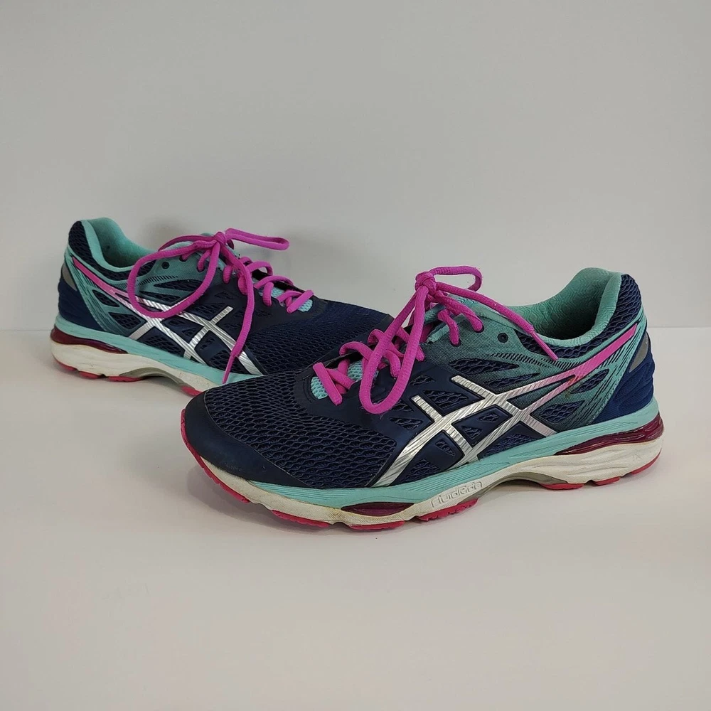 Asics Gel-Cumulus 18 - blue and pink Asics running shoes, women's size 9. They're in great condition, no holes, has small stain on the logo of left shoe (see pictures). Theyve been thoroughly cleaned before listing Please reference photos before purchasing