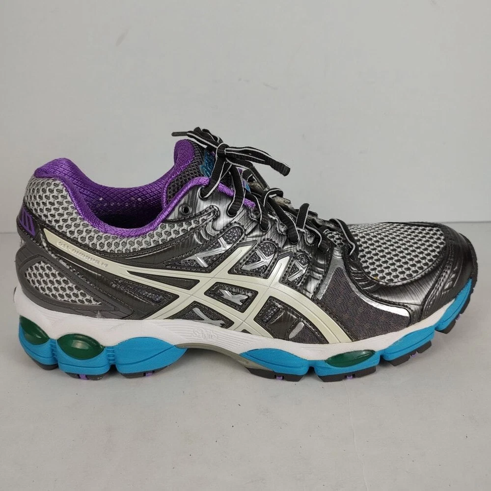 Asics Gel-Nimbus 15 - Grey/Purple/Blue Asics retro active casual running shoes, womens size 9. Theyre in like new condition, not worn at all Tread is unworn Theyve been thoroughly cleaned before listing Please reference photos before purchasing