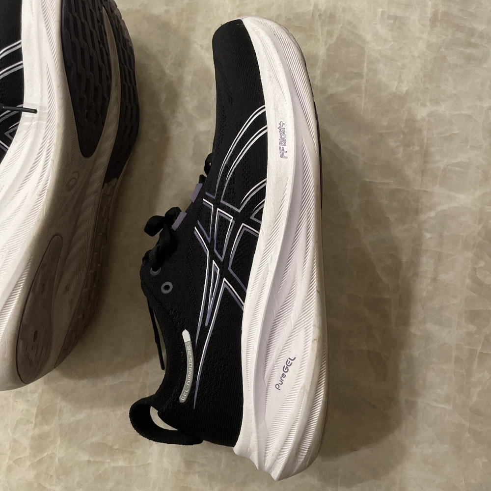Experience the fusion of performance and comfort with the ASICS Women's GEL-NIMBUS 26 Sneakers. Designed for the active woman, these sleek black sneakers with purple and white accents deliver a smooth ride whether you're running on the treadmill or hitting the streets. The low top shaft and lace-up closure ensure a secure and customizable fit, while the durable rubber outsole provides superior traction. Crafted for both avid runners and casual joggers, the US size 9.5 (EU 41.5, UK 7.5) sneakers hail from the acclaimed ASICS GEL-Nimbus product line, known for its exceptional support and cushioning. Please reach out if you have any questions. Thank you!