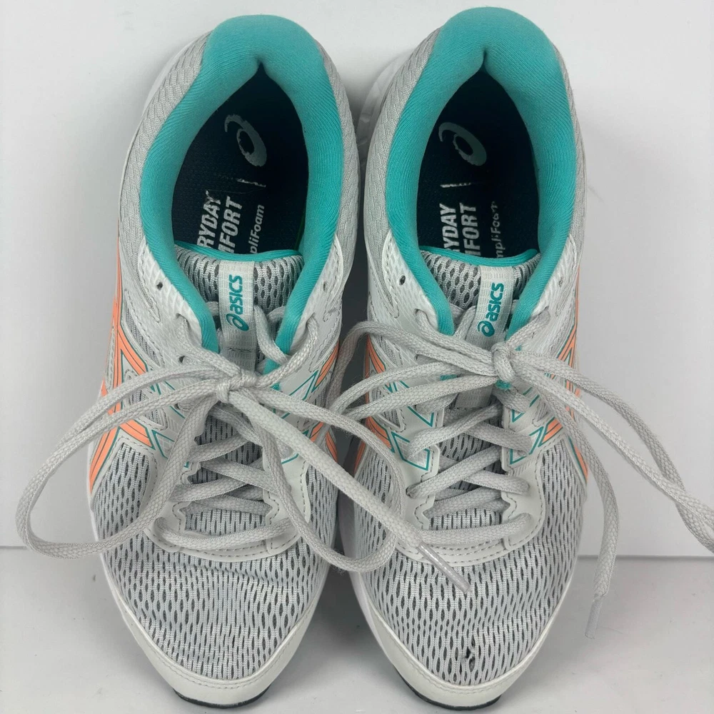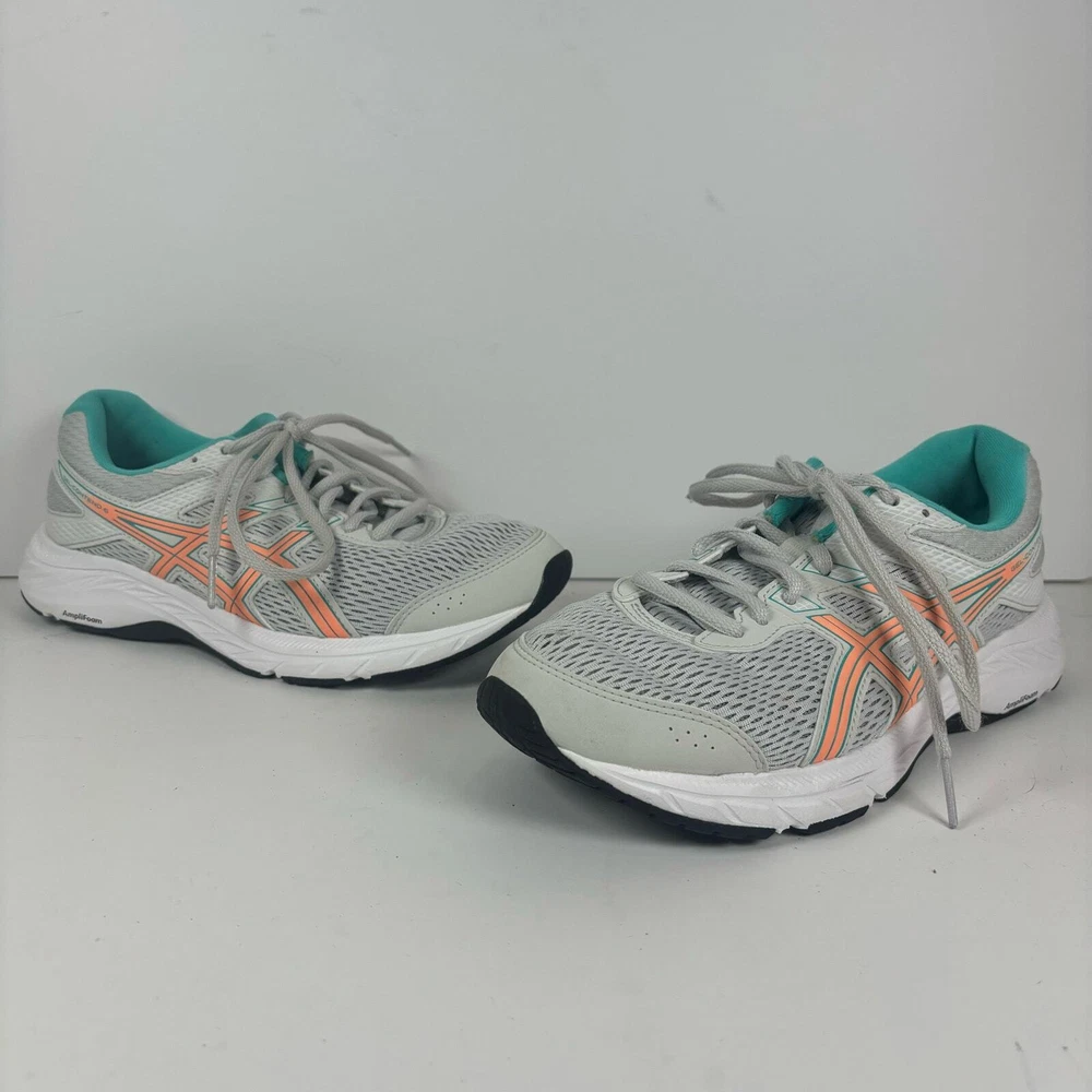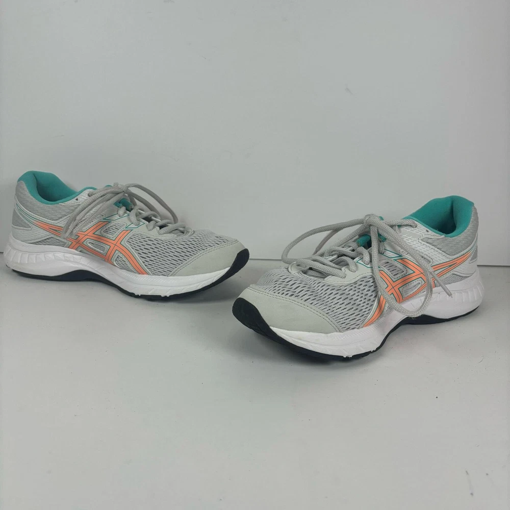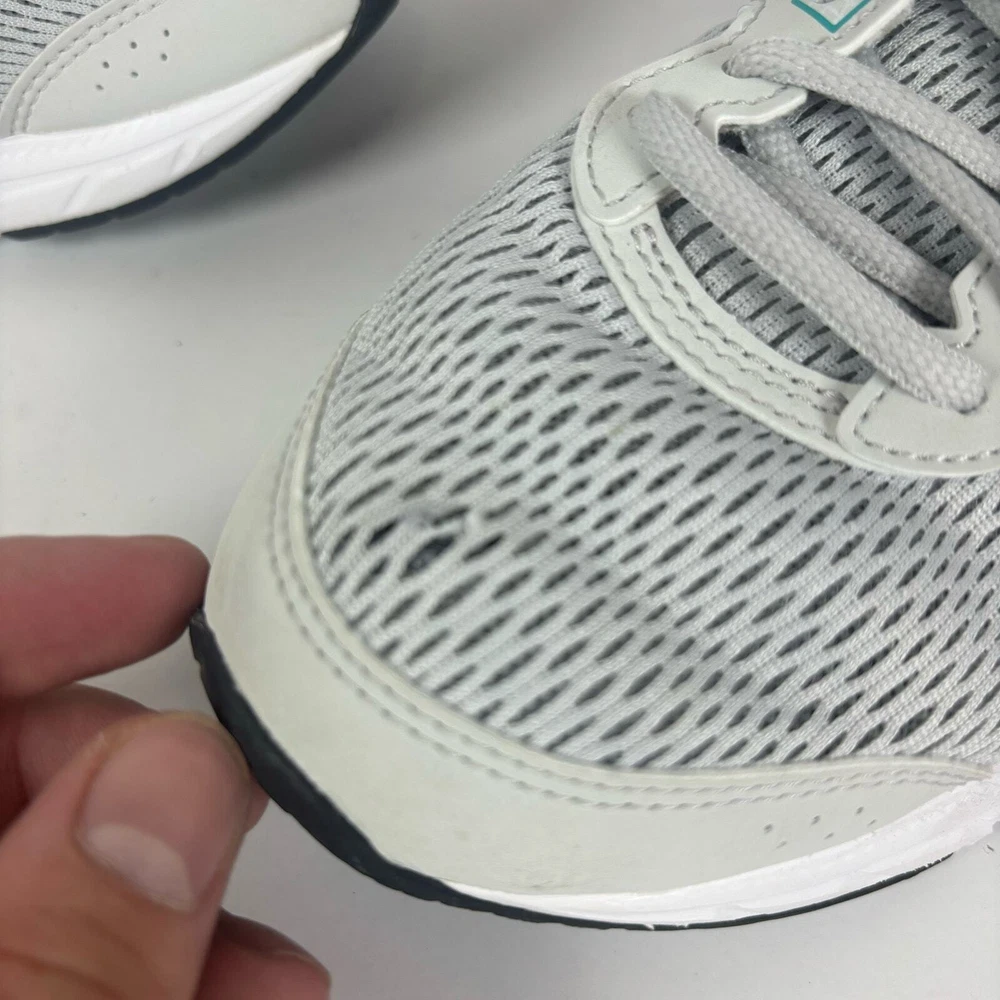 Light grey Asics running shoes, women's size 7.5. Has a little bit of damage on the toe of the left shoe (see pictures) but otherwise they're in great condition has been thoroughly cleaned before listing refer to pics before purchase as all defects are shown