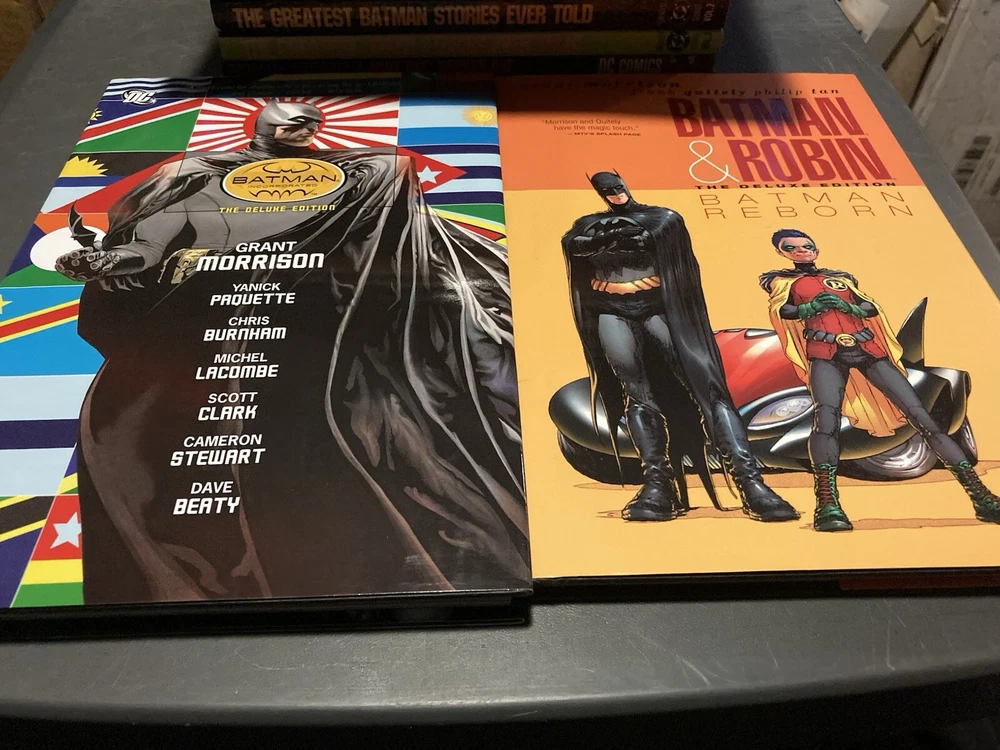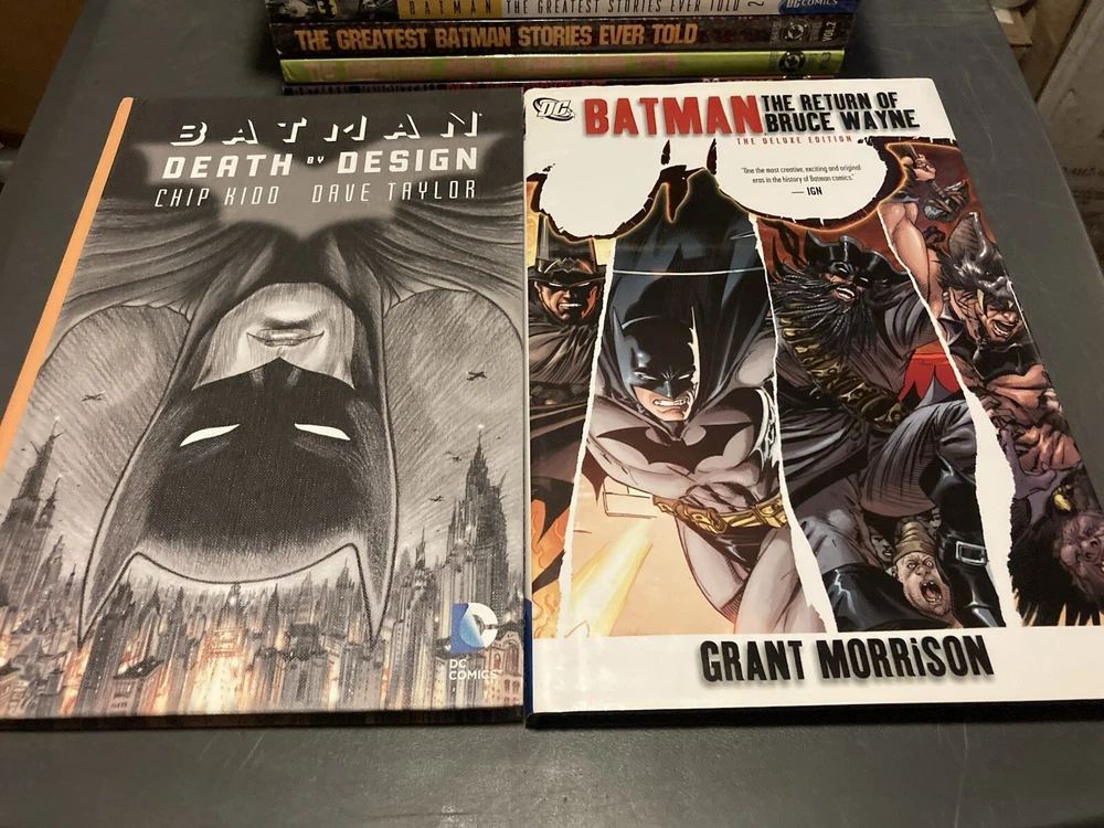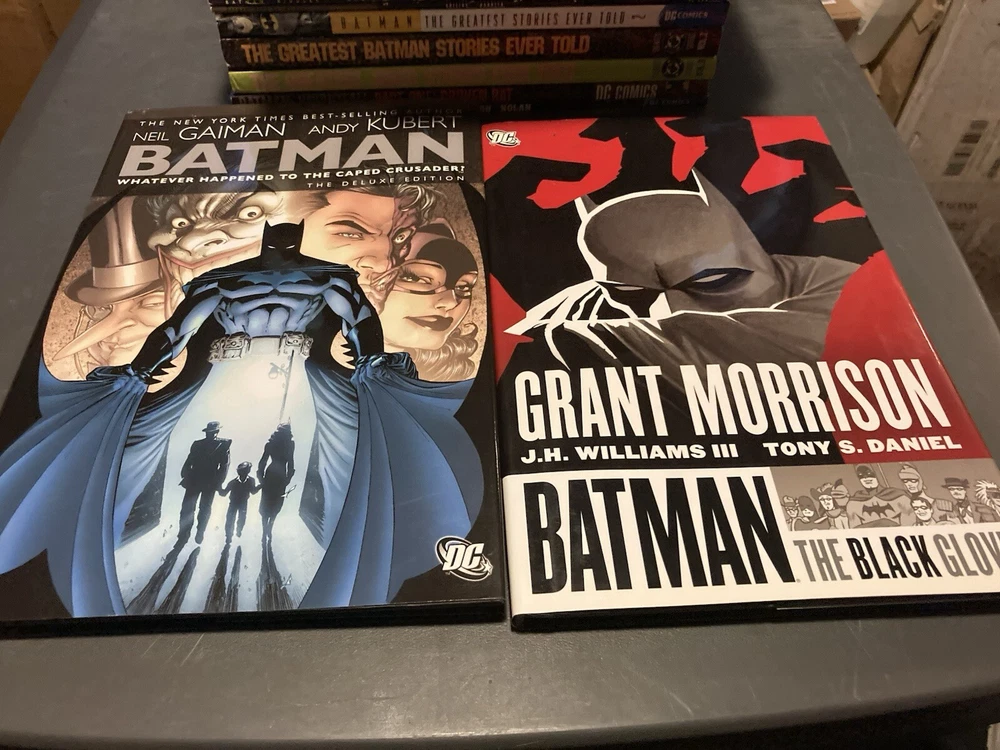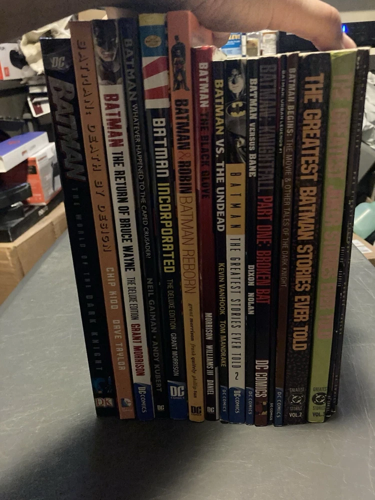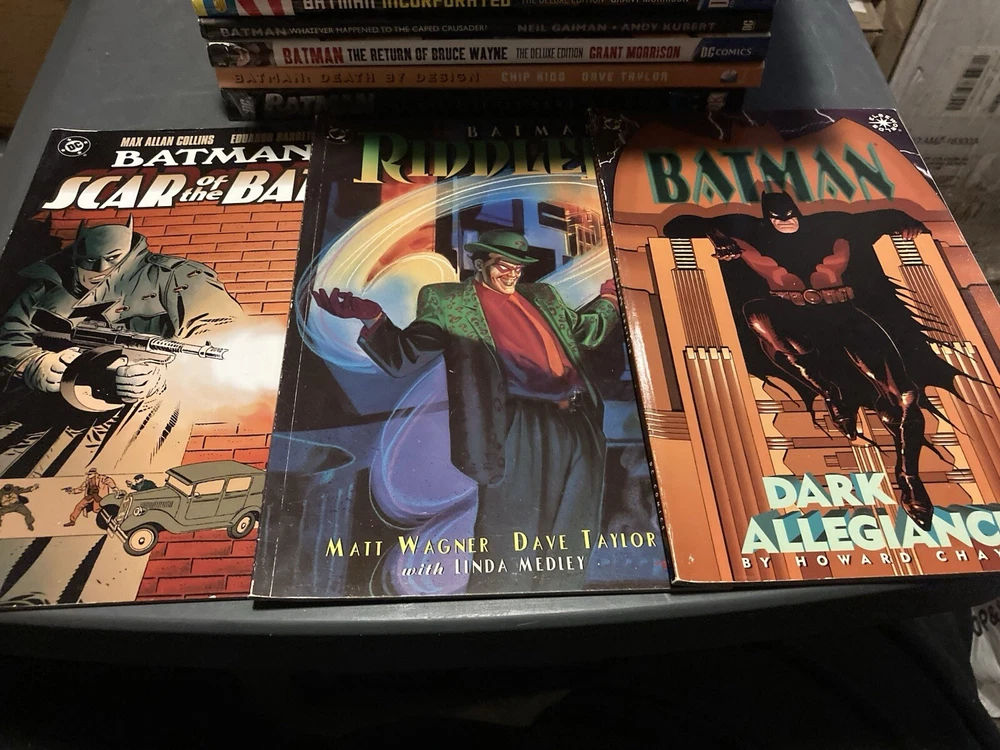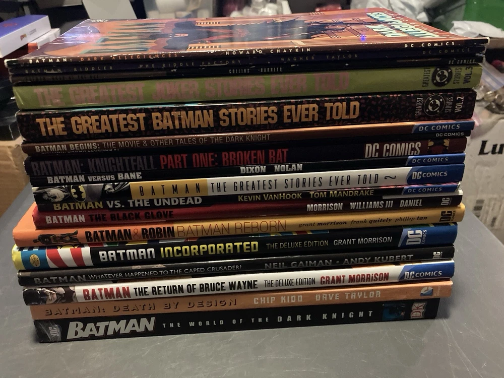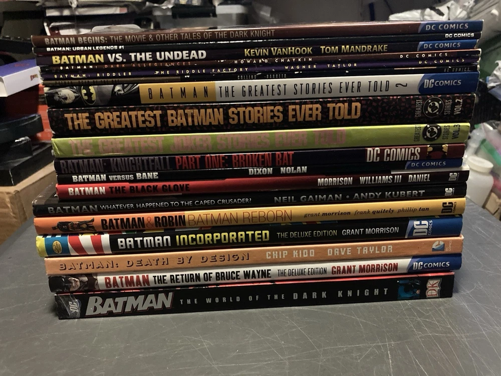 This lot of 18 Batman graphic novels and trade paperback comics from DC Comics features various artists and writers. The collection includes 7 hardcover and 11 softcover books, spanning different eras and universes within the DC multiverse. The titles include Batman (Bruce Wayne), Bane, Punisher, Riddler, and Two-Face (Harvey Dent), among others, and the superhero team Justice League of America. The graphic novels and comics are intended for a general audience and are written in English. The lot belongs to the Collectibles, Comic Books & Memorabilia, Comics, and Comics & Graphic Novels categories.