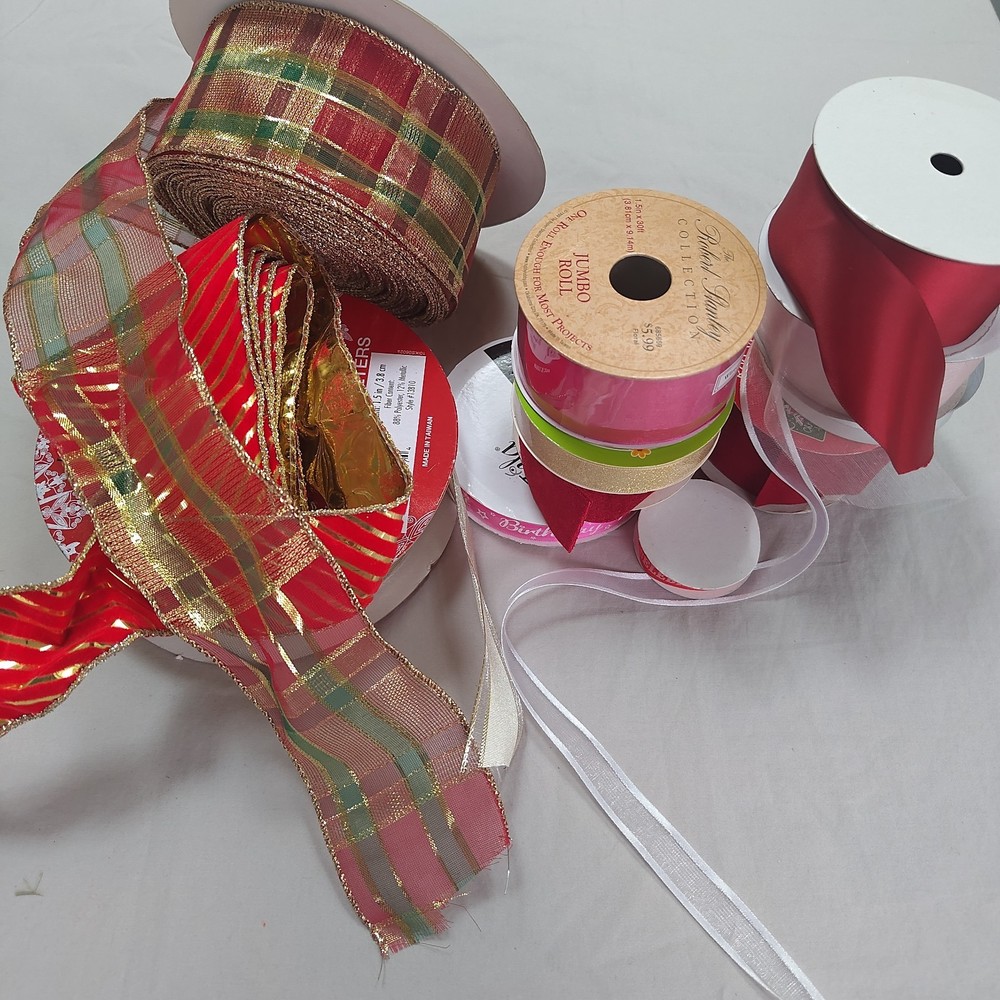 This product is an assorted mixed lot of 12 ribbon rolls, some partial and some new. The ribbons are modern and come in a variety of multicolor designs with a double-sided style. Additionally, some of the rolls are wire-edged, making them versatile for various crafting projects. Perfect for those looking to add a colorful and creative touch to their crafts, this lot offers a diverse selection of ribbon options to choose from.