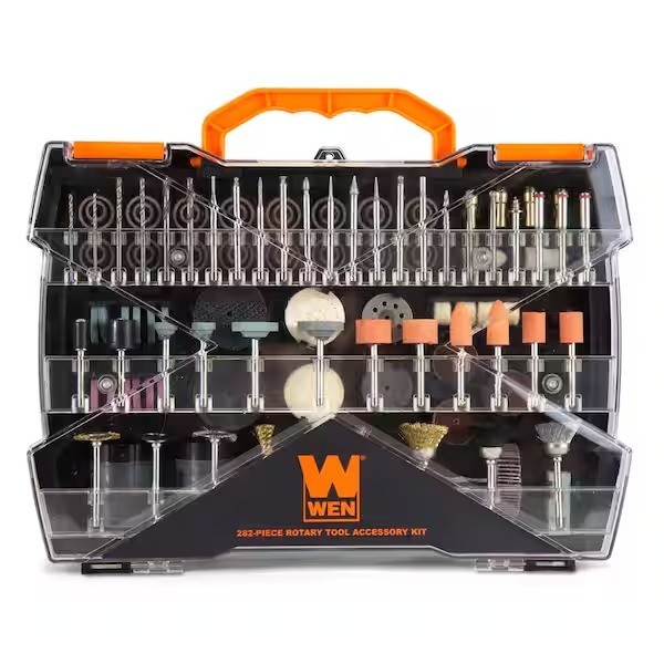 Assorted Rotary Tool Accessory Kit with Carrying Case 282-Piece for WEN & Dremel Description: Remember when you had the perfect companion for your WEN Rotary Tool, Grind, polish, cut, engrave, carve, sand and a bunch of other verbs all with the WEN 282-Piece Rotary Tool Accessory Kit. This assortment of bits, discs, brushes, drills and bands comes in an easy-to-organize carrying case, complete with onboard storage slots for each individual bit. Although this kit was created with the WEN rotary tool series in mind, the 1/8 in. shanks allow for compatibility with the majority of rotary tools on the market. This package includes 3 brass brushes, 3 bristle brushes, 3 stainless steel brushes, 10 diamond-coated bits, 6 silicon-carbide grinding discs, 6 aluminum-oxide grinding discs, 6 fiberglass cut-off wheels, 4 silicon-carbide grinding discs with shanks, 6 aluminum-oxide grinding discs with shanks, 6 high-speed drill bits, 3 high-speed cutters, 3 mandrels for cut-off wheels, a mandrel for felt wheels, 7 felt wheels, 32 spindle sanding bands, a rubber grinding wheel, 60 sandpapers, 2 sanding shanks, 80 cut-off wheels, 30 heavy-duty cut-off wheels, 4 collets (2-1/8 in., 3/32 in., 1/16 in.) a diamond-cutting disc, a flap wheel, a dressing stone, a wrench, a cloth wheel and a bottle of polishing compound. Remember when you could take on a variety of projects all with 1 accessory kit, Remember WEN. About Product: Features 282 accessories for sanding, carving, deburring, cutting, drilling, grinding, polishing, engraving, as well as many other verbs. Wire-bristled brushes work great for rust removal, paint stripping, pumpkin carving and more Grinding discs and bits perfect for sharpening knives or trimming dog toe nails. Includes diamond-coated metal bits, HSS cutters, sanding discs, cutting discs, spindle sanding bands, buffing wheels, drill bits, polishing paste and more. Compatible with the WEN rotary tools, as well as any other rotary tool that accepts bits with 1/8 in. shanks.