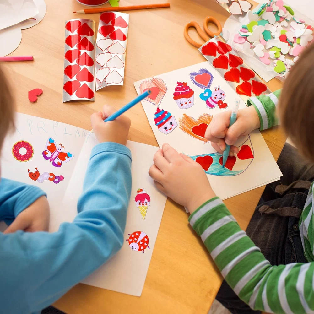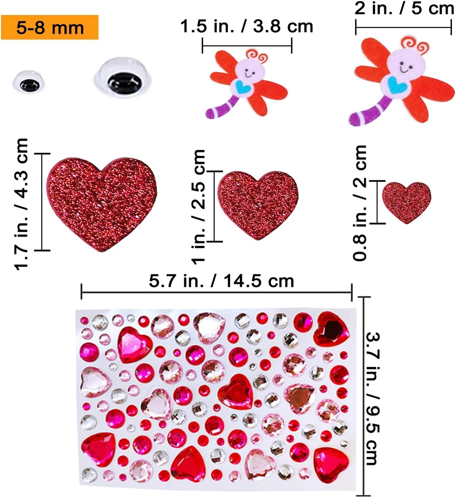 Bulk Valentine's Day stickers embellishments assortment, including 188 pcs Valentine's Day printed felt cutouts stickers, 60 pcs glitter foam heart stickers, 160 pcs self-adhesive black googly eyes, and 1 sheet of Valentine Rhinestone Stickers. Enough quantity for kids classroom crafts project. Color: Felt Valentine Stickers feature design of hearts with smile face or assorted patterns, animals like owl, ladybird, dragonfly, bee, caterpillar, butterfly, and desserts like cupcake, ice cream, donut, cookie, and drink in bright colors. Glitter Heart Foam Stickers are in red, pink and white. Size: Valentine Self-Adhesive Felt Shapes measure appr. 1.5"-2" in diameter, 2mm in thickness. Foam Heart-Shaped Stickers measure appr. 0.7", 1", 1.6" in diameter. Black Googly Eyes are available in 2 sizes, appr. 0.2" and 0.3" in diameter. Material: Valentine Felt Stickers are die cut from felt and clearly printed with assorted Valentine designs, Self-Adhesive Foam Shapes are die cut from EVA foam. Felt Stickers and Foam Stickers are coming with an adhesive back that makes application easy. You will need some sweet shapes for kids' Valentine's Day crafts and art projects. With these soft and self-adhesive felt stickers, kids can easily add personal touch to Valentine cards, invitations, scrapbooks, planners, notebooks, picture frames, banners, bunting, fliers, posters, journals, gift wrap, Valentine tree, table scatter, and more! Great to be used in and out of the classroom. Copyright (c) Winlyn. Product Description A Lovely Addition to Kids' Craft Supplies. These love decorative stickers are lovely addition to kids' craft supplies. Assorted Felt Stickers and Black Googly Eyes Embellishments Craft An Assortment of Valentines Shapes: Felt Valentine Stickers feature design of hearts with smile face or assorted patterns, animals like owl, ladybird, dragonfly, bee, caterpillar, butterfly, and desserts like cupcake, ice cream, donut, cookie, and drink in bright colors. Glitter Heart Foam Stickers are in red, pink and white. Kids can add googly eyes to the stickers for a increased lively dimension and texture! These decorative stickers are ready to add romantic flair to your Valentine's Day. Add a Sweet Touch to Kids' Craft Projects: Add a sweet touch to kids' craft project with this Valentine's Day Sticker Assortment. Featuring self-adhesive backing and soft material, they are excellent for children's activities in and out of the classroom. Kids can have a blast personalizing Valentine tree, Valentine cards, invitations, scrapbooks, planners, picture frames, banners, bunting, notebooks, fliers, posters, journals, diary, corkboard, labels, gift wrap, gift tags, cake toppers, treat bags, water bottles, mason jars, laptops, and more, the possibilities are endless! Fun for All Occasions: Lovely and festive, these Self-Adhesive Valentine's Day Stickers are perfect for all occasions that need a bit of sweetness, they are great for kids' Valentine's Day party, birthday party, classroom activity, at-home activity, camp, playroom, scout group activity, rainy day activity, wedding decorations, baby shower and so on. WARNING: CHOKING HAZARD Small parts. Not for children under 3 years. AGE RECOMMENDATION:6 & up Copyright (c) Winlyn.