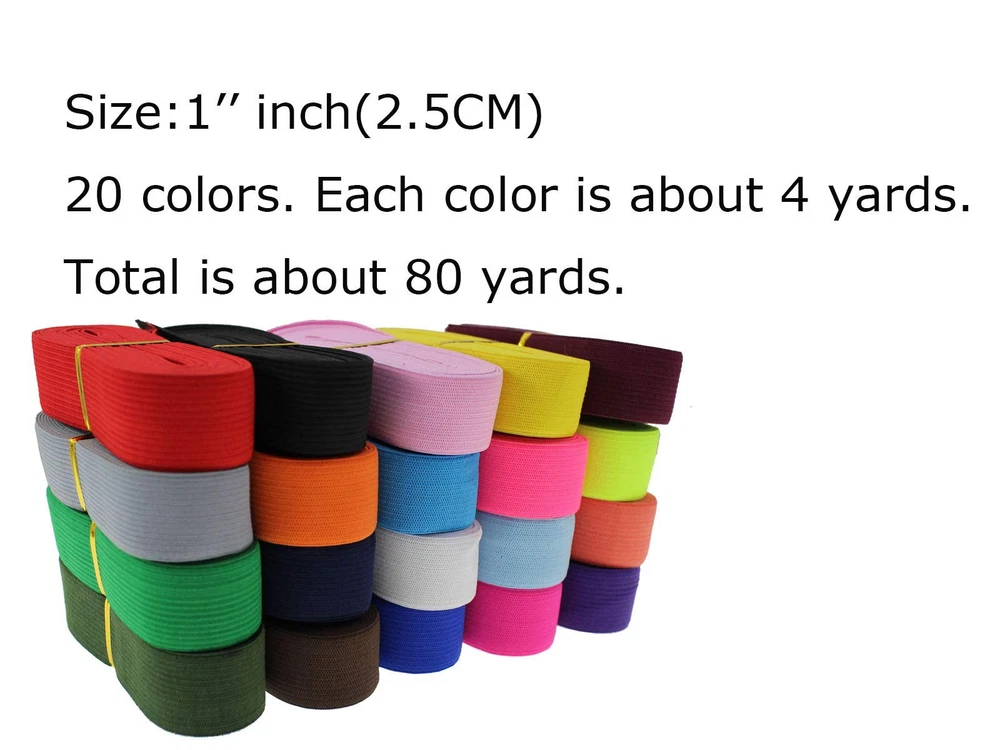 Feature: The elastic band is is made of high-quality elastic fiber material, which makes it more durable and practical, and has good flexibility and strong elasticity.It is good choice for sewing and knitting. It can be used for swimwear,underwear, pants, baby clothes, sportswear,T-shirts, hats, socks and the other DIY items, etc. Advantages: It looks very clear and more resilient and comfortable than most types of elastic bands.It is environmental. Package includes: 20 Bundles 20 colors 80 yards cord 【Material】:The elastic band made from premium quality polyester fabric and fiber rubber; elastic ; Breathable, machine-washable, Colorfast ; NO ironing; Exceptional quality. It is softer and has great stretch to it. 【Versatile Use】:This Elastic Band are Great for hats, waistbands, shoelaces, belts, hair ties, necklines, shorts, skirts, sleeves, leggings, swimwear, headbands, laces, wig bands, journal loop ties, hats, bags, or jewelry making; Strong stretchy cord for sewing fitted sheets, or sofa slipcovers 【Elastic width】:1inch wide elastic flat band, making it ideal for medium to larger garments, providing a sturdy, thick elastic band to fit a variety of garments. It's the ideal width for many sewing applications, ensuring a professional finish every time.1inch-25mm, 80 yards, each color is about 4yards. 【Easy to Use】 Our sewing elastic band is easy to work with. It can be easily cut to the desired length and sewn into your project. It will not fray after or cutting, you can cut out the elastic band to any length you desired and sew the elastic band fabric easily 【Feathers】:Our Elastic Stretchy Spool has good flexibility and strong elasticity,It looks very clear and more resilient and comfortable than most types of elastic bands.It is environmental.
