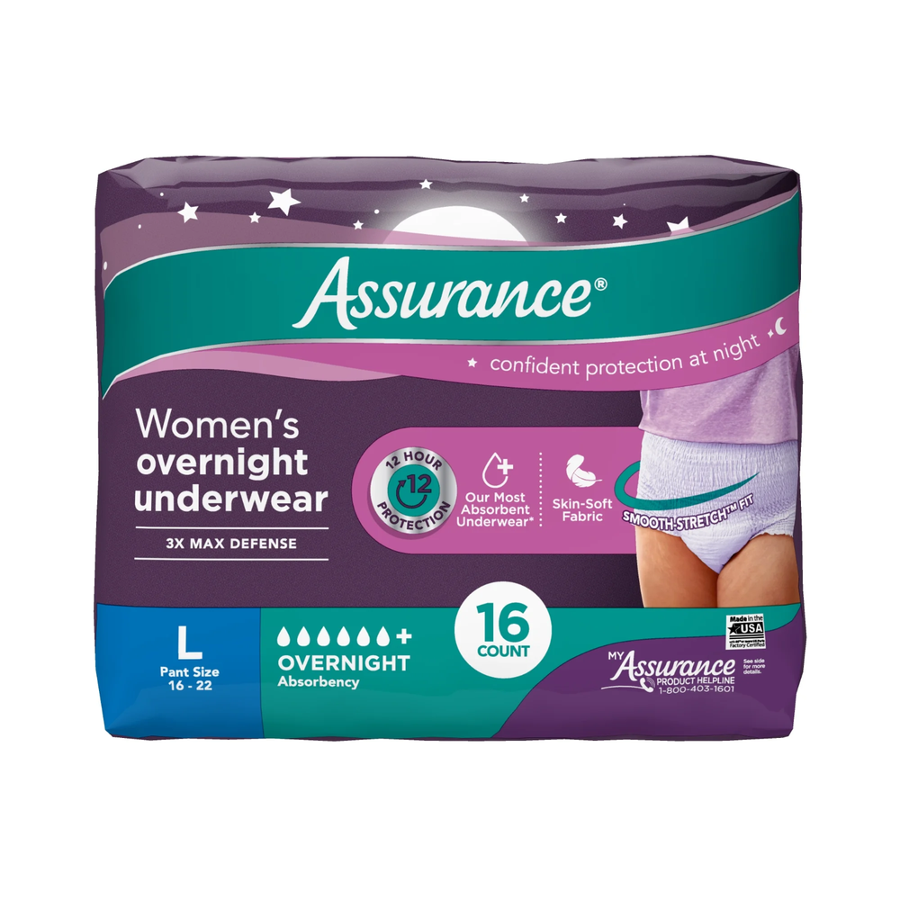 The Assurance Women’s Overnight Incontinence Underwear, Size L provides up to 12 hours of maximum overnight absorbency and is praised by users for its comfort, reliable leak protection, and good value compared to name brands. The large size fits pant sizes 8-16, or a waist of 38 to 50 inches. Key Features and Benefits Overnight/Maximum Absorbency: Designed for a full night's sleep, it offers a high level of absorbency to lock away moisture and keep skin dry for up to 12 hours. Comfortable Fit: The underwear features a smooth-stretch, contoured design for an underwear-like fit and feel. The material is 100% breathable and soft, which promotes skin health and reduces irritation. Odor Control: Omni-Odor Guard technology is included to neutralize odors, providing discretion and confidence. Sizing: The size large is designed to fit women with a waist measurement of 38 to 50 inches in diameter, which corresponds roughly to pant sizes 8-16. Use Cases: Ideal for heavy overnight leakage, general incontinence management, and postpartum care.