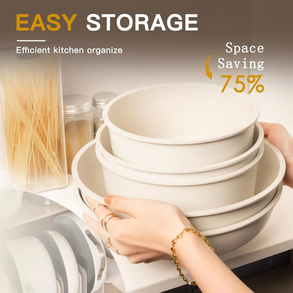 Astercook 21 Pcs Pots and Pans Set Non Stick, Ceramic Cookware Set Detachable Handle, RV Kitchen Cooking Set Removable Handles, Oven Safe, Induction Ready, Stackable Non-stick Set, Cream White Item Description About this item 【High-Performance Nonstick Coating】 Equipped with a premium nonstick coating, our pots and pans offer exceptional durability and performance. Easy to clean and free from harmful chemicals like PFOA, it ensures a healthier cooking experience. 【Secure Removable Handle】Cookware set features a cutting-edge removable handle with a secure locking mechanism. This ensures a stable and reliable grip during cooking, so you can cook with confidence every time. 【Convenient Storage and Cleaning】 The detachable handle design saves valuable storage space and simplifies cleanup. Easily remove the handle for a quick and thorough wash, keeping your cookware and kitchen spotless. 【Versatile Compatibility】 Pots and pans sets are suitable for a wide range of heat sources, including induction, gas and ceramic hobs. Ensure that the cookware sets are uniformly heated in a stable and efficient manner under all cooking conditions. 【Durable Construction & Quality Service】 Made of high-quality aluminum, both the pot itself and the removable handle have been rigorously tested to ensure durability and stability over long periods of use. When you buy our brand, you will get reliable products and attentive after-sales service. › See more product details *The smooth interior surface makes it very non-stick. You can effortlessly cook your favorite dishes without worrying about food sticking to the pan. *You need less oil for cooking and less water for cleaning. You can better protect the environment and keep your body healthy. *A must-have set of Astercook non-stick cookware sets for fitness professionals, which can help you cut down on fat intake. *Hand washing is recommended. Dishwasher detergents are highly corrosive and can damage the aluminum structure on the bottom of the cookware, dishwasher use is not recommended. *Do not use metal utensils for cooking and do not use steel wool for cleaning. Clean with soap, water, soft sponge, then wipe with film oil. *Cook over medium heat. This helps maintain the non-stick properties of the cookware and preserves the nutrients in the cooked food. Payment We accept payment only through PAYPAL Shipping We ship products worldwide through standard express courier service, it will reach within 7 to 10 days to abroad buyers, we ship the product after recieved clear payment and give full information about shipment to the buyer Return We accept product return within 7 to 21 days from delivery date but product should be in original position and not in damaged condition,the return shipping charges will be buyer responsibility