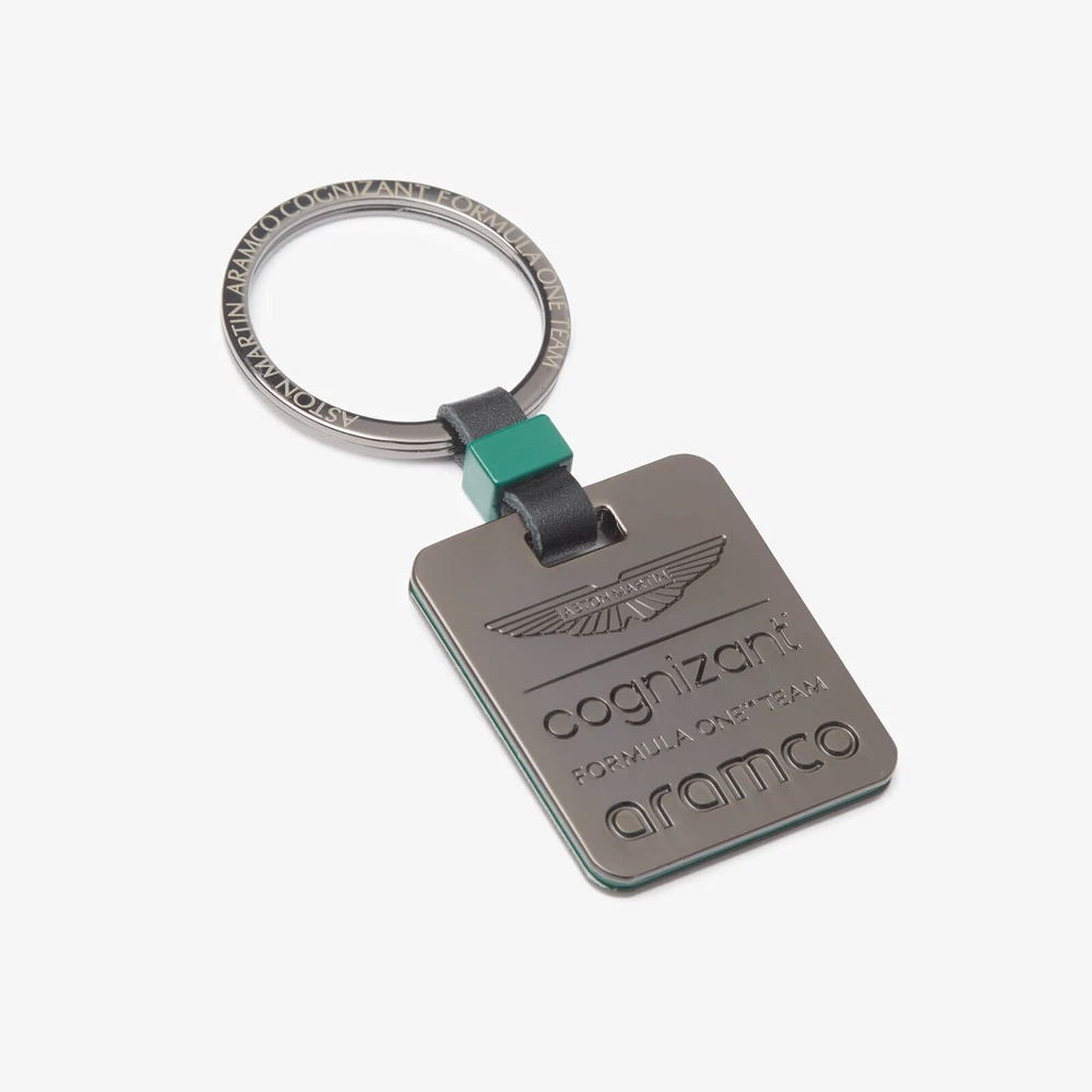 Introducing the Aston Martin Aramco Cognizant Formula One Team Official branded Square Keyring. With a gunmetal finish the AMF1 Team logo on one side and the team name laser etched onto the ring, this keyring is a great piece to add to your set.