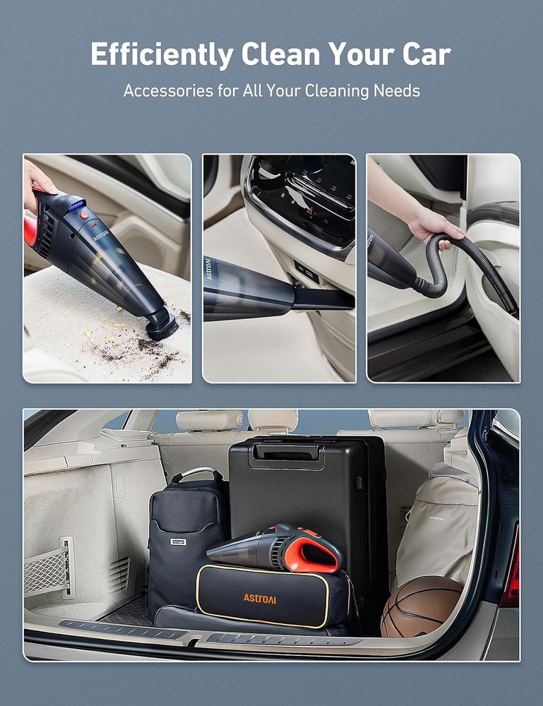 AstroAI Car Vacuum, Accessories, Portable Handheld Vacuum Cleaner Red Product Details Brand: AstroAI Special Feature: Corded Filter Type: Cloth Included Components: Vacuum cleaner, Brush head, Extension tube, Filter brush, Power cord, 3* Filters, Storage bag, Flathead hose Vacuum cleaner, Brush head, Extension tube, Filter brush, Power cord, 3* Filters, Storage bag, Flathead hoseVacuum cleaner, Brush head, Extension tube, Filter brush, Power cord, 3* Filters, Storage bag, Flathead hose See more Is Cordless?: No Surface RecommendationPower Source: Car12V Cigarette Lighter Cord VoltageItem Weight: 12 Volts (DC)1.2 Kilograms Daily Cleaning for Car: A strong motor and upgraded aluminum fan blades deliver 7500PA of suction power. The car vacuum cleaner is designed to quickly clean dry debris on level surfaces; say goodbye to dust and dirt. Coupled with a high-capacity 560ML visible dust cup, the car vacuum can easily clean up lots of dirt and dust. NOTE: The cigarette lighter cord only suitable for DC power of vehicle, please work with converter when connecting to AC power! Super Wide-Angle LED Light: Super wide-angle light provides a clear view, users can easily clean the hairs, crumbs, dust, and waste in the dark, even the dim corners in the seat bottom. The LED light will light up in blue when the power is supplied to remind you of the vacuum cleaners' power status. Washable Filter: The filters and dust cup are washable. Extra 2 filters are attached, easy to replace and clean. Please do not wash the body. Adequate Accessories: Four in one, extra different 3 nozzles to meet various cleaning demands. A 5-meter power cord easily reaches hard-to-clean narrow gaps. Compact Design: Light weight(2.7 pounds), ergonomic design allows you to operate easily with handhold. The storage bag provides full protection for the car vacuum cleaner.