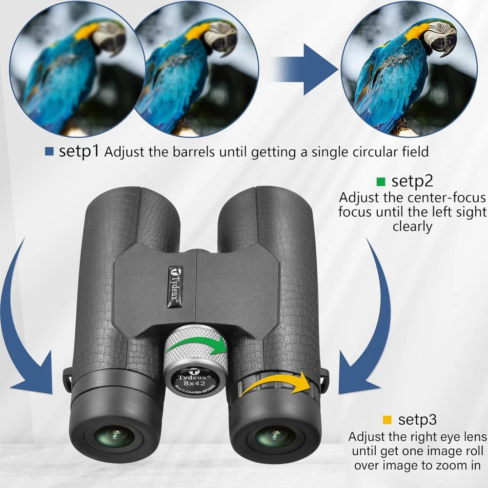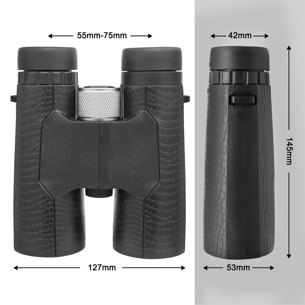 High Powered Large Eyepiece Binoculars: This binoculars has 10 x magnification; 42 mm objective lens and wide field of view 288 ft 1000 yds; letting you look farther and see wider Coating with premium BAK7 prism; it ensure imaging verisimilar Adjustable Eye Cups: The binocs can be pull down the rubber eyepieces and more fit the glasses wearer; getting close to lens and see easily; for those who do not wear glasses; will gain more focused slight and feel more easeful through rising eye cups Resistant Comfortable Touch: The rubber armor ergonomic design and steady grip allows for accurate focusing and have shock-resistance; antiskid features; rugged construction rubber eye relief provides comfort for spectacle wearers Portable Compact Binoculars Design: One hand can be mastered when you use the birding binoculars for opera bird watching camping traveling wildlife watching football game cruise or other outside activity Good Gifts: These binoculars are fully competent and able to work for bird watching; hunting hiking travel sports events theater and concert. also ideal great gifts