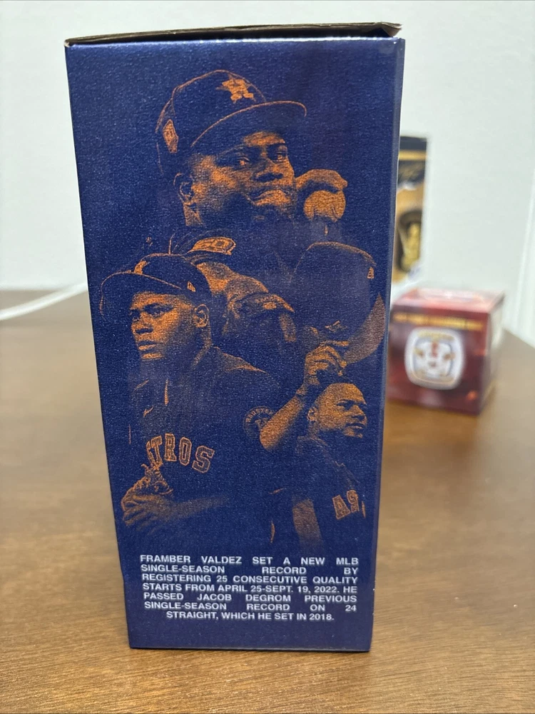 Astros memorabilia lot including 2022 World Series ring replica (Chas McCormick), Justin Verlander 2019 Cy Young bobblehead, and Framber Valdez 2022 Quality Start bobblehead. All packages are unopened and in original packaging.
