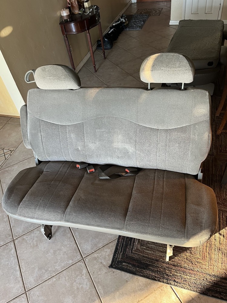 Features: Adjustable Headrest Material: Vinyl Placement on Vehicle: Third Row Color: Gray Brand: Chevrolet Headrest Type: Detachable Seat Type: Full Set