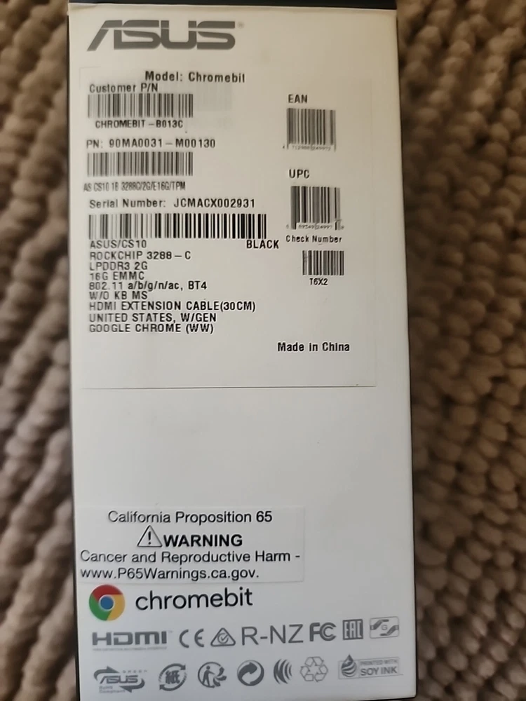 Brand new and never been used!! The original box was opened. All protective plastic in box. Instructions included. We bought it and never used it! The Asus Chromebit CS10 is a compact PC Stick that runs on Chrome OS. It features a small form factor design with integrated graphics, 2GB of RAM, and 16GB of eMMC storage. Connectivity options include Mini-USB, HDMI, USB 3.0, and USB 2.0 ports for versatile use. The Chromebit CS10 also comes with built-in Bluetooth and Wi-Fi adapters for wireless connectivity. This device is ideal for users looking for a portable computing solution with the convenience of Chrome OS.
